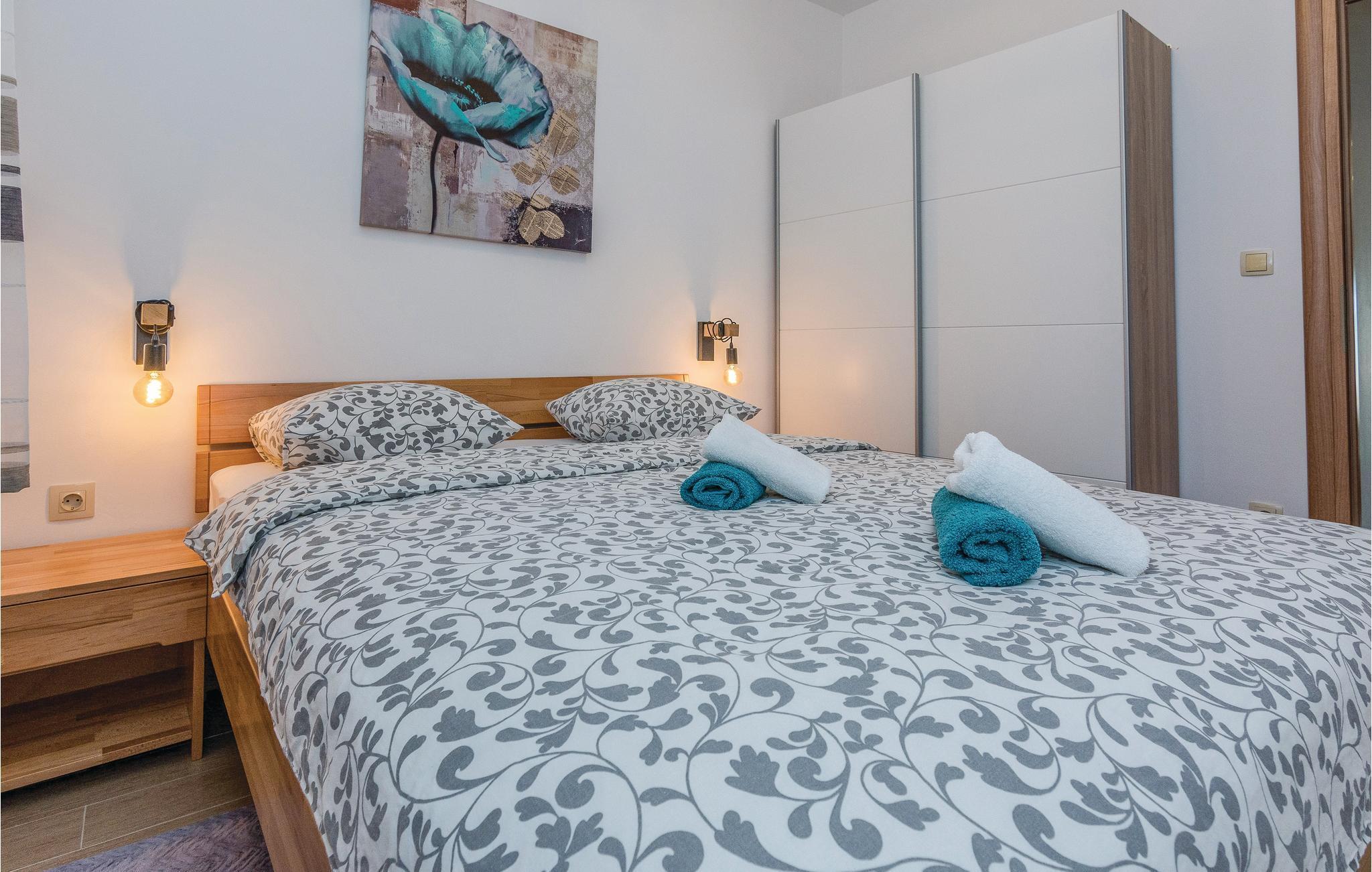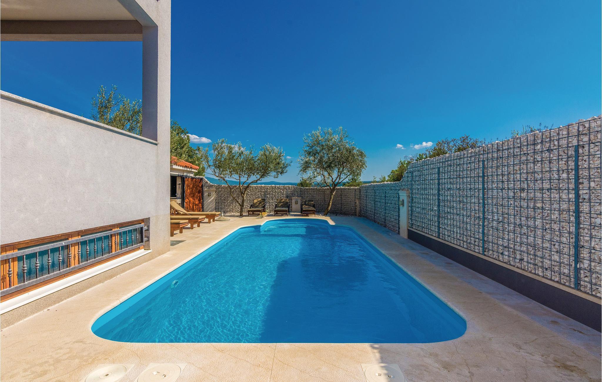 Modernes Ferienhaus mit Swimmingpool und schöner Aussicht auf die grüne Landschaft und das Meer. Ein ideales Reiseziel für Familien und Freunde, dess das Domizil besteht aus drei separaten Wohnungen. Im Erdgeschoss ist eine Wohnung mit vier Schlafzimmern, während im Obergeschoss zwei Wohnungen mit jeweils zwei Schlafzimmern sind. Die Etagen werden nur über Außentreppen erreicht, die Dachschrägen können auf 180 cm reichen. Von den Terrassen im Obergeschoss bietet sich ein Panoramablick auf das Meer, während im Erdgeschossbereich der Pool mit Sonnenliegen, Grill und eine überdachte Terrasse zum Relaxen vorhanden sind. Im Keller, welcher über eine Außentreppe zugänglich ist, befindet sich ein Billiardtisch, außerdem gibt es einen Whirlpool. Machen Sie einen sportlichen Ausflug, Unternehmen Sie z. B. Rafting auf dem Fluss Zrmanja oder eine Safari ins Velebit-Gebirge.