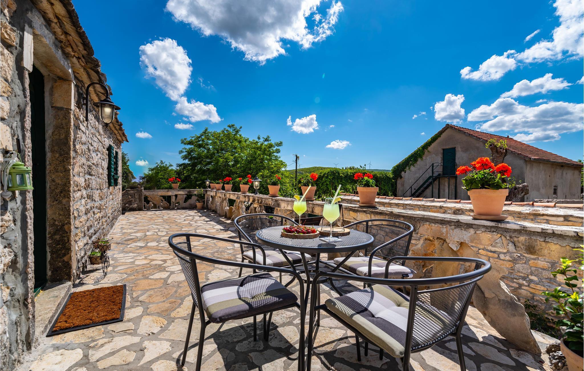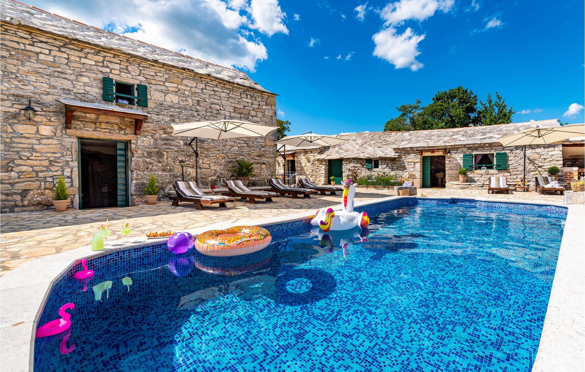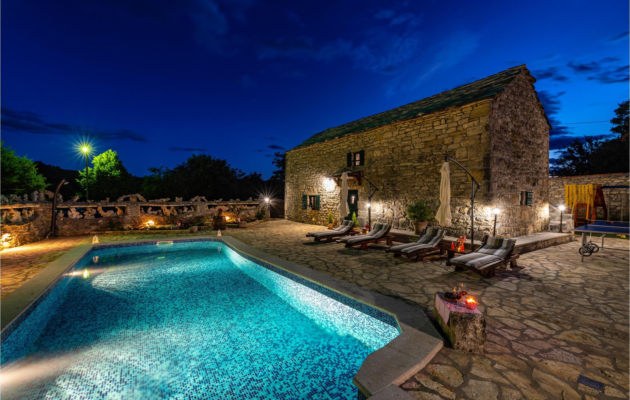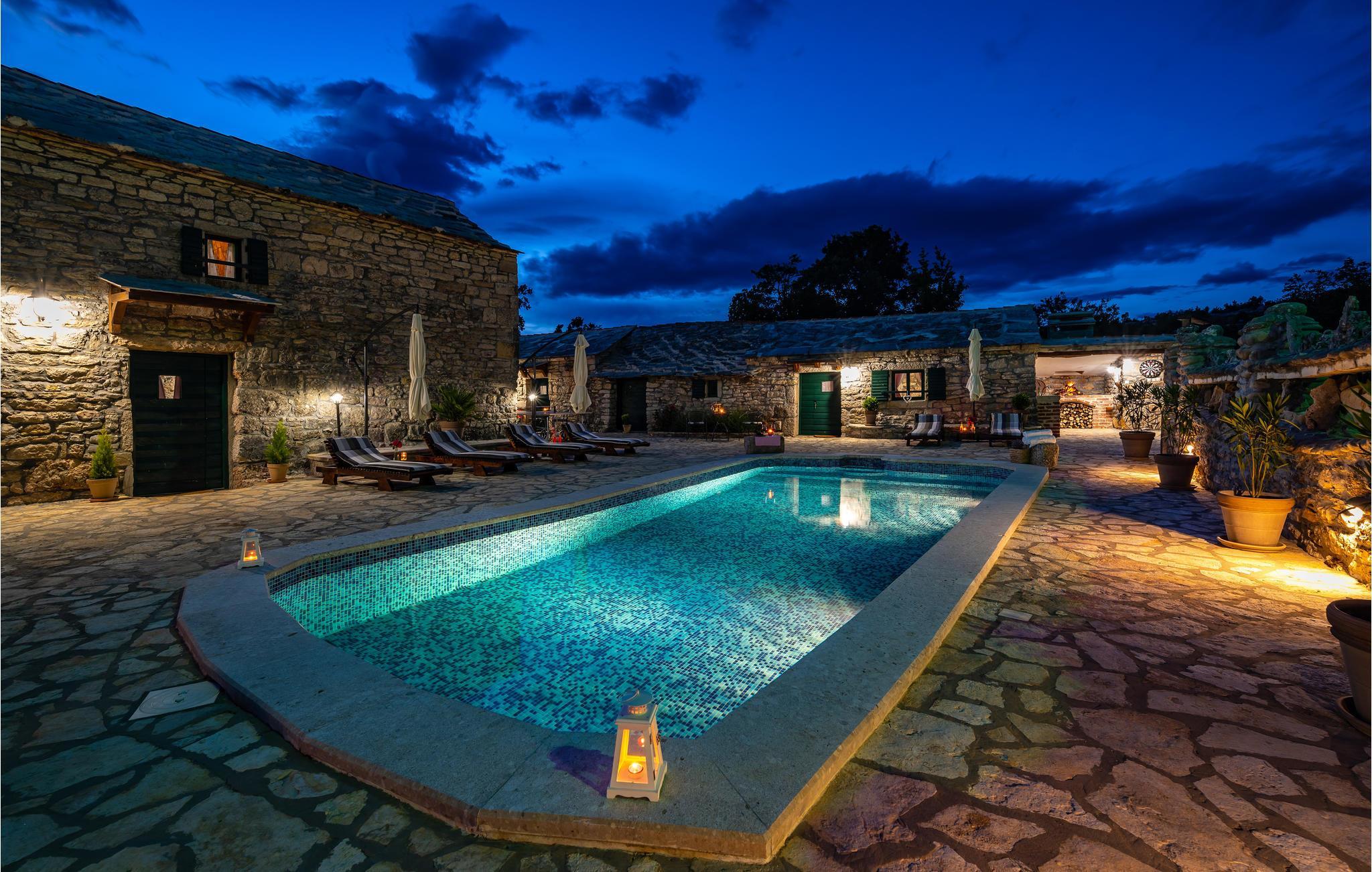 Dieses funktionelle Ferienhaus mit eigenem Pool ist aus dem Jahre 1951 und befindet sich in der kleinen Ortschaft Zelengrad, nicht weit von Obrovac entfernt. Es wurde 2019 teilweise renoviert und bietet gute Voraussetzungen für einen angenehmen Aufenthalt mit einer funktionellen Einrichtung. Das Feriendomizil besteht aus drei separaten Objekten mit einer Wohnfläche von insgesamt 139 m². Im Erdgeschoß des ersten Objekts ist die Küche mit Essbereich und zwei WCs. Im Obergeschoß sind Schlafzimmer, Bad, Wohnzimmer mit Essbereich und Küche. Im zweiten und dritten Objekt sind jeweils ein Schlafzimmer, Bad und Küche mit Essbereich. Die Außenanlage ist ein privates, eingezäuntes Grundstück und beinhaltet Kinderspiele und etwa 10 m vom Haus entfernt befindet sich auf dem Sie eine Boccia-Bahn, Badminton-Netz und kleine Fußballtore.