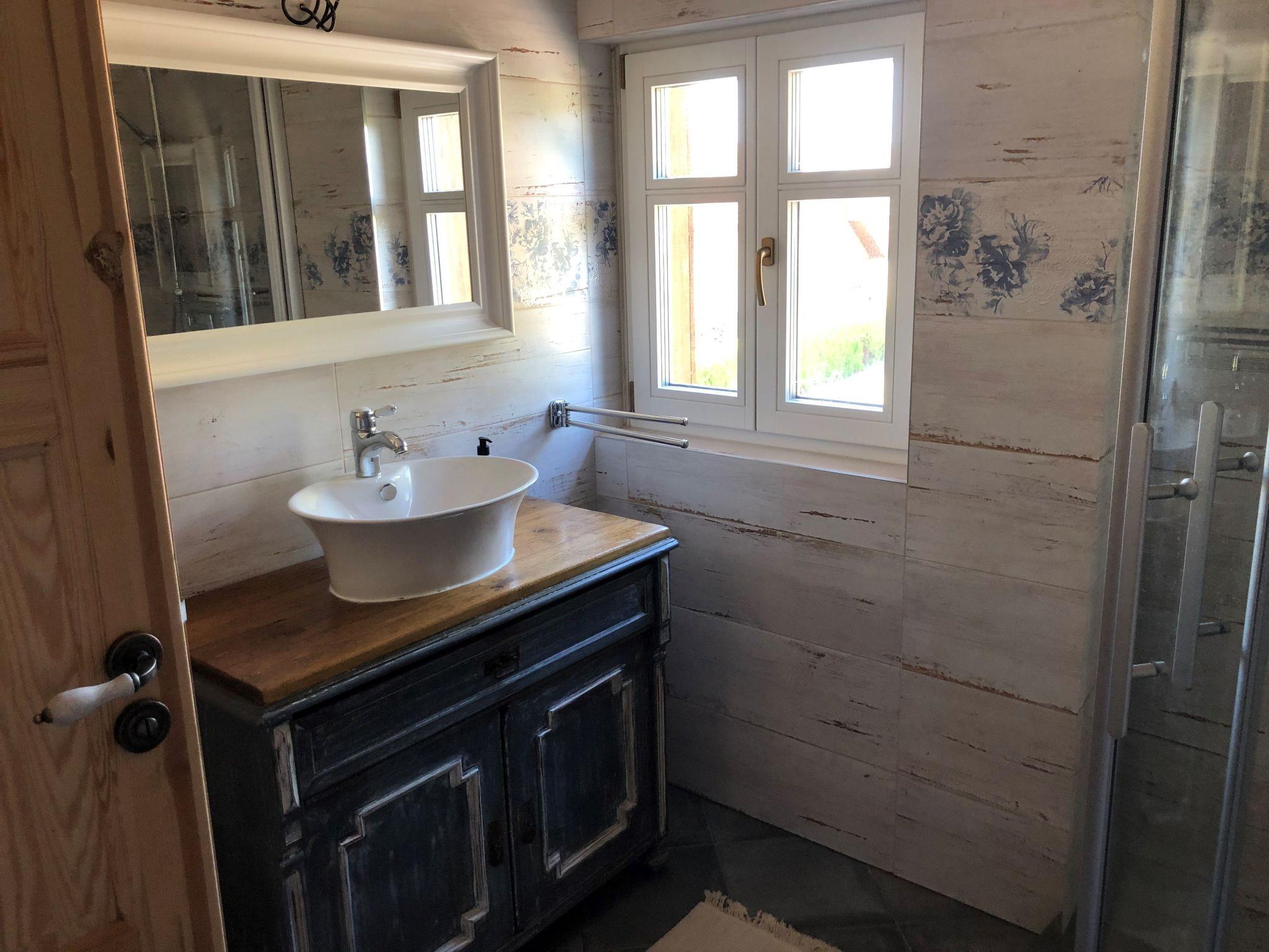 The ground floor apartment (nr. 1) has the entrance hall, bathroom with walk-in shower and a toilette, kitchen 16 sqm, living room with a sleeping sofa 14 sqm and a fire place, and two bedrooms with individual entrances, each approx. 9 sqm. One bedroom has two 80cm beds that can be put together or used as single beds, and the second bedroom has an Ikea guest bed and an elevated bed, perfect for children.