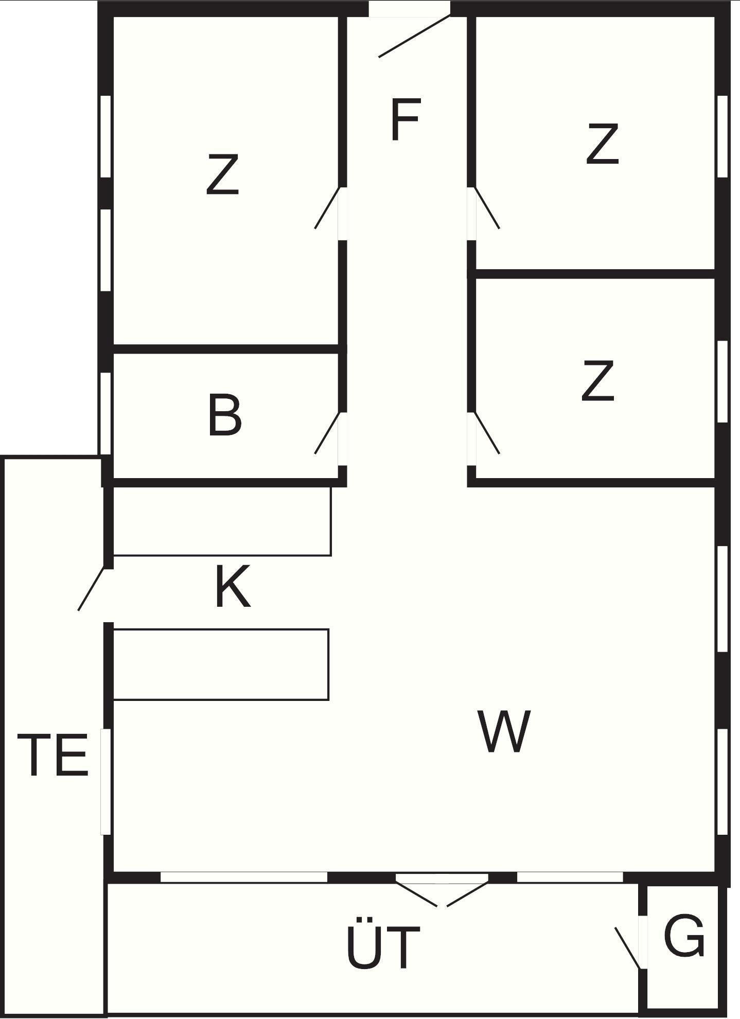 Off. Küche: E-Herd, Kühlschr. m. Gefrierfach, Mikrow., Abzugsh., Kaffeem., Spülm.