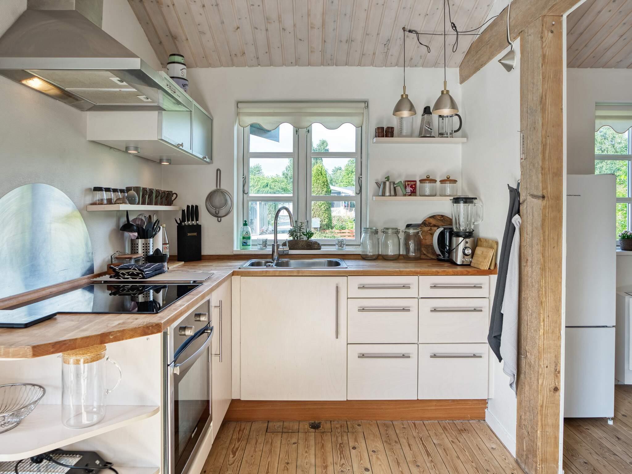 Gemütliches Ferienhaus in Asserbo mit praktischer Raumaufteilung und einladender Atmosphäre. Die offene Küche mit Cerankochfeld, Dunstabzugshaube, Backofen, Mikrowelle, Kühl-/Gefrierkombination und Kaffeemaschine erleichtert die Zubereitung von Mahlzeiten während Ihres Aufenthalts. Das Wohnzimmer ist mit einem Holzofen für gemütliche Abende, einer energieeffizienten Luft-Luft-Wärmepumpe, Fernseher und Internetzugang ausgestattet.