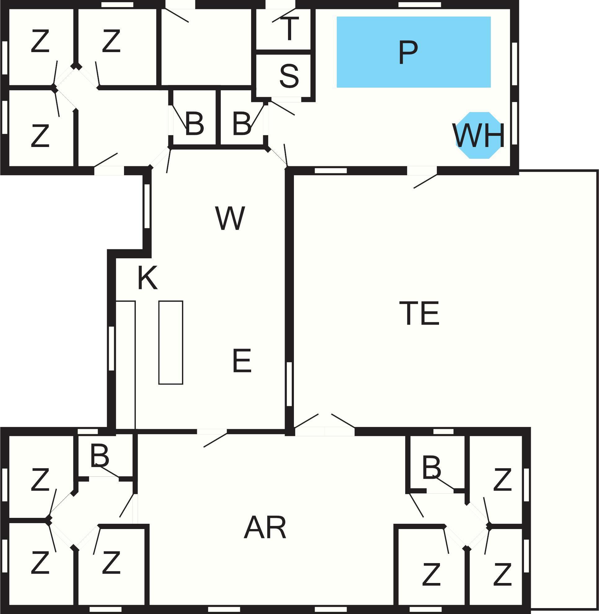 Dieses Pool- und Aktivitäts-Ferienhaus liegt in einem landschaftlich attraktiven Gebiet. Es ist modern eingerichtet, sehr geräumig und hat eine gute Raumaufteilung mit drei separaten Schlafbereichen, zu denen jeweils ein Bad gehört. Ein weiteres Badezimmer befindet sich im Poolbereich. Neben den neun Schlafzimmern gibt es einen geräumigen Hems/Schlafboden. Der Wohn-Essbereich ist geschmackvoll eingerichtet und verfügt u.a. über Stereoanlage mit CD-Spieler, Fernseher, DVD-Spieler, Hochstuhl, Sofabereich und Holzofen.