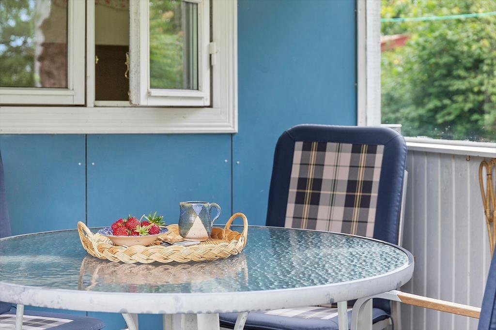 Im Inneren des Hauses erwartet dich eine einfache, wohnliche Einrichtung, die an den ursprünglichen Ferienhausstil erinnert – im allerbesten Sinne. Das Wohnzimmer vereint sowohl Essbereich als auch Sofaecke, und überall wurde auf funktionale und entspannte Lösungen gesetzt. Die Küche ist klein, aber gut durchdacht – perfekt für klassische Ferienhausgerichte. Wenn du etwas mehr Platz zum Arbeiten brauchst, kannst du Gemüse oder frisch gefangenen Fisch draußen am kleinen Außenbereich direkt hinter dem Fenster vorbereiten – ein praktisches Detail, das die Essenszubereitung zum Erlebnis macht. Die Schlafplätze im Haus verteilen sich auf zwei Schlafzimmer: ein Schlafzimmer mit Doppelbett und direktem Zugang zur Terrasse sowie ein kleines Zimmer mit kurzen Etagenbetten – ideal für Kinder. Zusätzlich gibt es ein separates kleines Gästehaus mit zwei Einzelbetten – perfekt für Teenager oder Gäste, die ein wenig Privatsphäre wünschen.
