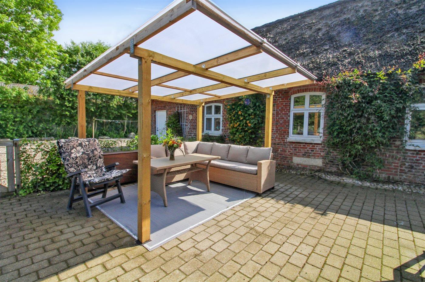 The holiday home is situated on a 3000 m² garden site. Situated 600 m from the sea. Nearest shop is 3500 m away. A 100 m² terrace belong to the holiday home. Hereof a total of 30 m² enclosed terrace. You find a tool shed. Swing. Trampoline. Seesaw. Petanque. Football goal. 2 barbecues at your disposal. Plug for charging electric car is available. Parking place by the holiday home.