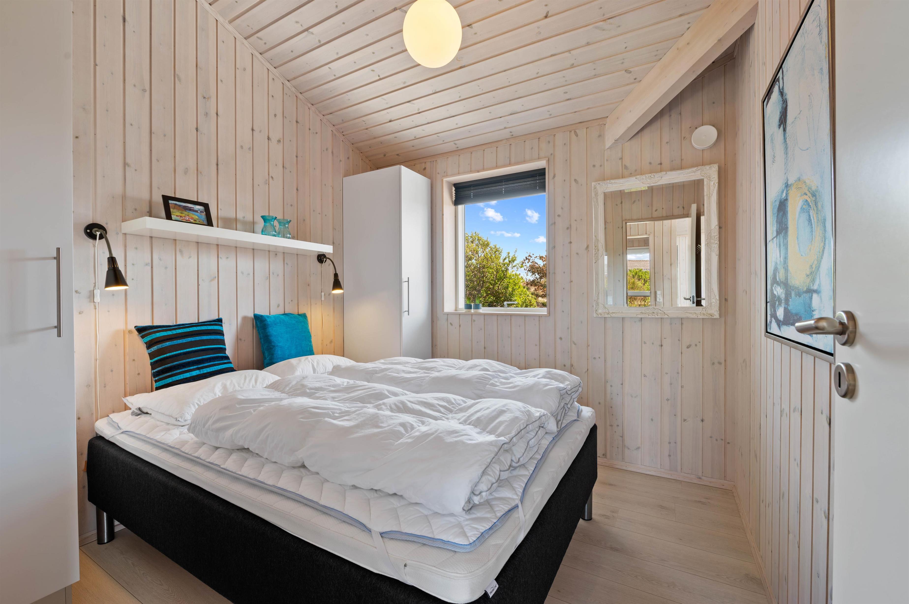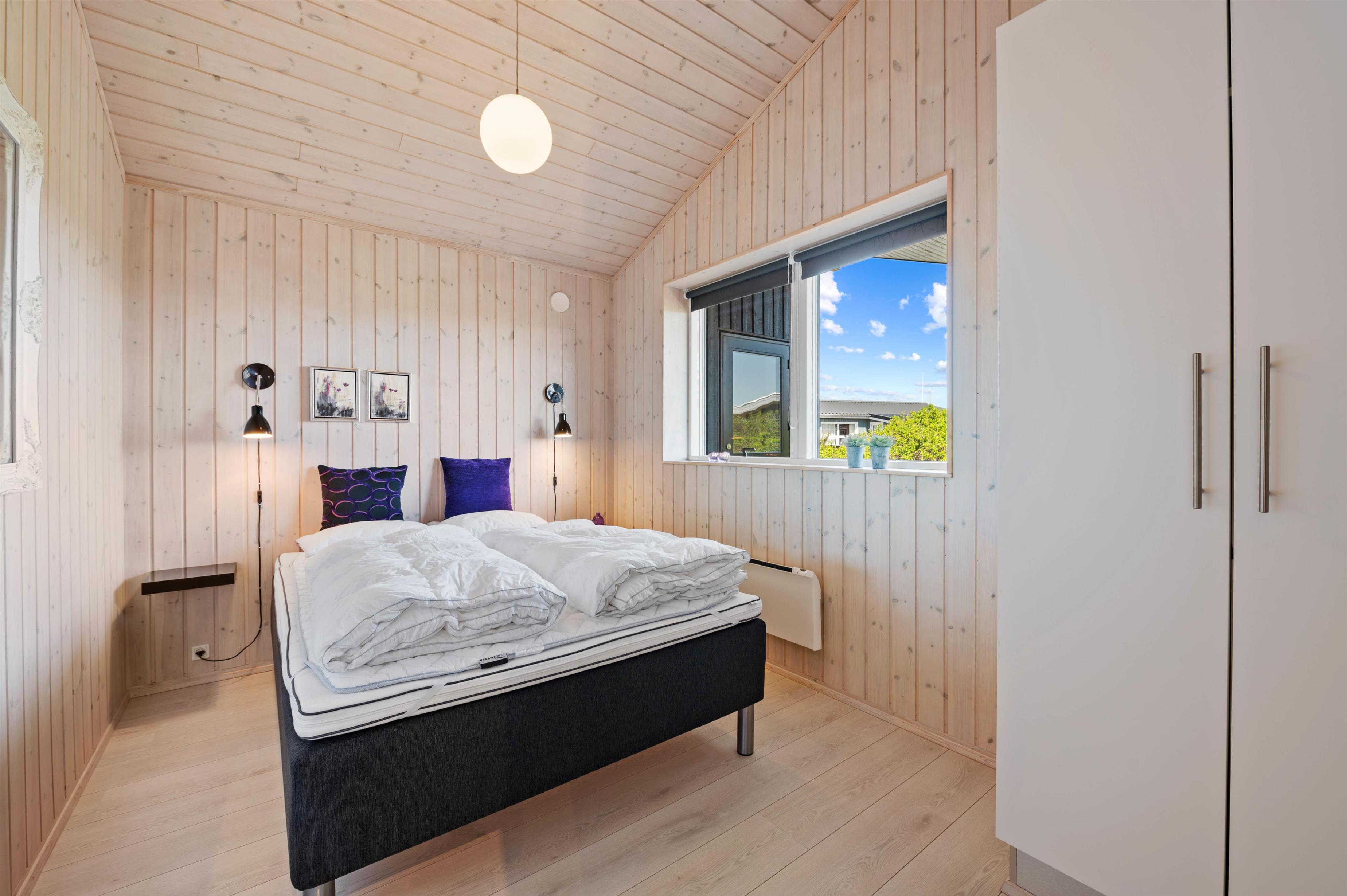 The holiday home accommodates up to 8 people, with two bedrooms with double beds, one bedroom with twin beds, and two sleeping spaces in the living room's sleeping nook. There are two lovely bathrooms with shower and underfloor heating, plus a sauna with two benches. The open-plan kitchen is equipped with a fridge/freezer, dishwasher, ceramic hob and microwave.