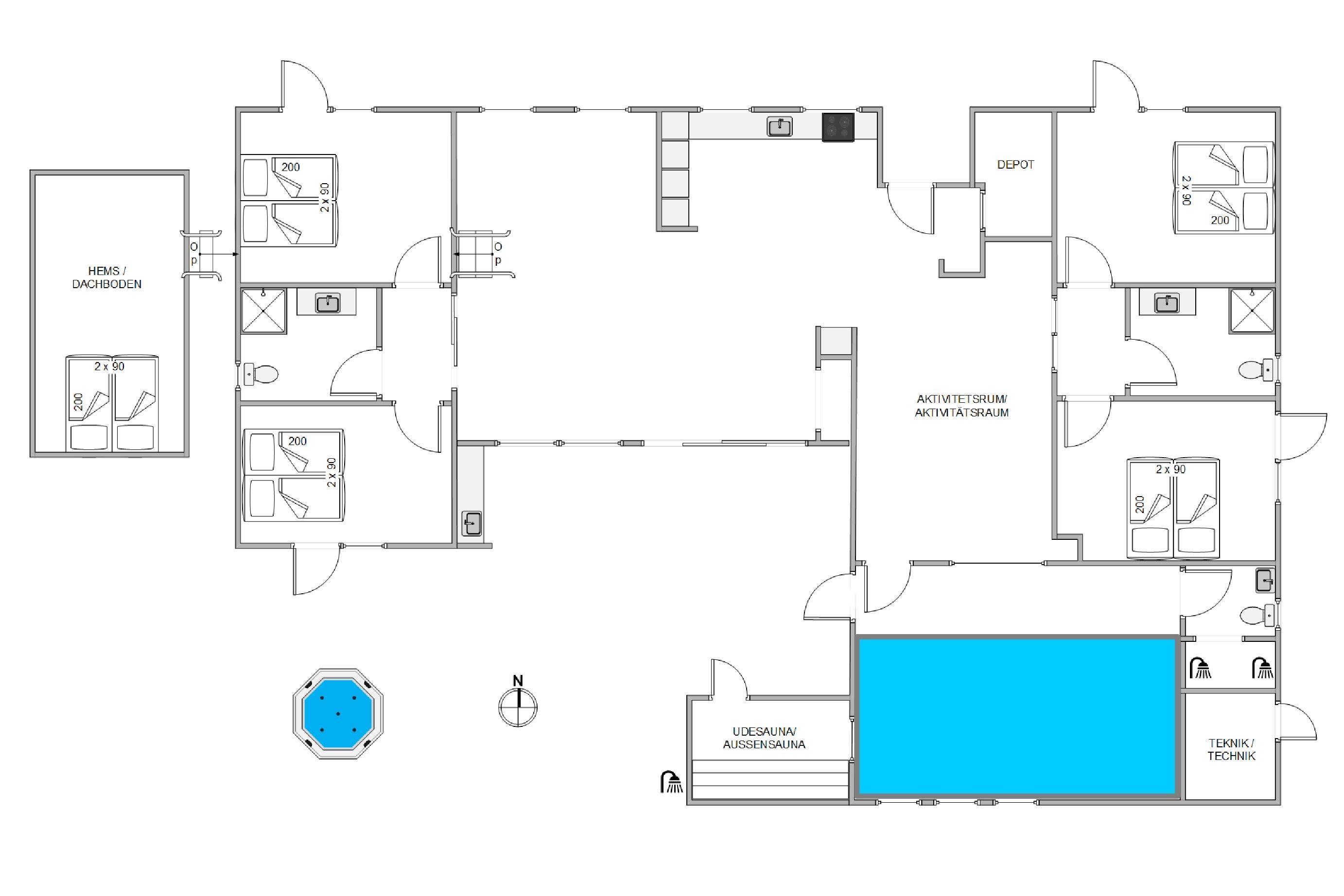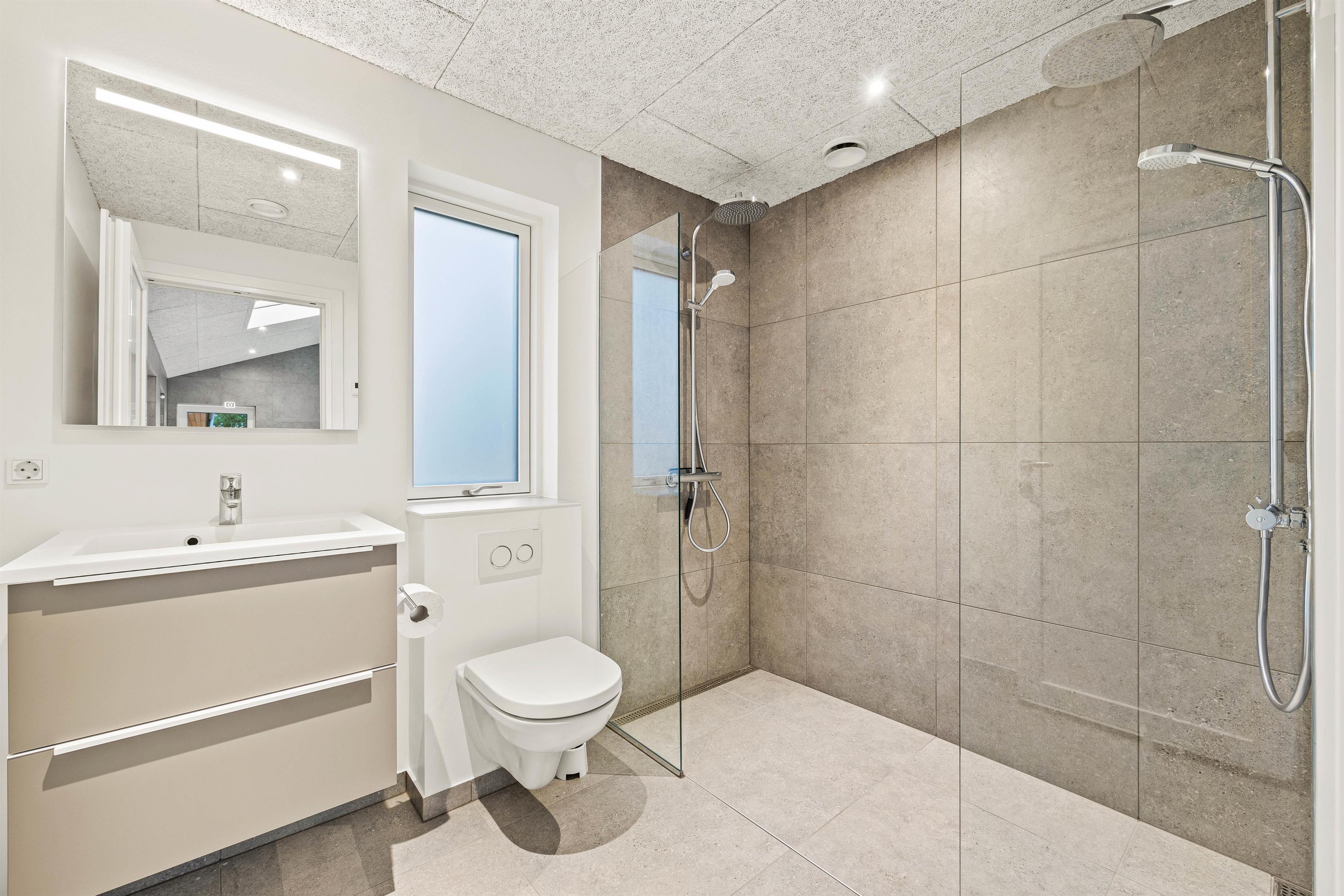 The holiday home features 4 comfortable bedrooms and a loft sleeping area for 2 people. With 3 bathrooms, there's never a morning queue. All bathrooms have underfloor heating for comfort. One bathroom is located by the pool room, while the other two are en-suite, each serving two bedrooms. This layout allows separate living areas when two families holiday together.