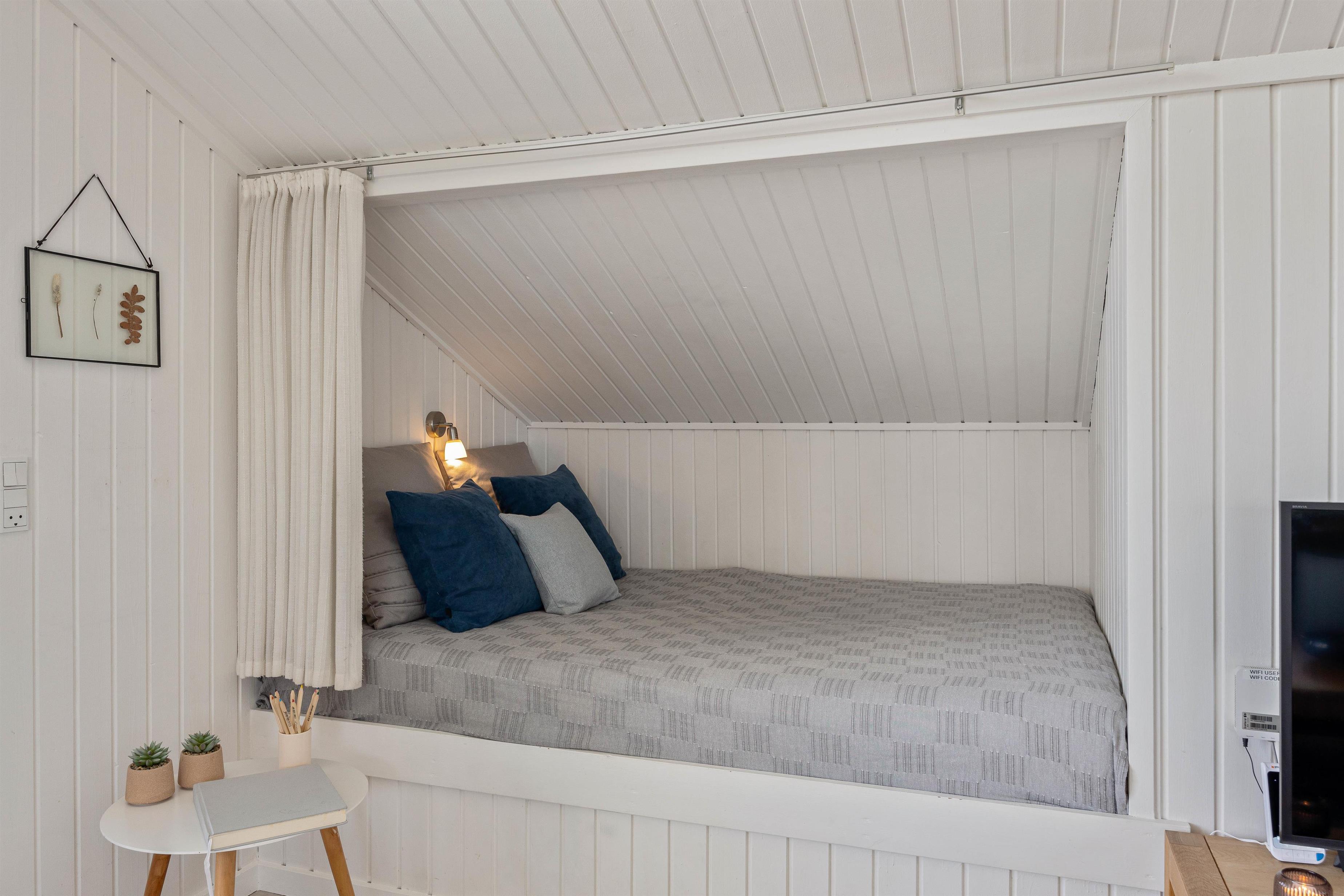In the living room, a cosy sleeping alcove houses 2 of the holiday home's beds. The remaining 4 beds are in the 2 bedrooms, one with 2 single beds and the other with a double bed.