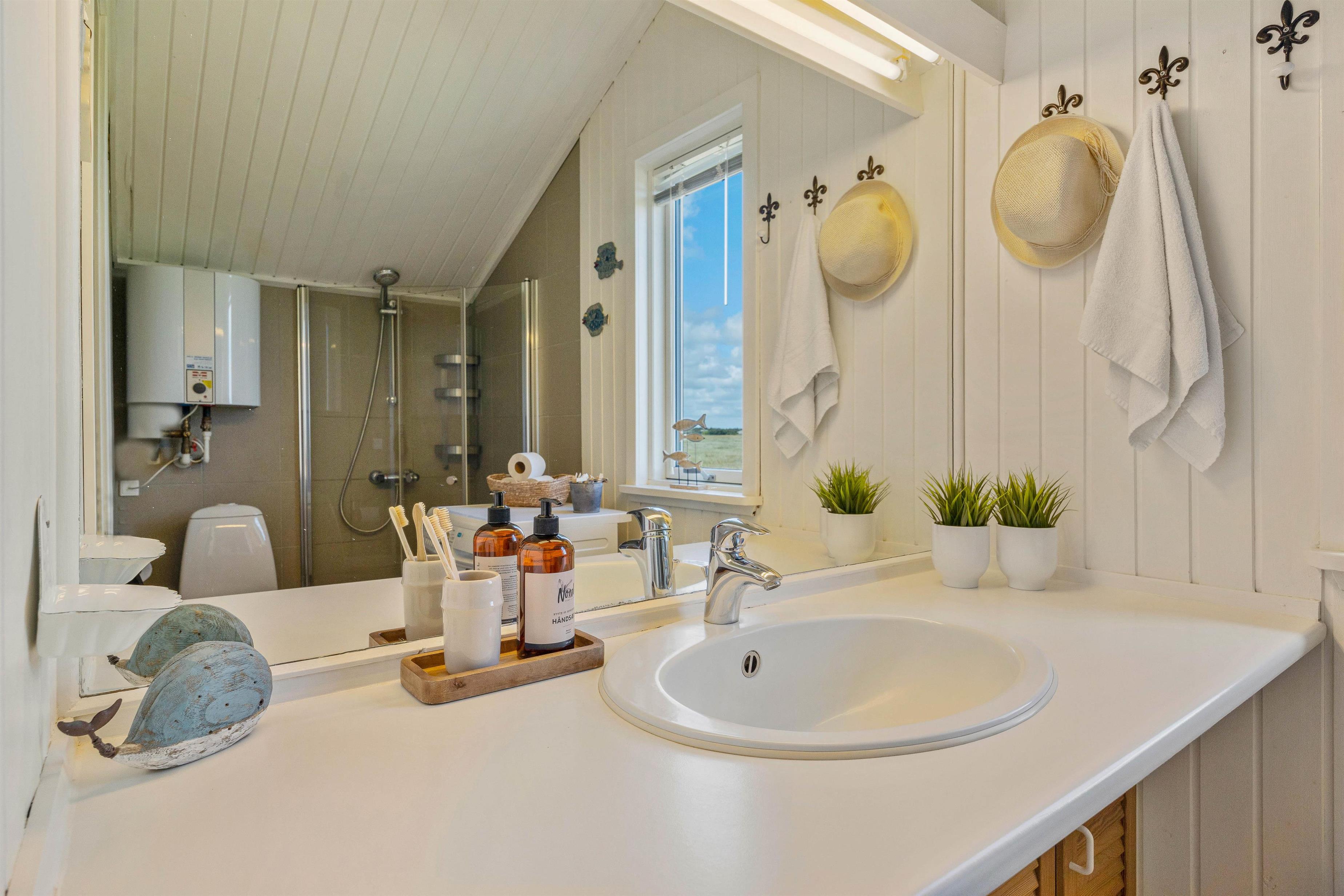 The bathroom features underfloor heating and a lovely sauna where you can unwind. It's particularly enjoyable to share a sauna session after a trip to the North Sea, just 25 metres from the holiday home.