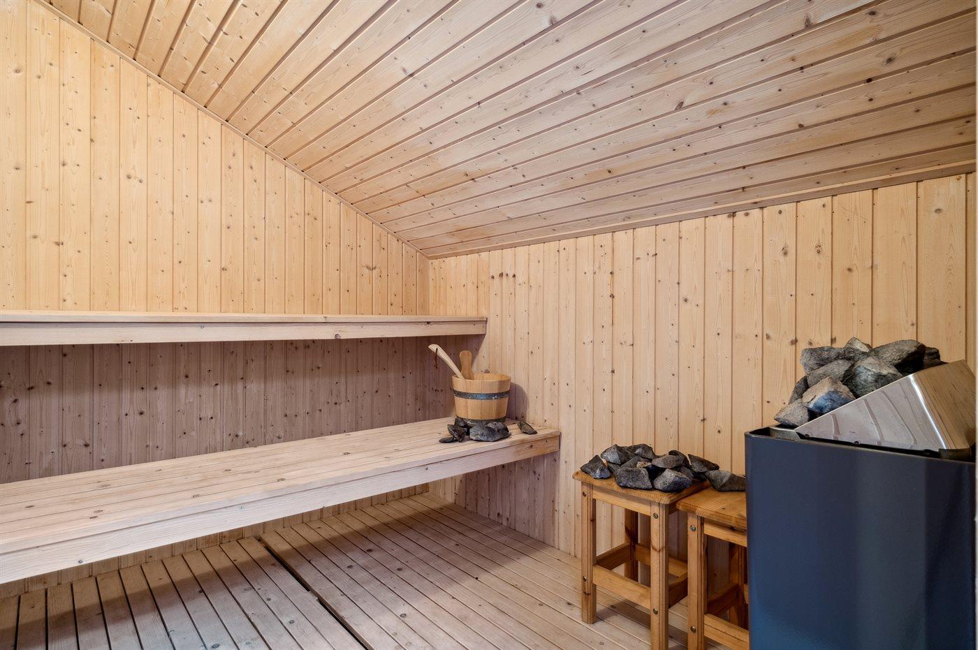 There are 2 bathrooms with shower cabinet and 2 toilets, hereof 1 guest bathroom. There is floor heating in 2 bathrooms. There is floor heating in the guest bathroom. The sauna offers opportunity for relaxation.