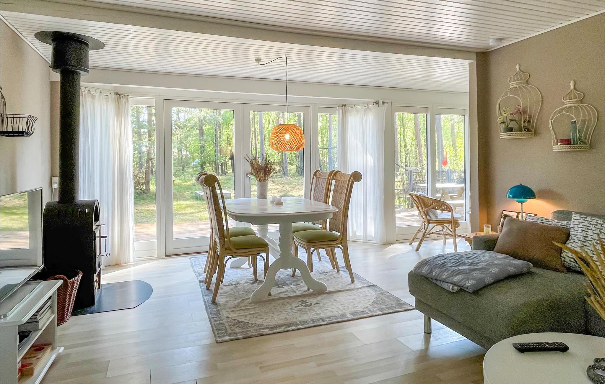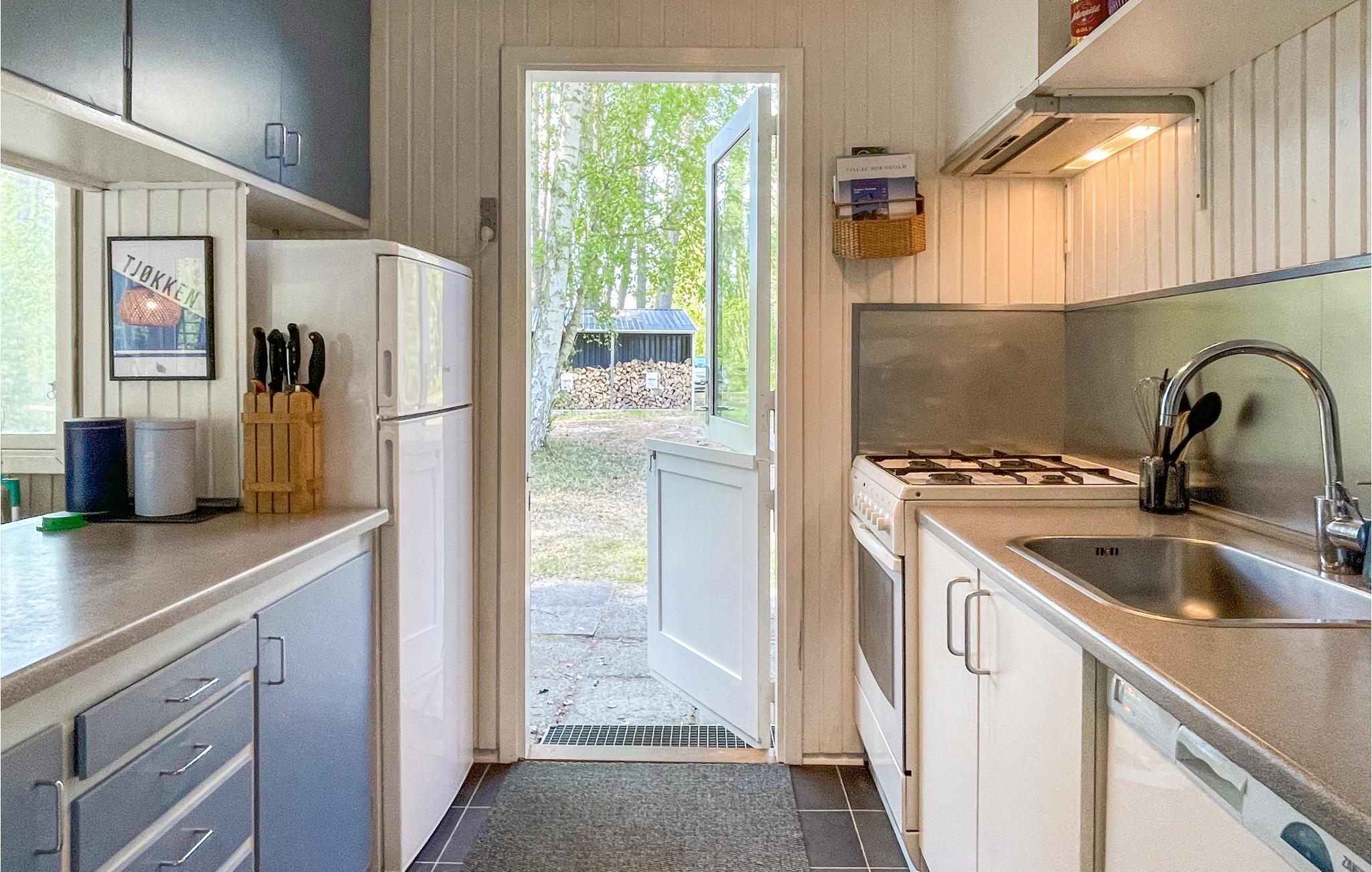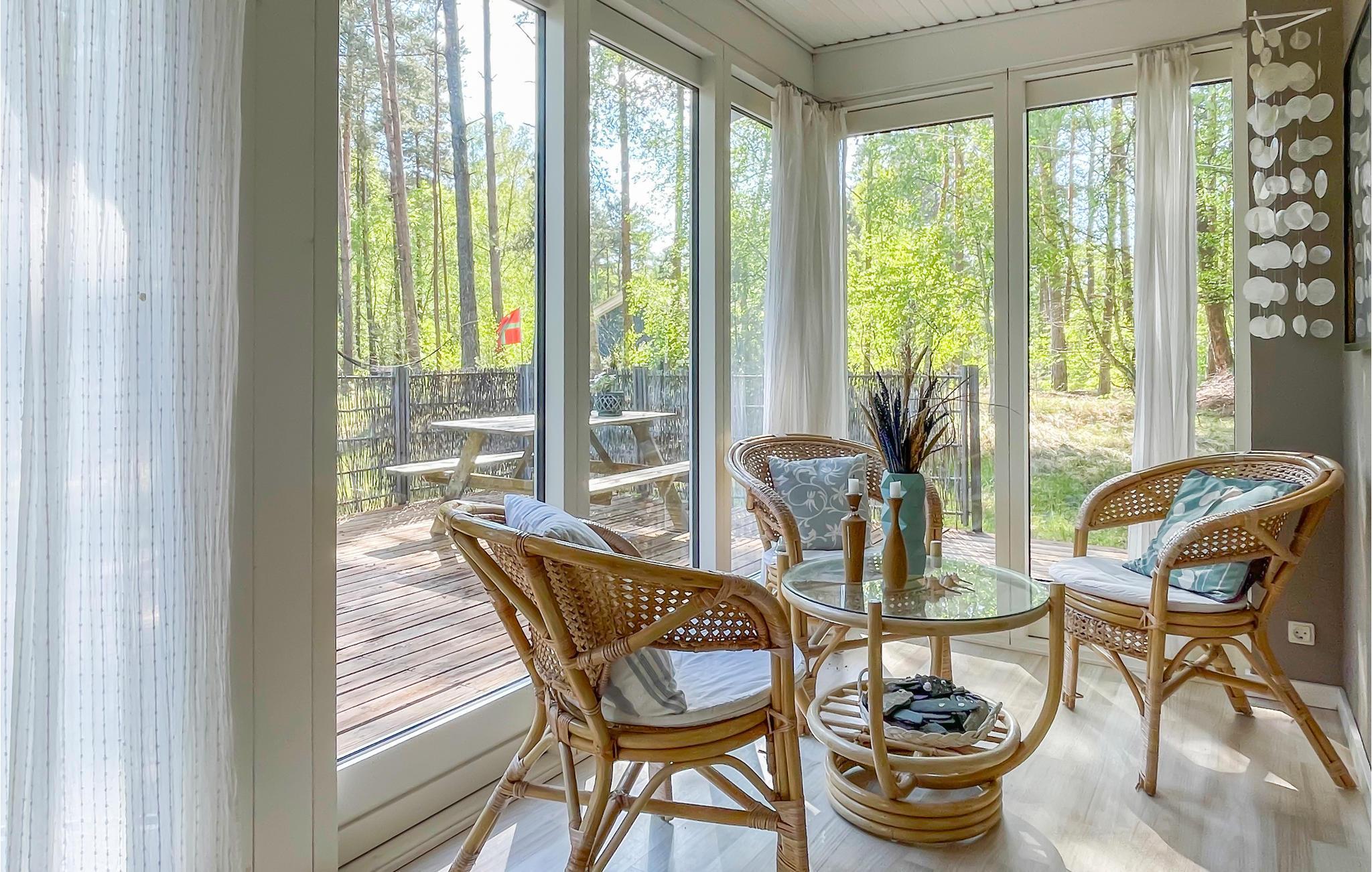 Willkommen in diesem geräumigen, hellen und geschmackvoll eingerichteten Ferienhaus. Sie werden viele gemütliche Stunden im Wohnzimmer verbringen, wo Sie mit Chromecast Filme und Serien auf den Fernseher streamen, Musik hören und an kühlen Tagen dem wärmenden, knisternden Feuer im Ofen lauschen. Hier finden Sie auch einen Essbereich und die charmante, offene Küche vor. Große Fenster lassen viel Licht herein und eröffnen den Blick auf die grüne Umgebung. Im Nebengebäude finden Sie eine Waschmaschine.