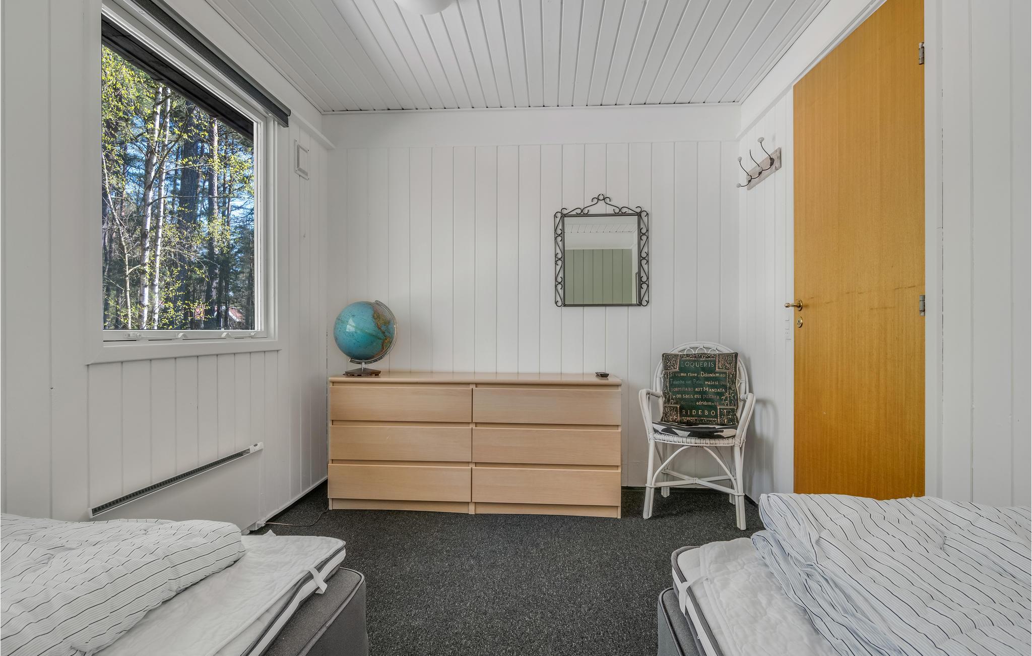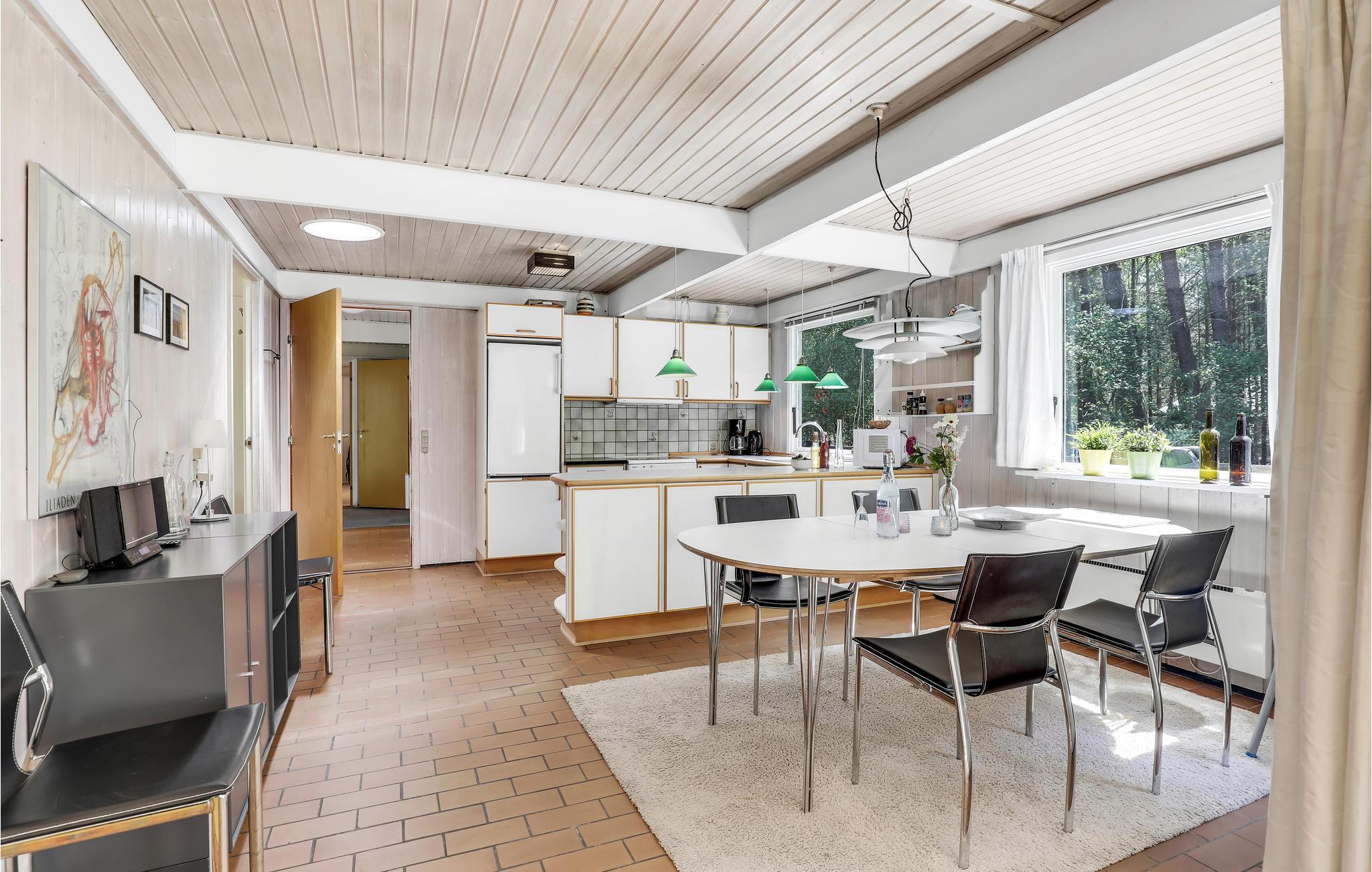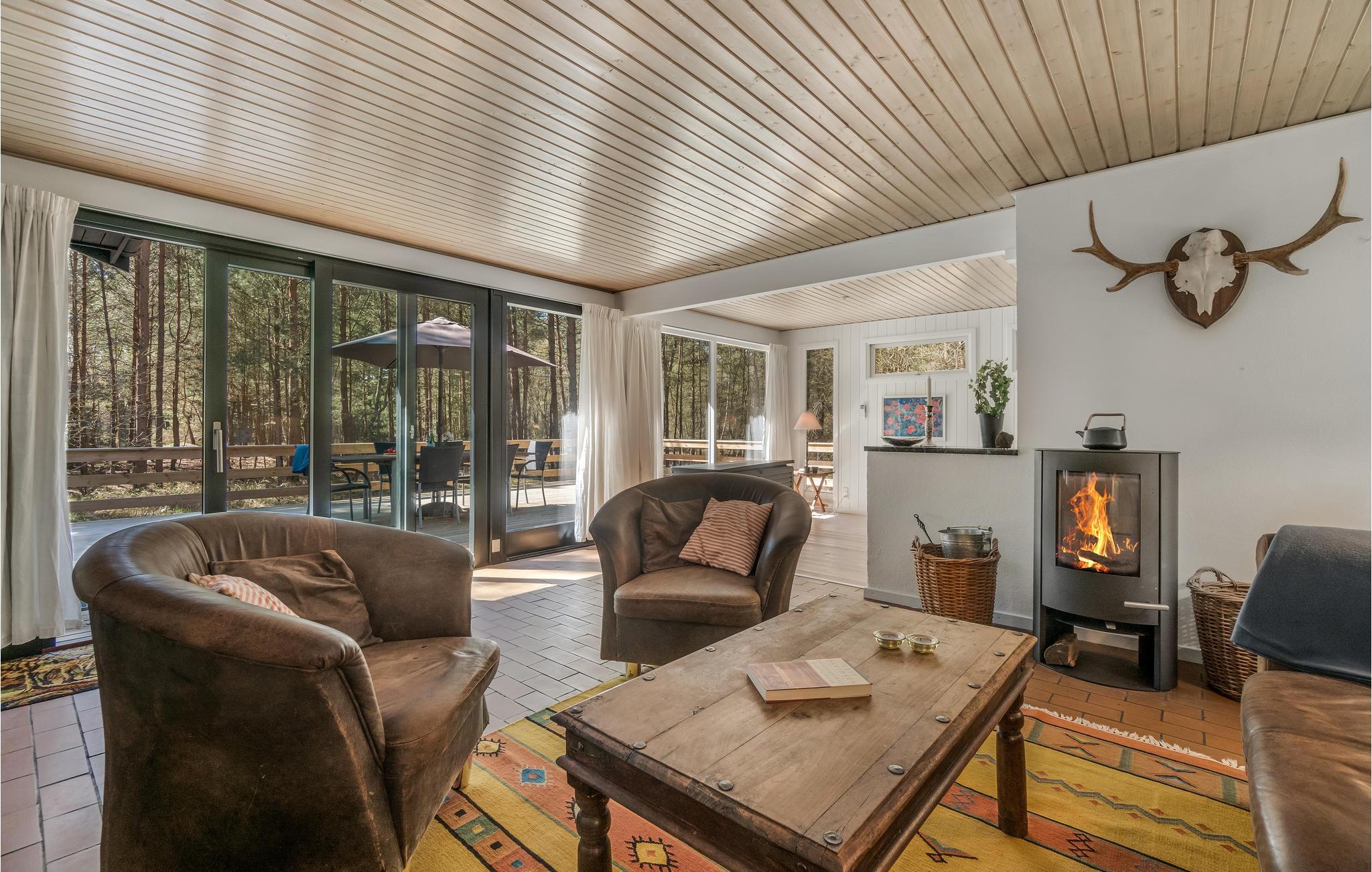 Im Wohnzimmer mit Holzofen können Sie es sich wunderbar bequem machen, fernsehen und Radio oder Musik hören. Direkt verbunden sind der Essbereich und die offene Küche. Außerdem bietet Ihnen das Haus drei heimelige Schlafzimmer und zwei Badezimmer - eines davon sogar mit Sauna für die absolute Entspannung. Sie haben für Ihren Haushalt außerdem eine Waschmaschine und einen Trockner zur Verfügung.