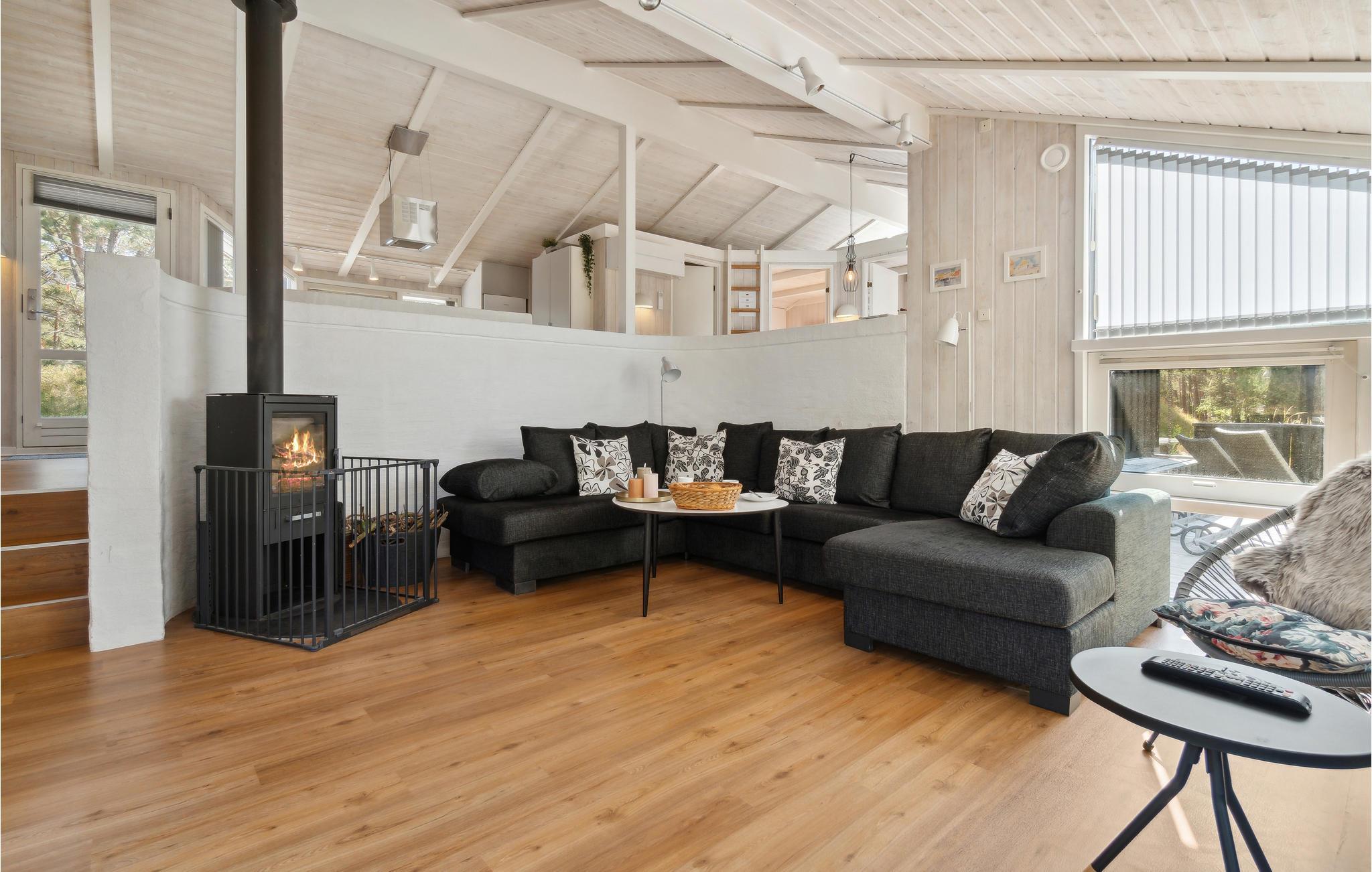 Verbringen Sie erholsame Tage in diesem einladenden Holzhaus, das Komfort und Gemütlichkeit vereint. Nur einen kurzen Spaziergang vom Meer entfernt genießen Sie hier eine entspannte Auszeit in stilvollem Ambiente – ideal für Familien und Paare, die Natur und Erholung suchen. Betreten Sie den großzügigen Wohnbereich mit Kaminofen, der eine warme Atmosphäre schafft. Machen Sie es sich auf dem Sofa gemütlich, schauen Sie einen Film oder genießen Sie einfach das Knistern des Feuers. Über ein paar Stufen erreichen Sie die offene, gut ausgestattete Küche, in der Sie gemeinsam kochen und essen können. Die Sauna des Hauses lädt zu wohltuenden Momenten der Ruhe ein.
