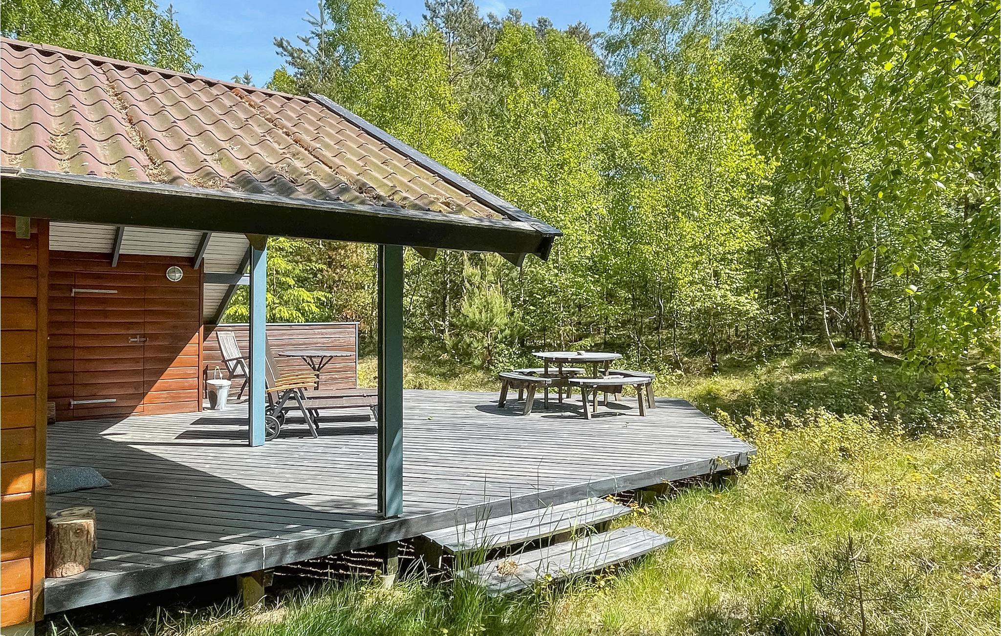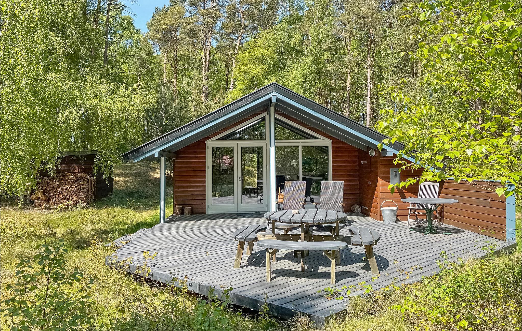 Schönes Holzferienhaus auf einem völlig ungestörten bewaldeten Naturgrundstück in der Nähe des schönen Sandstrandes von Dueodde.