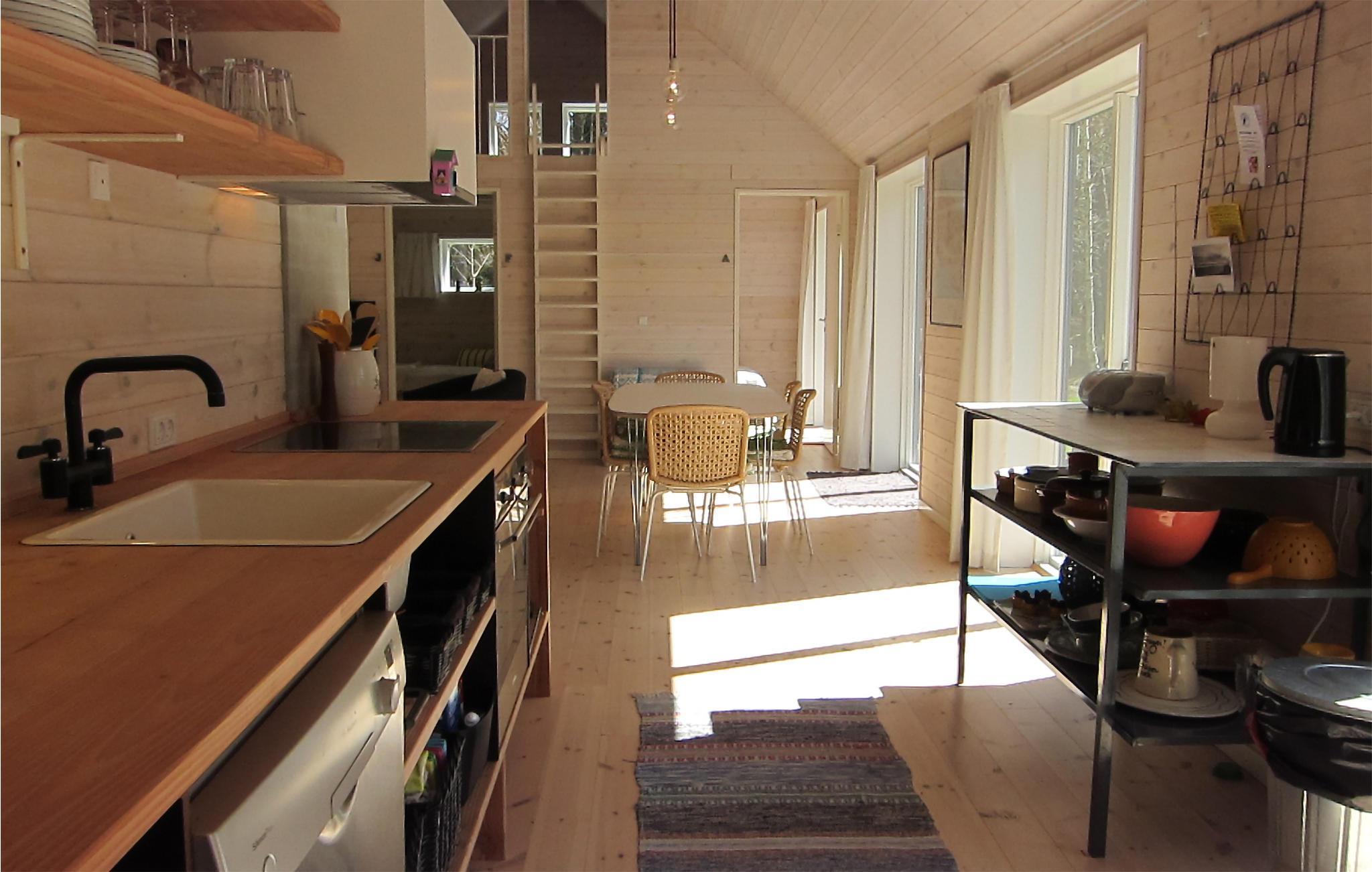 Das Wohnzimmer mit seiner hellen Decke und dem schönen Holzboden hält eine warme und heimelige Atmosphäre inne. Hier können Sie in der offenen Küche kochen, während im warmen Kamin das Feuer prasselt und die Kinder am Tisch Karten spielen.