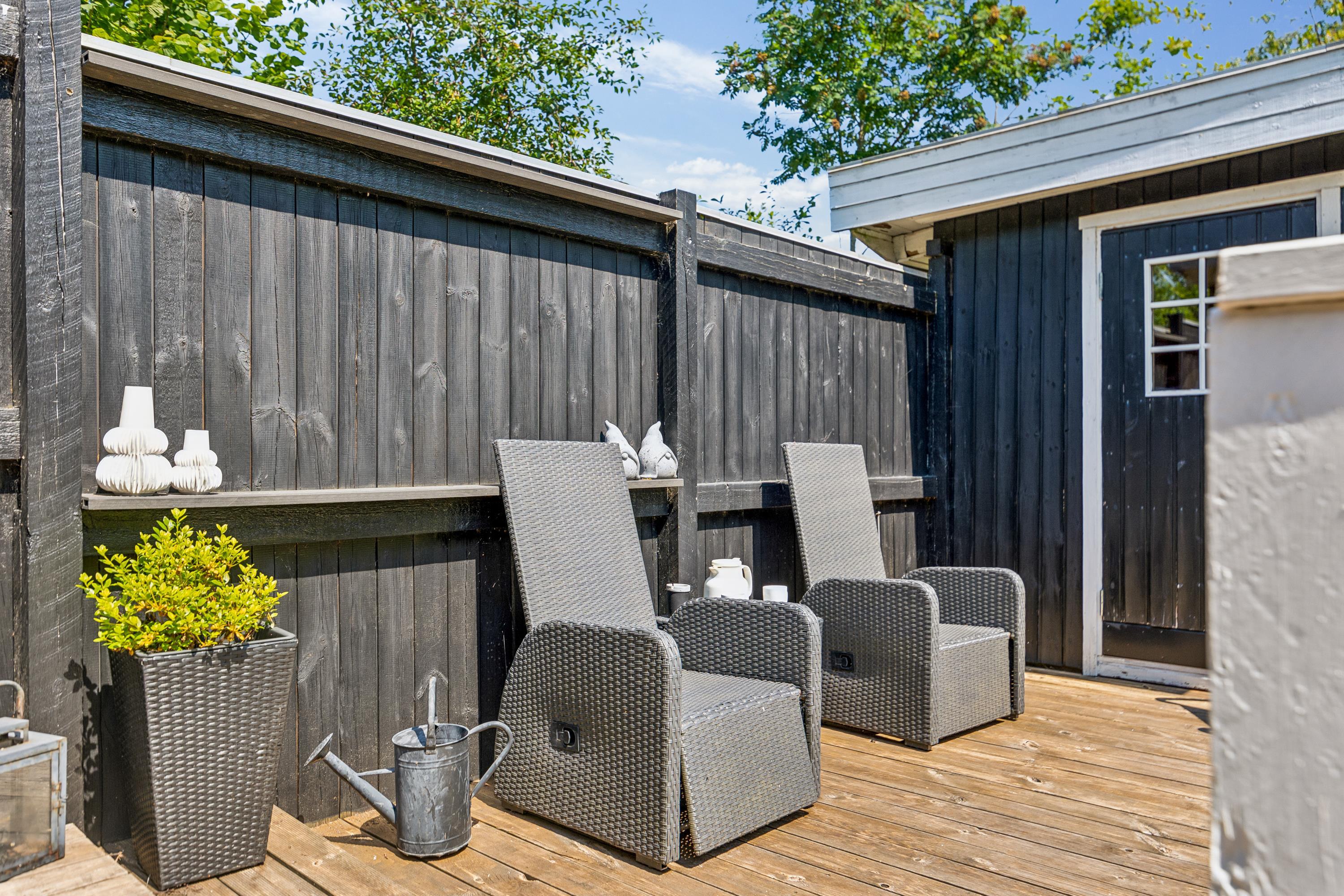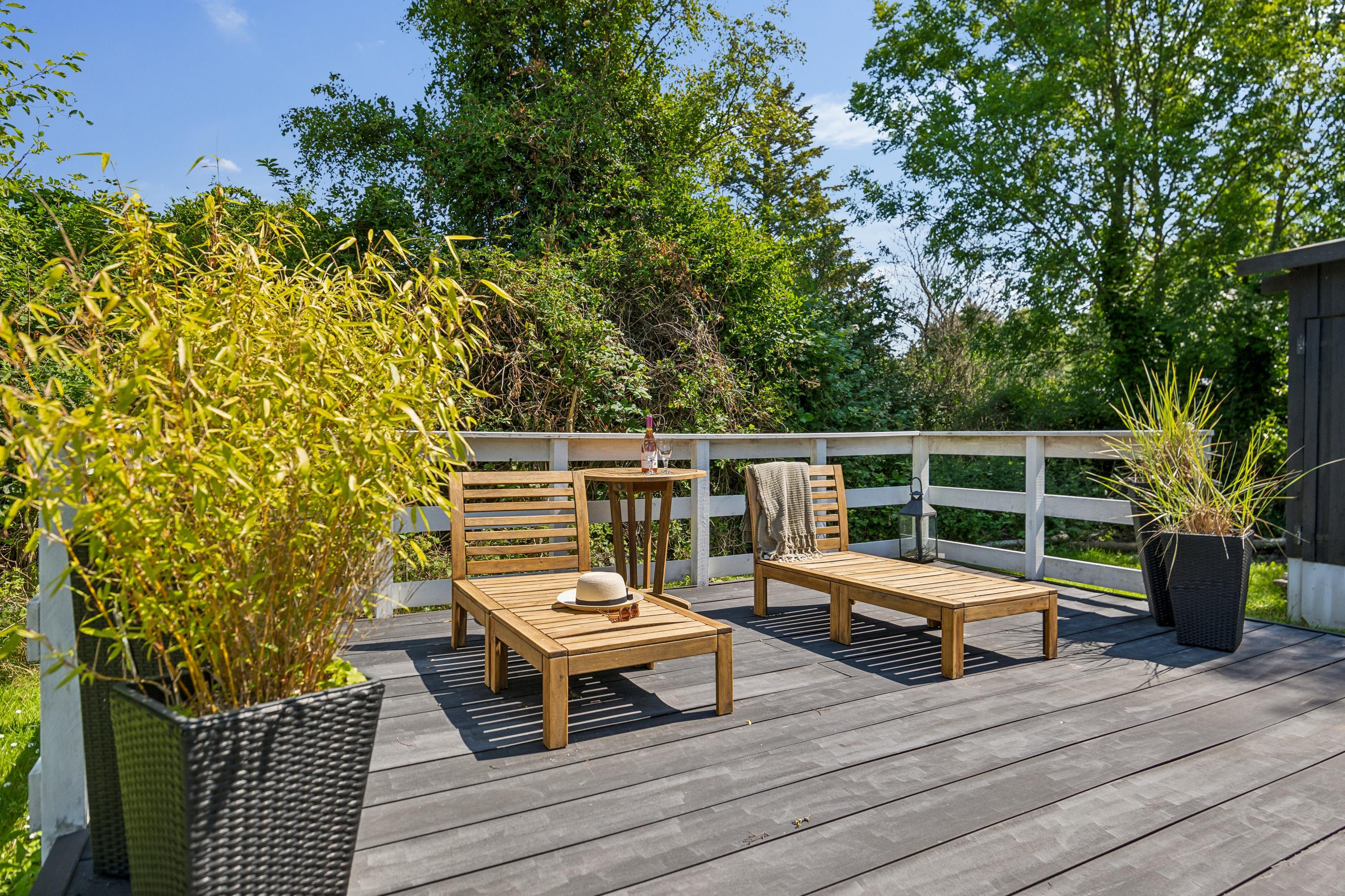 The large glass bay with access to the terrace adds both extra space and plenty of light to the inviting living room, which includes a dining area for 6 people, a lovely corner sofa, armchairs, a wood-burning stove, and a TV with Danish channels. The large, well-appointed kitchen is open to the living room and features ceramic cooktops, a built-in oven, a fridge/freezer, a microwave, and a dishwasher. The house’s three bright and spacious bedrooms all have double beds (a total of 6 sleeping spaces), and two of them open onto the terrace. Wilderness bath, heated with wood stoves and outdoor shower with cold and hot water. The bathroom is well-equipped with a shower and a spa bath.