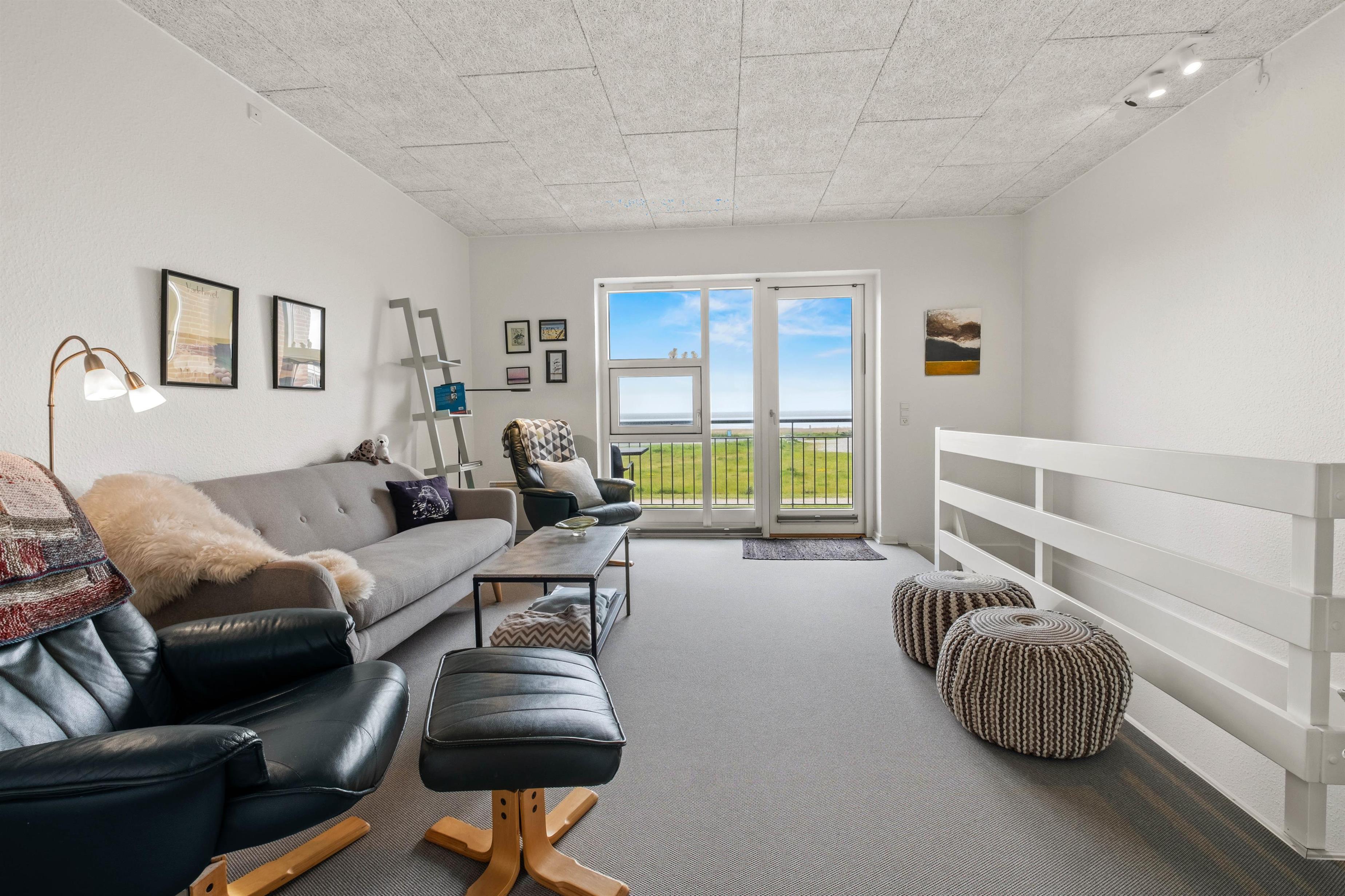 The comfortable living room on the upper floor opens onto the balcony, offering spectacular views across the Wadden Sea. Both the balcony and terrace are perfect spots to enjoy the fresh North Sea air while taking in the peaceful natural surroundings.