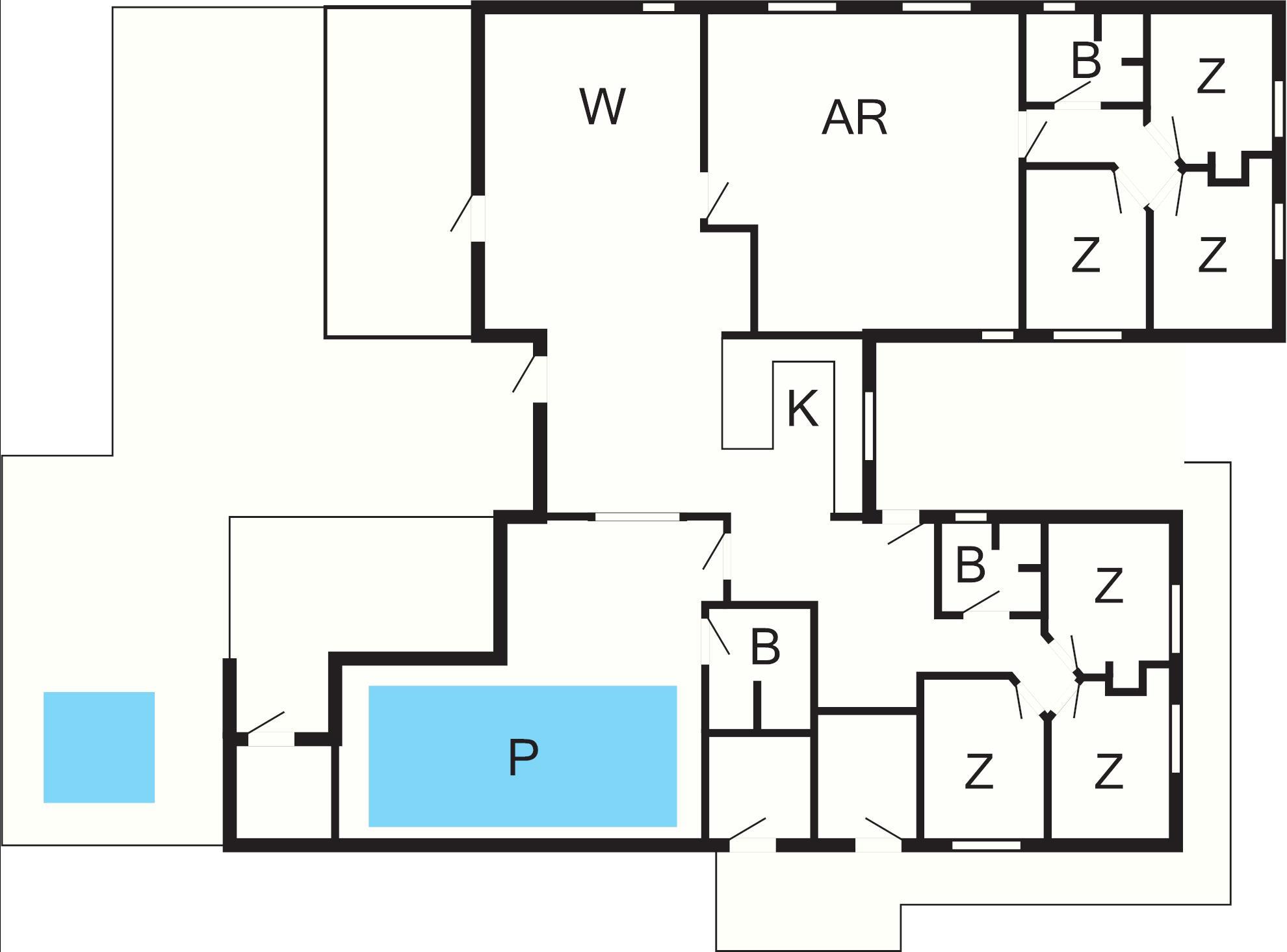 6 Schlafz.: (2B)+(2B)+(2B)+(2B)+(2B)+(2B), Kinderbett