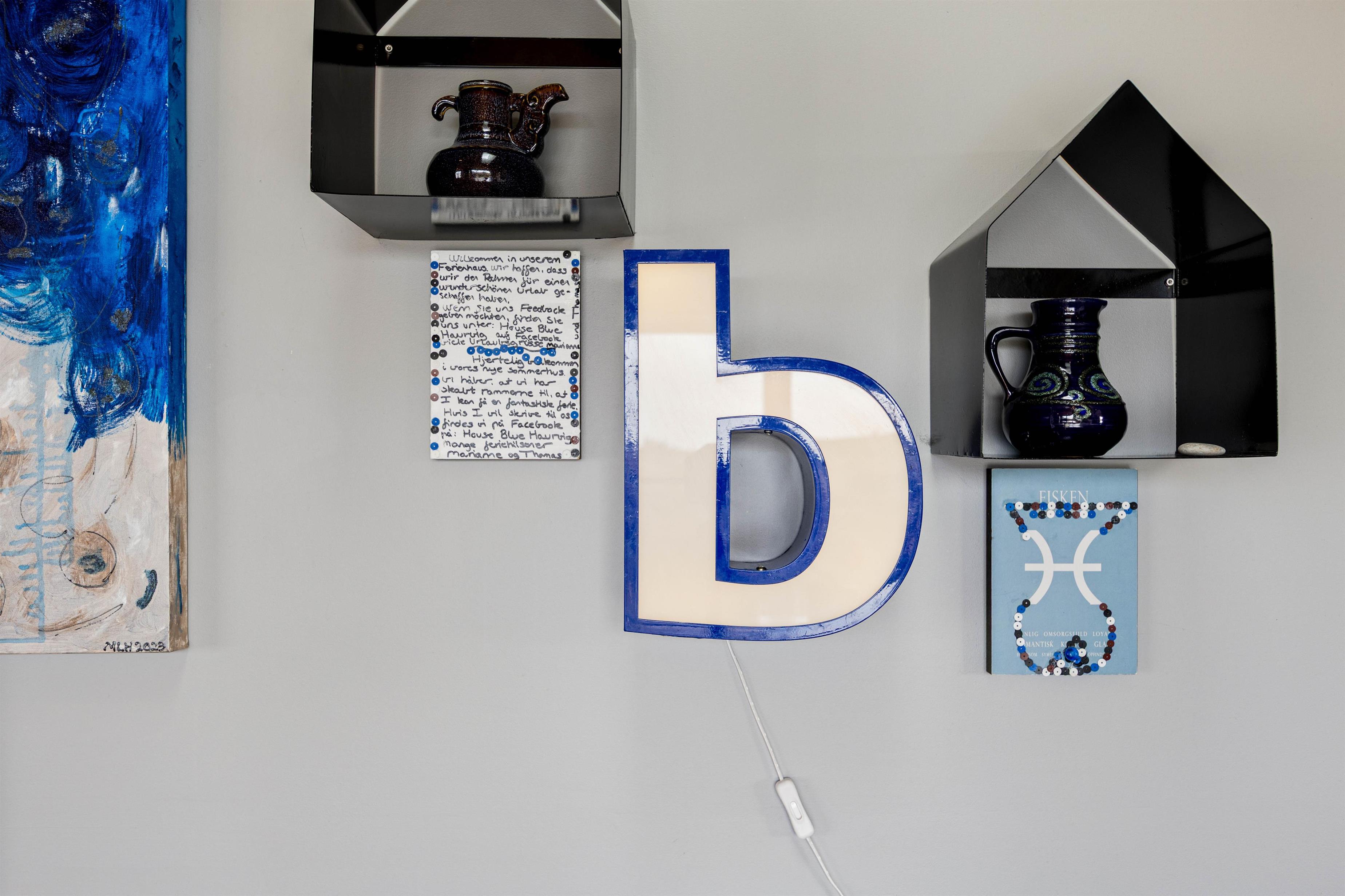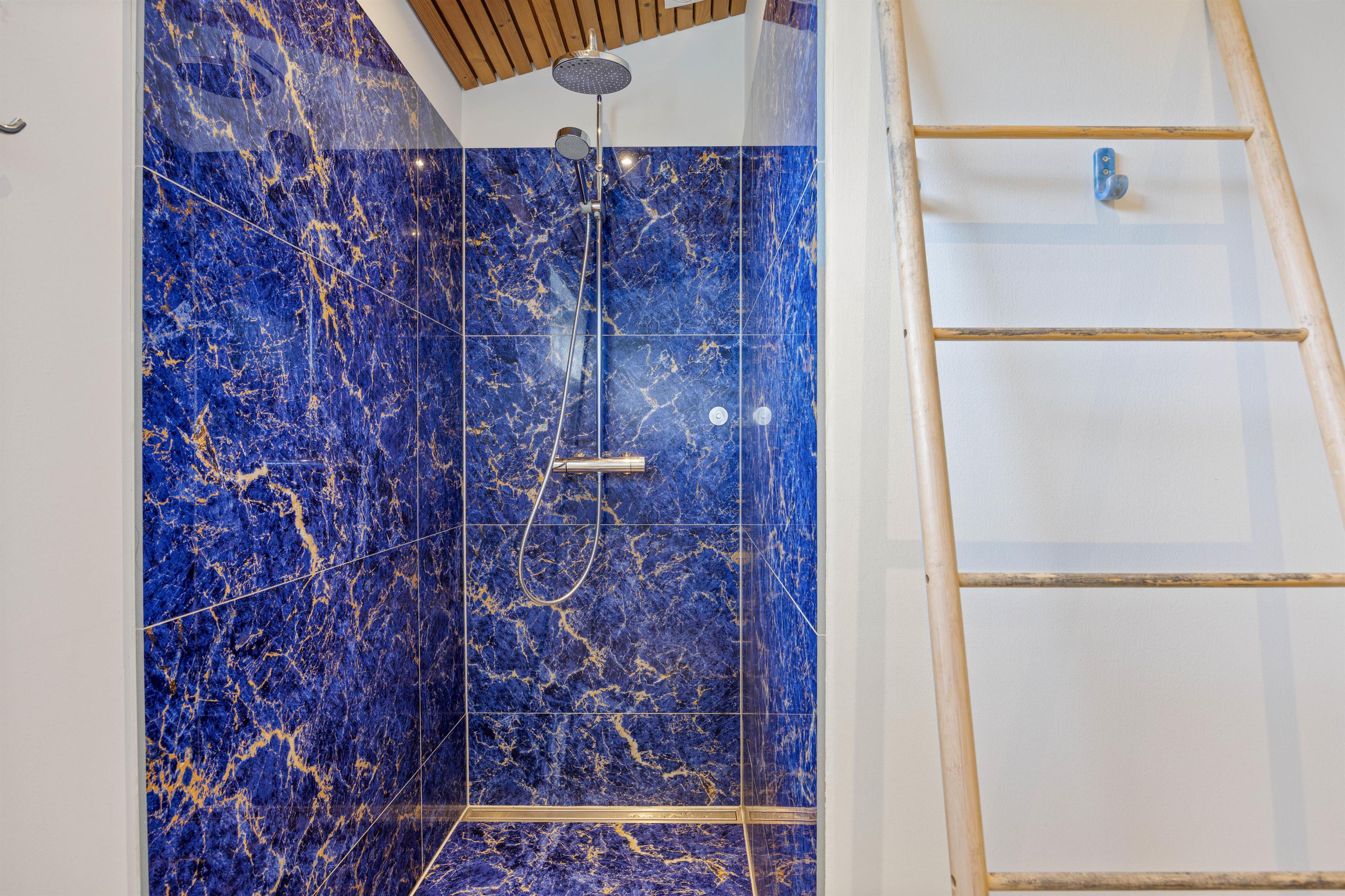 The holiday home has 4 bedrooms, divided into 2 separate sections, separated by a covered terrace, which also offers a cozy place to relax. This layout creates a natural separation between areas, allowing you to enjoy both togetherness and privacy during your stay. The blue accents are repeated throughout the interior, tying the rooms together in a harmonious and cozy way.