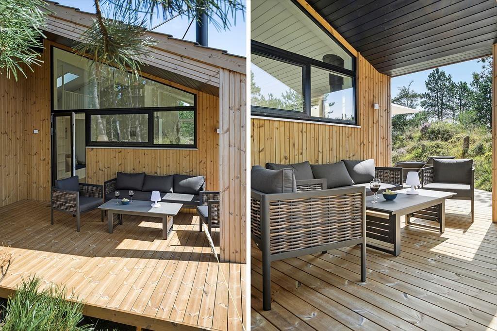 Wenn warme Temperaturen und Urlaubsstimmung herrschen, möchtest Du wahrscheinlich so viel Zeit wie möglich im Freien verbringen, und dann ist es wunderbar, inmitten eines großen und schönen Naturgrundstücks zu wohnen. Rund um das Ferienhaus erstreckt sich eine schöne Holzterrasse, auf der Du von morgens bis abends in den schönen Gartenmöbeln entspannen und Dich mit der Familie vergnügen kannst. An einem der Giebel findest Du eine Außendusche, die perfekt ist, wenn Du vom Schwimmen nach Hause kommst und Dir das Salzwasser vom Körper abspülen möchtest. Der Whirlpool im Freien hingegen ist ideal für die ruhigsten Momente des Urlaubs: Das Verweilen im warmen Wasser an einem hellen Herbsttag oder in der Dämmerung eines ruhigen Sommerabends kann leicht zu einer unvergesslichen Erinnerung werden, an die Du noch lange denken wirst.