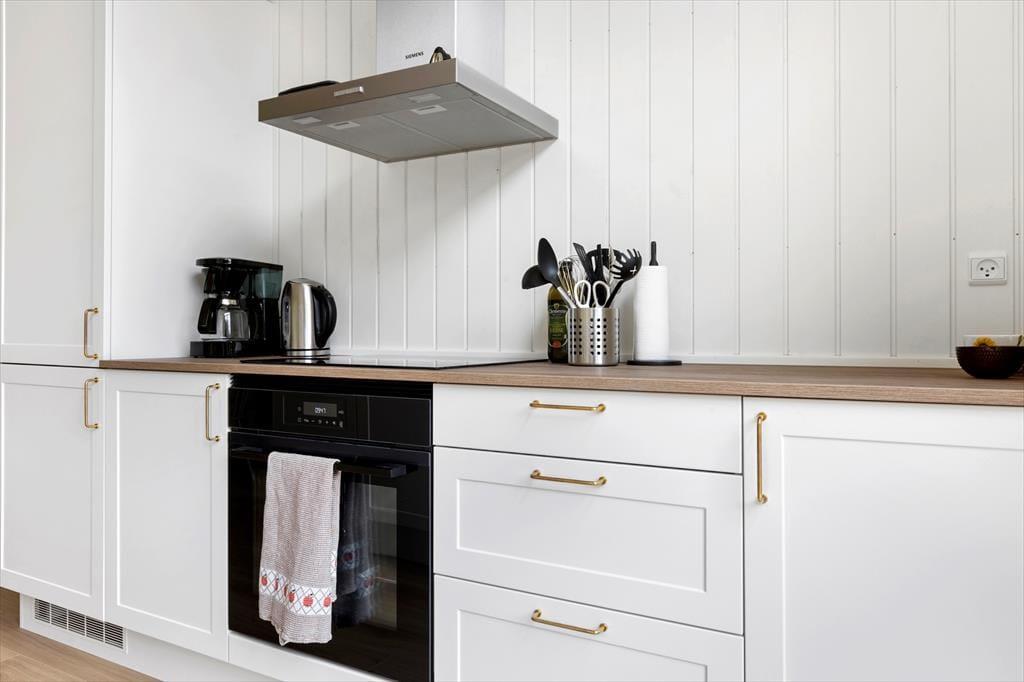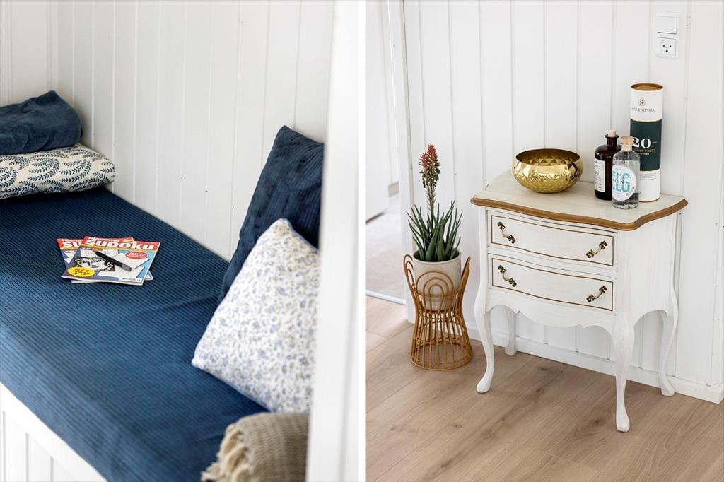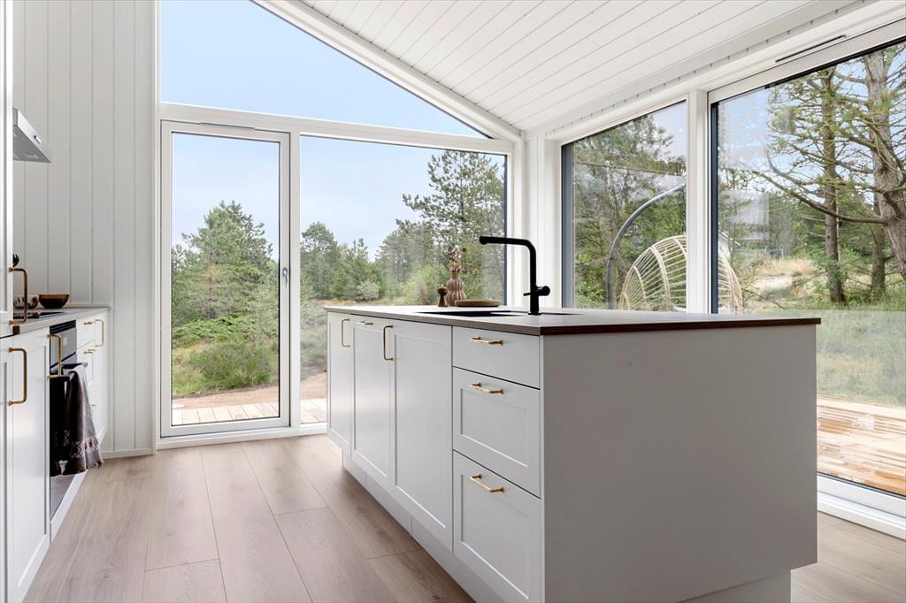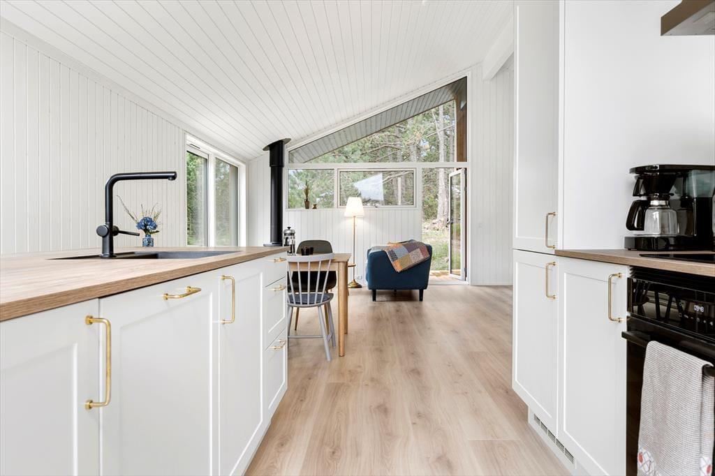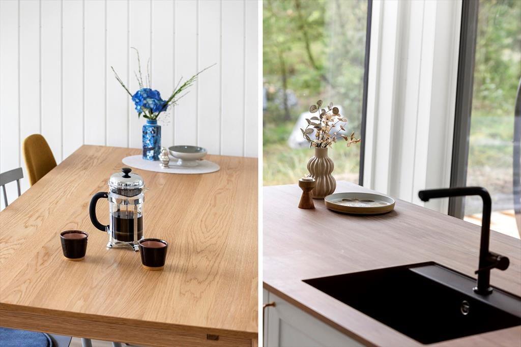 Die helle Holzfassade fügt sich gut in die üppige Vegetation des Naturgrundstücks ein und im Inneren sorgen die großen Fenster dafür, dass man die Nähe zur Natur hautnah spüren kann. Wie man es von einem absolut modernen und hochwertigen Gebäude erwarten kann, sind sowohl die Ausstattung als auch die Atmosphäre erstklassig und Du kannst Dich in den hellen Räumen sofort wohlfühlen – nicht zuletzt im Wohnzimmer, das mit einem Brennofen ausgestattet ist und an dem einen Ende mit einer gut sortierten Küche kombiniert ist. Vom Wohnraum aus führt ebenfalls eine Leiter zur Dachnische.