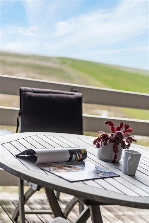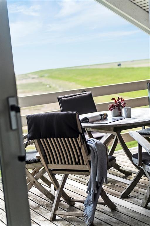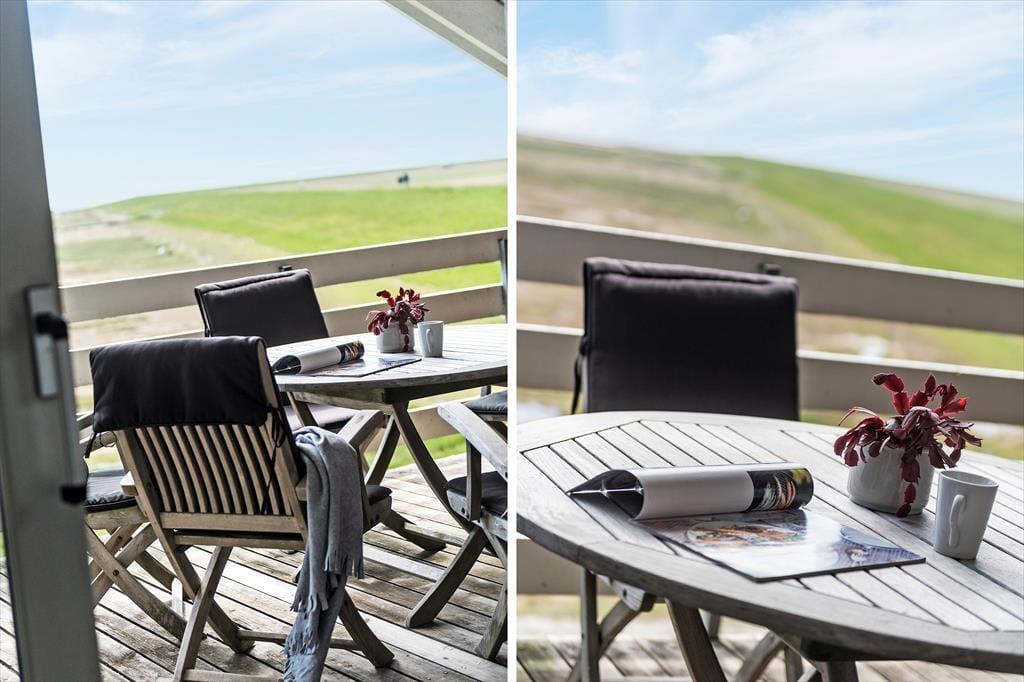 Bei sommerlichem Wetter und warmen Temperaturen kann der Südbalkon schnell zu deinem Lieblingsaufenthaltsort werden. Hier besteht tagsüber die Möglichkeit zum Sonnenbaden mit freiem Blick auf das Wattenmeer, und dank der Überdachung findest du auch Schutz vor dem Tau, wenn du bis spät in die Nacht sitzen bleiben möchtest.