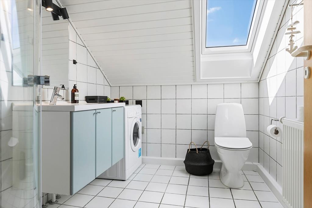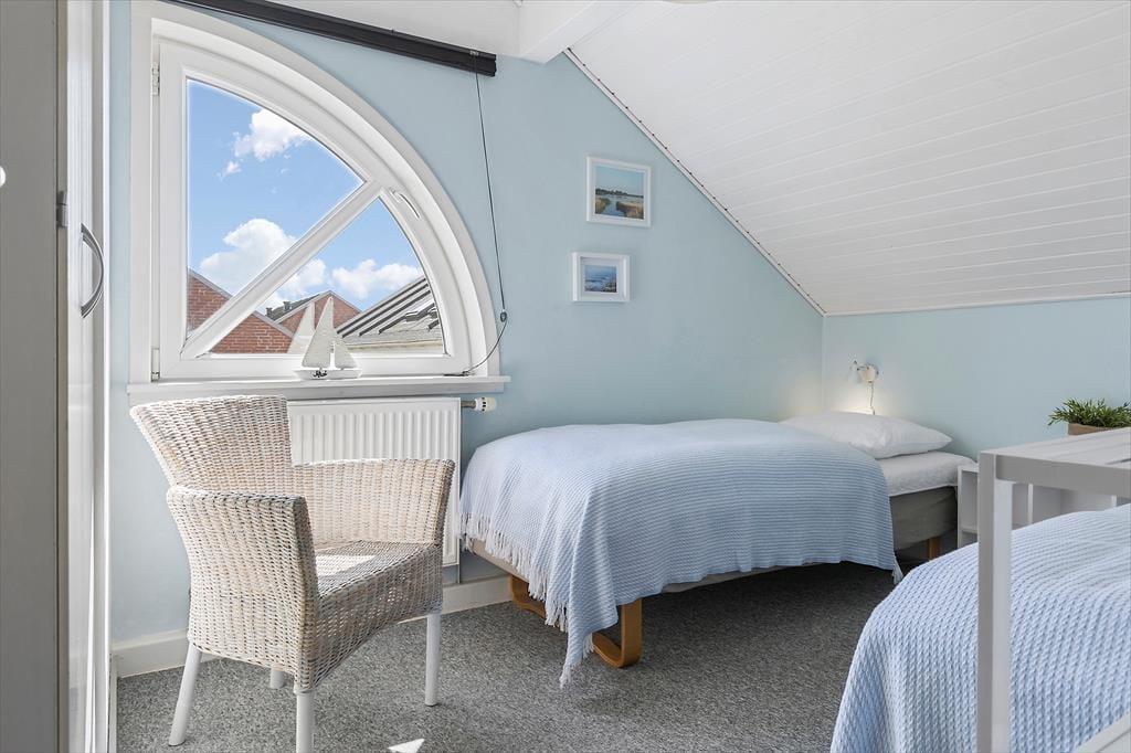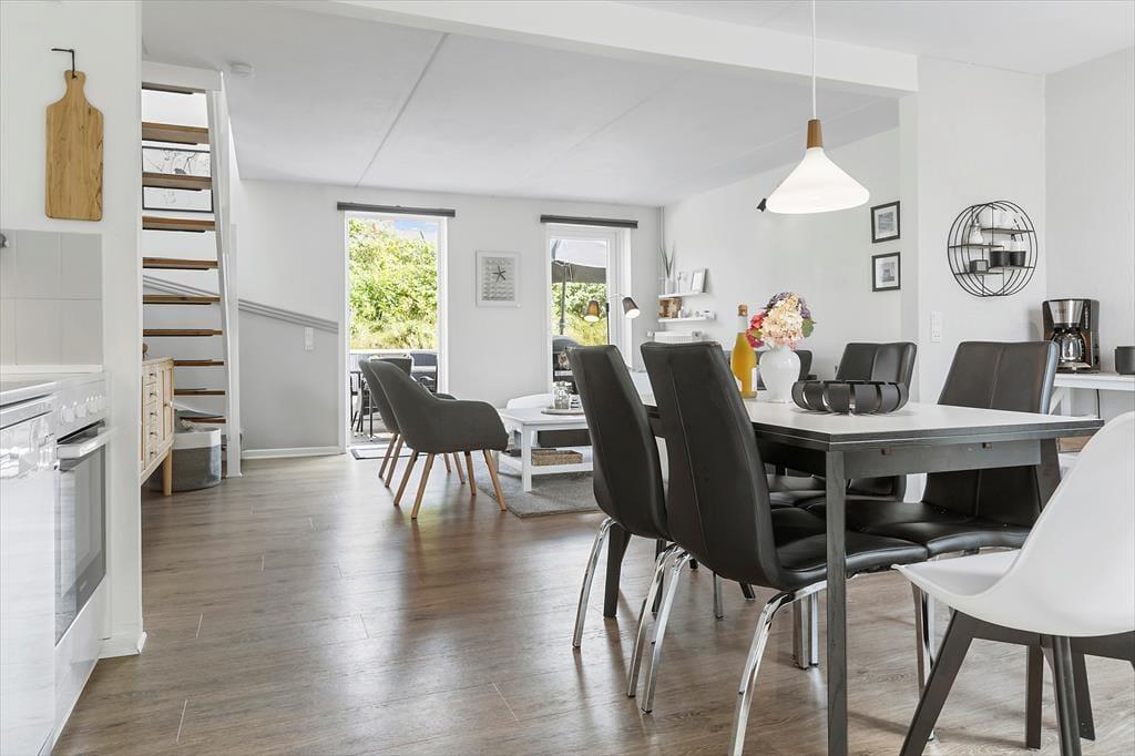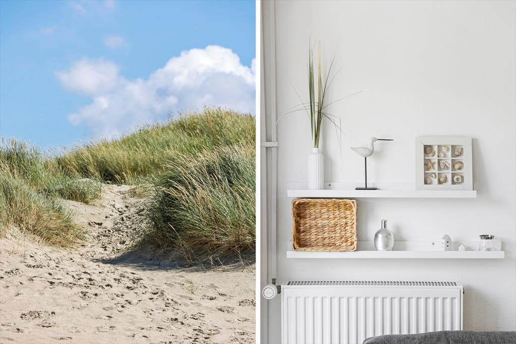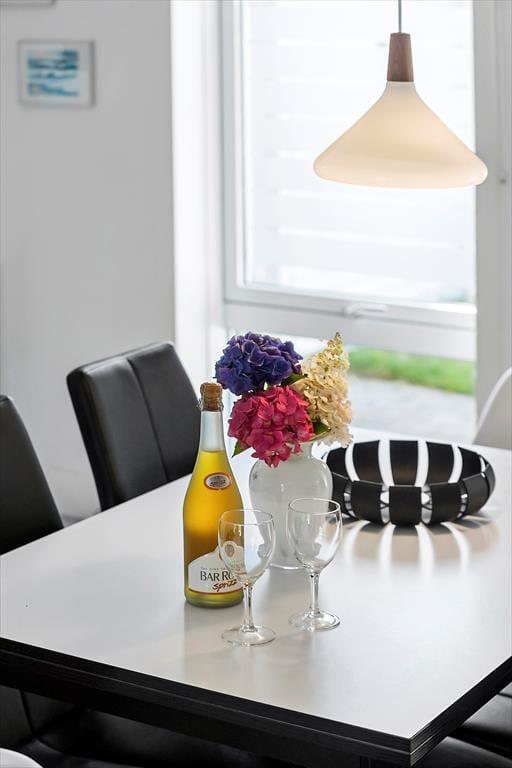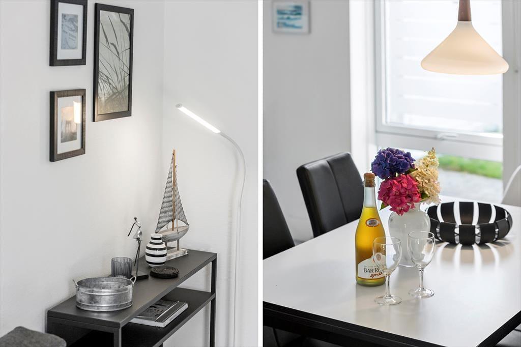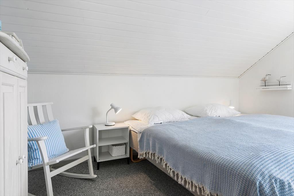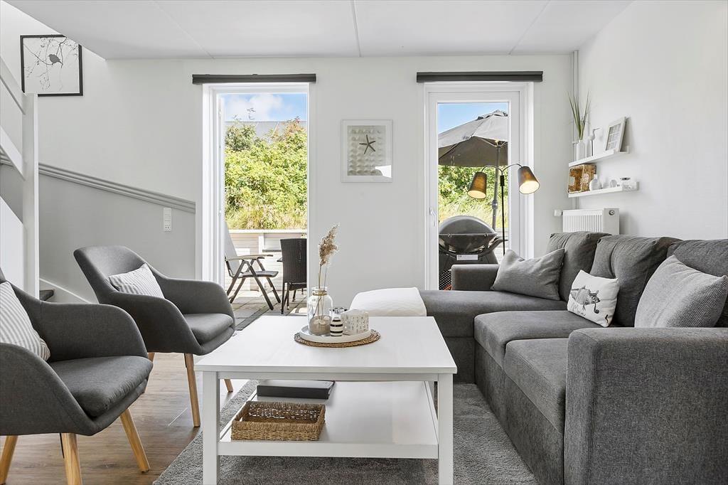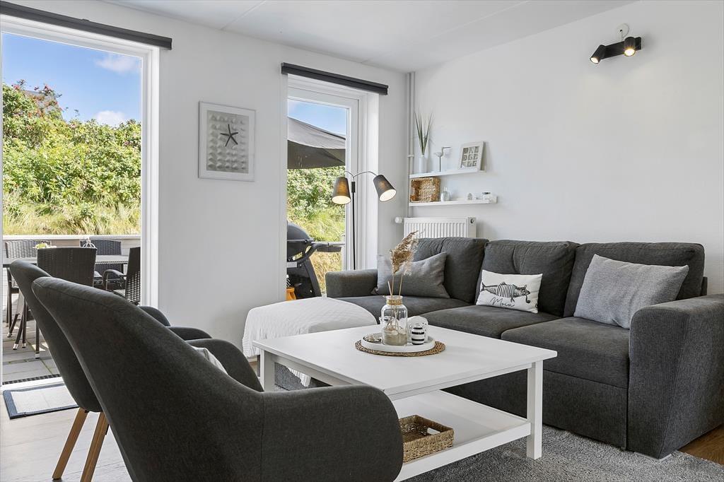 Die Atmosphäre ist im Erdgeschoss sowie in den beiden Schlafzimmern im Obergeschoss hell und luftig, und du kannst dich schnell wohlfühlen und das Urlaubsleben in den gut ausgestatteten Räumen entfalten. Abgesehen vom Eingangsbereich besteht das Erdgeschoss nur aus einem großen Wohnbereich, in dem du kochen und am Esstisch entspannen oder dich auf dem Sofa mit Büchern, Strickzeug oder Fernsehen erholen kannst. Wenn du Lust auf eine Tasse Kaffee während der TV-Serie hast, kannst du zur Kaffeebar in der Küche gehen, um eine Kanne zu brühen – und da es jetzt Urlaubszeit ist, steht einem weiteren Kapitel und einer Tasse sicher nichts im Wege.