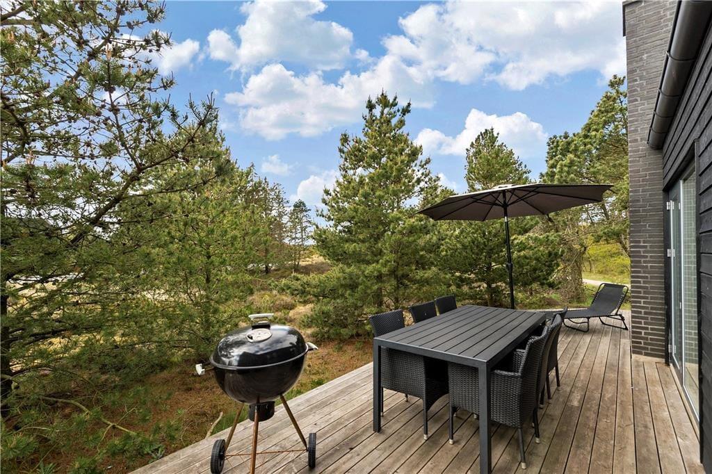 Die Erholung und Entspannung setzt sich auch im Außenbereich fort; hier vermitteln dir rauschende Nadelbäume das herrliche Gefühl, direkt am Waldrand zu wohnen. Die große Terrasse schmiegt sich an zwei Seiten des Hauses. Således vil du næsten altid finde et solrigt eller vindbeskyttet sted at slappe af. Takket være den tilgængelige grill er der intet, der står i vejen for sociale sammenkomster under åben himmel. Du skal blot sørge for at indkøbe de nødvendige ingredienser i Havnebys supermarked.