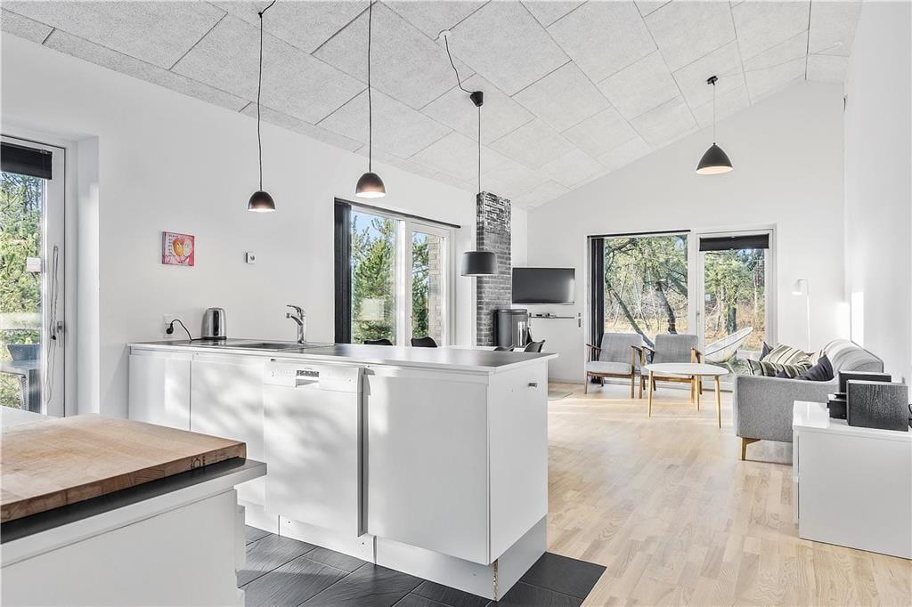 Das im Jahr 2016 erbaute Objekt begrüßt dich mit einer 90 m² umfassenden Wohnfläche. Es ist eine wahre Freude, sich in diesem Haus aufzuhalten. Dies gilt nicht nur für den Wohnbereich, der mit seinem hellen und einladenden Ambiente samt Kaminofen und hohen Decken gemütliche Urlaubsstunden verspricht. Große Fensterfronten sorgen für einen schönen Lichteinfall und gewähren dir gleichzeitig einen schönen Ausblick in die wunderbar grüne Umgebung. Die gut ausgestattete Küche ist harmonisch in den Wohnraum integriert und ermöglicht es dir daher, selbst beim Kochen voll am Familienleben teilzuhaben. Zur Wohnfläche zählen darüber hinaus drei gute Schlafräume, von denen zwei mit jeweils einem Doppelbett eingerichtet sind. Im dritten Schlafraum steht ein Etagenbett bereit. Schlussendlich beherbergt das Ferienhaus auch ein Badezimmer, in dessen Sauna du erholsame und entspannte Wellnessmomente genießen wirst.