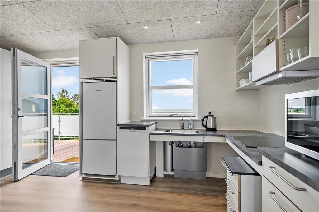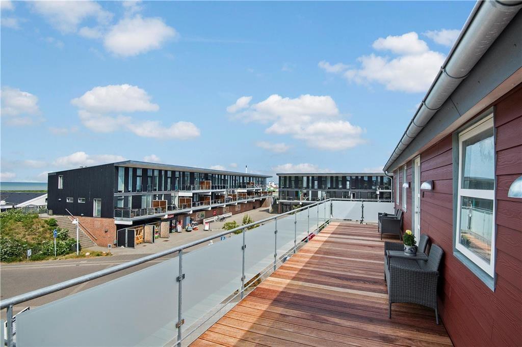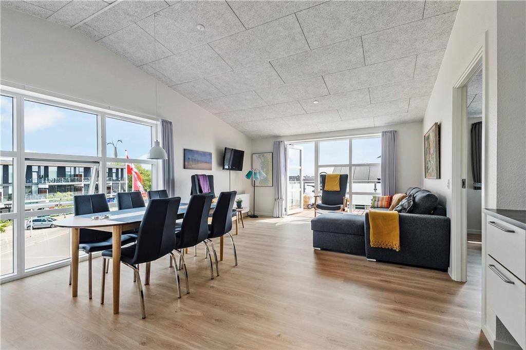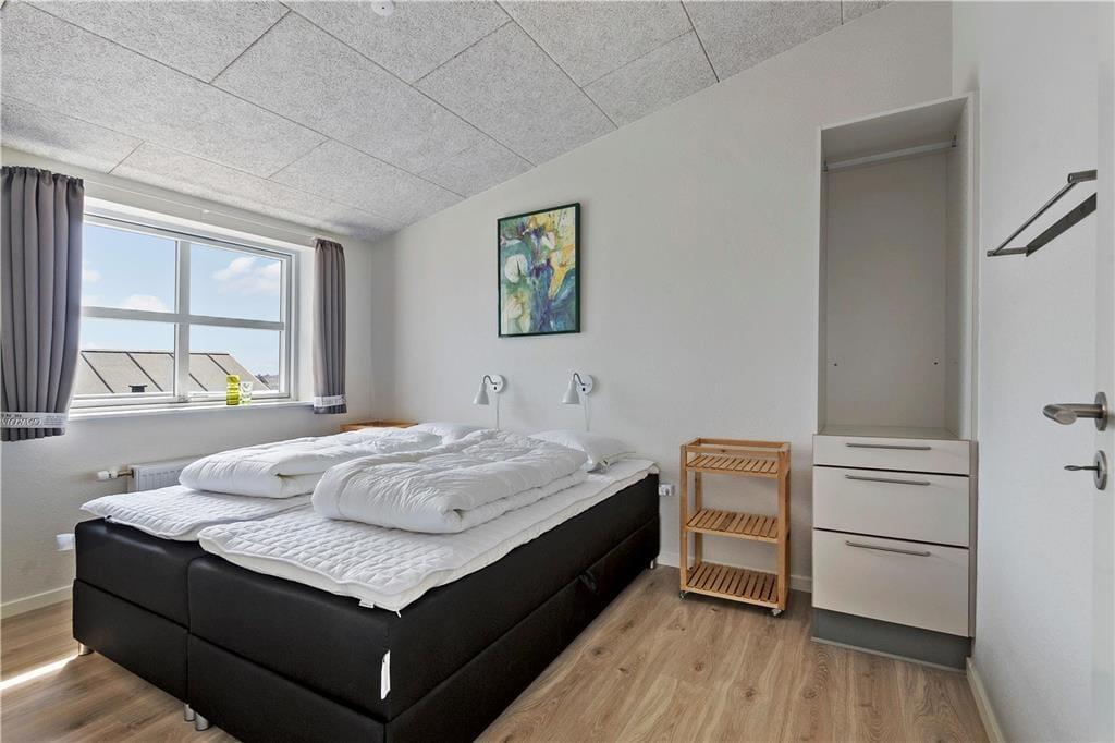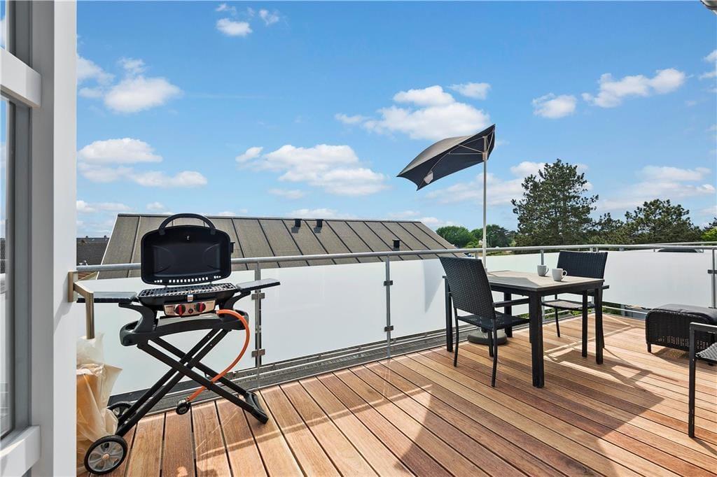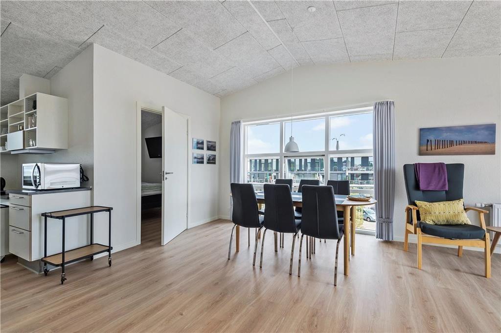 Der Südbalkon ist genau der richtige Aufenthaltsort, wenn du das Sonnenwetter und die sommerlichen Temperaturen genießen möchtest, während die nordgewandte Galerie schattiger ist. Von beiden Außenarealen kannst du die Aussicht auf das Wasser genießen und gleichzeitig das Treiben auf Havnebys zentralem Platz mit den Geschäften beobachten. Abschließend ist zu erwähnen, dass zur Wohnung ein markierter Parkplatz gehört.
