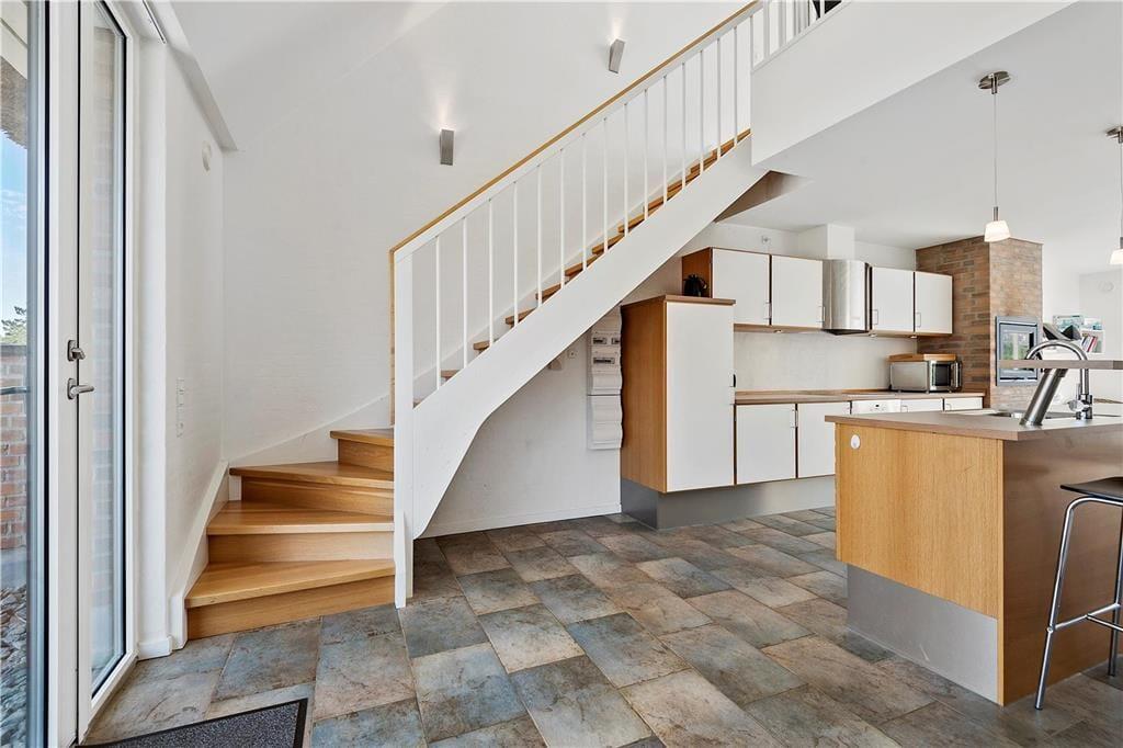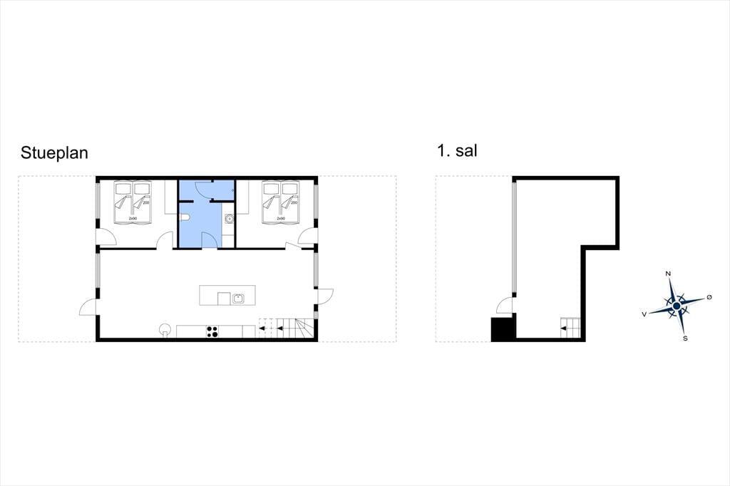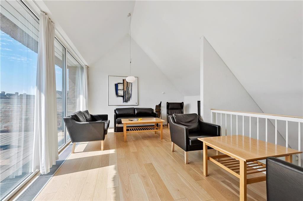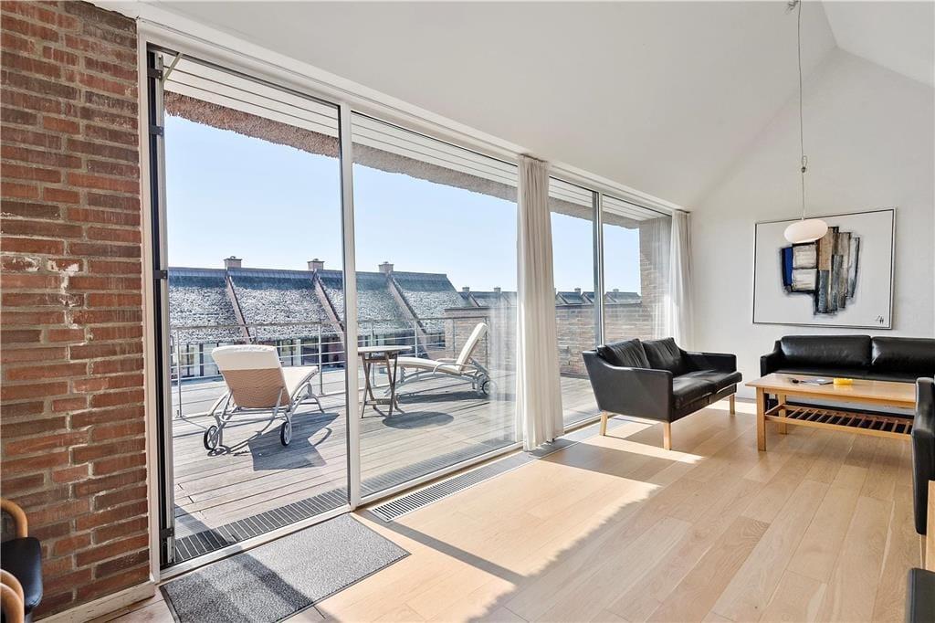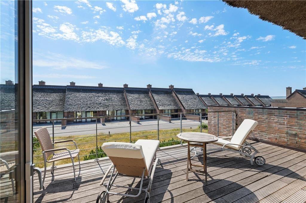 Das Ferienhaus bietet unten, wie auch oben im ersten Geschoss, schöne Aufenthaltsmöglichkeiten. Im Erdgeschoss gibt es jeweils eine Terrasse auf beiden Seiten, die vom Aufenthaltsraum zugänglich sind. So kannst du es dir immer im Schatten oder in der Sonne gemütlich machen, je nachdem, wonach dir gerade ist. Vom Wohnzimmer im ersten Stock kommst du direkt auf den großen Südbalkon, von dem du über die hübschen Strohdächer und die schöne landschaftliche Umgebung schauen kannst. Ein herrlicher Platz, um die Sonne und die frische Luft zu genießen – genau das macht Rømø zu einem schönen Ferienort.