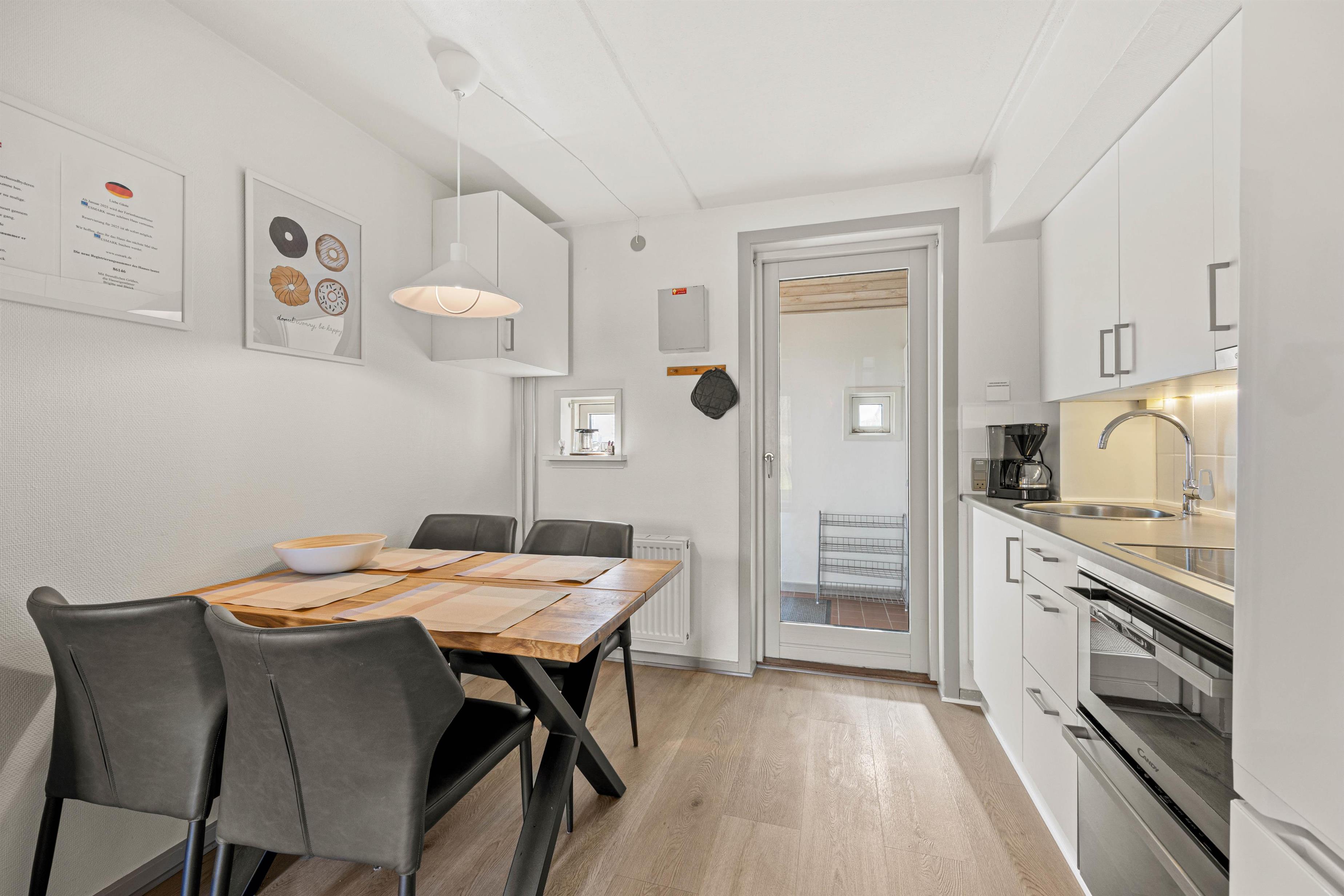 The modern kitchen features a fridge-freezer with an 80-litre freezer compartment, a ceramic hob, compact oven and small dishwasher. Everything you need to prepare delicious meals in your holiday home.