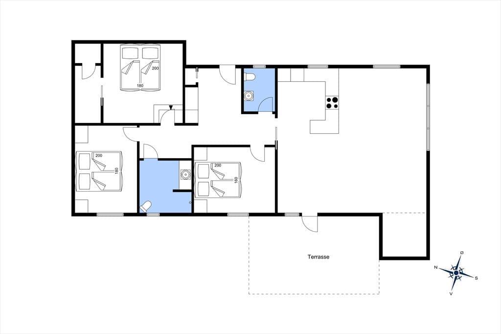 Vom Wohnzimmer aus gelangen Sie direkt auf eine nach Westen gerichtete Holzterrasse und weiter hinunter auf den guten Rasen des Gartens. Auf der anderen Seite der Hecke breitet sich eine offene Feldlandschaft aus, so dass Sie etwas Hübsches zu sehen haben, während Sie sich in den Gartenstühlen entspannen oder grillen. Östlich des Ferienhauses können Sie auf der großen gefliesten Terrasse sitzen, und zur Straße hin gibt es einen Schotterparkplatz.