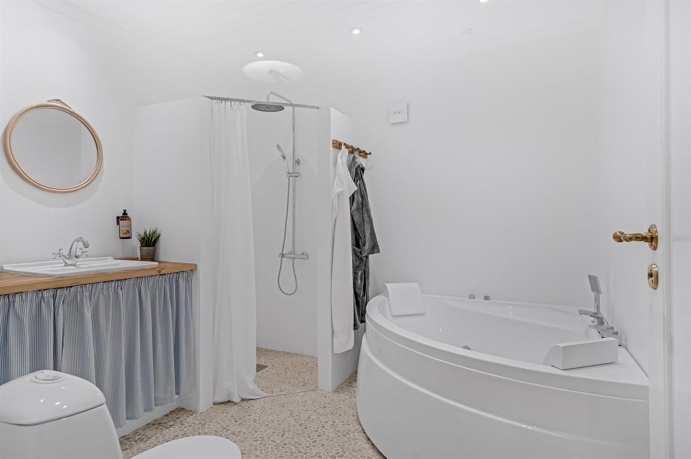 There are 2 bathrooms with shower cabinet and 2 toilets. There is floor heating in 2 bathrooms.