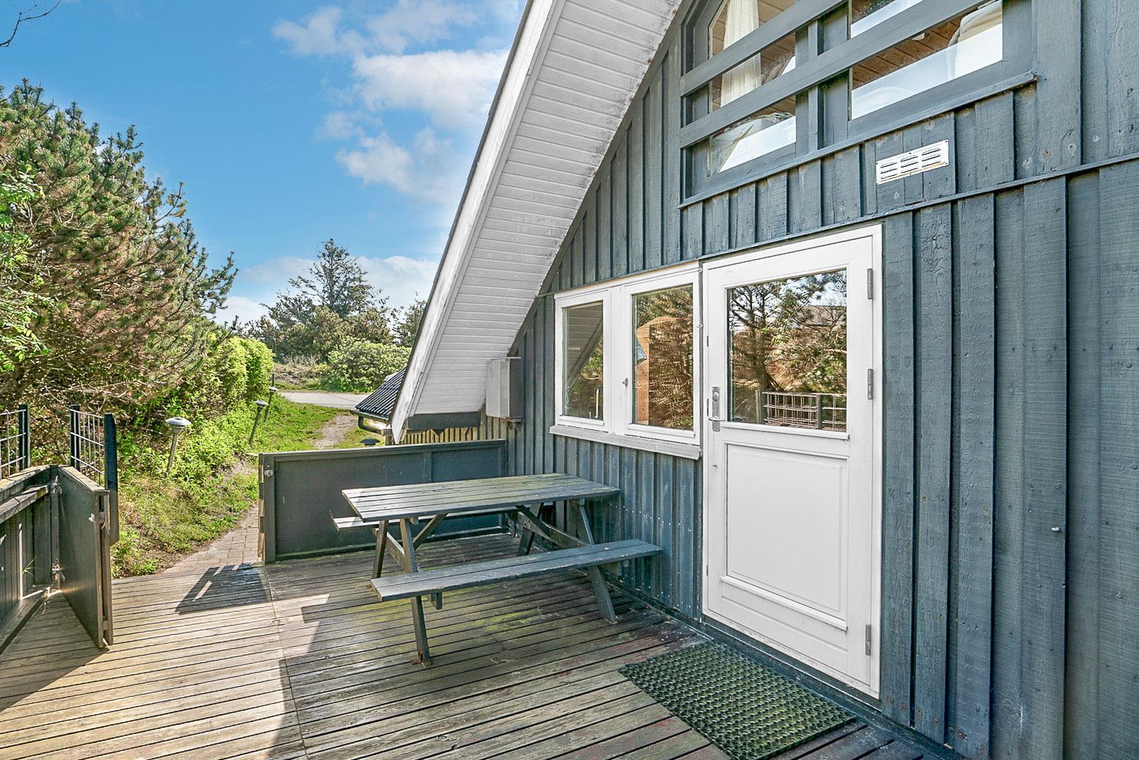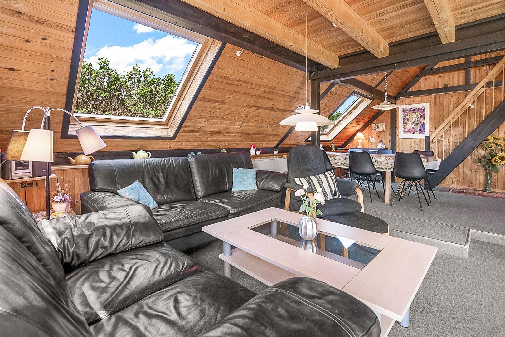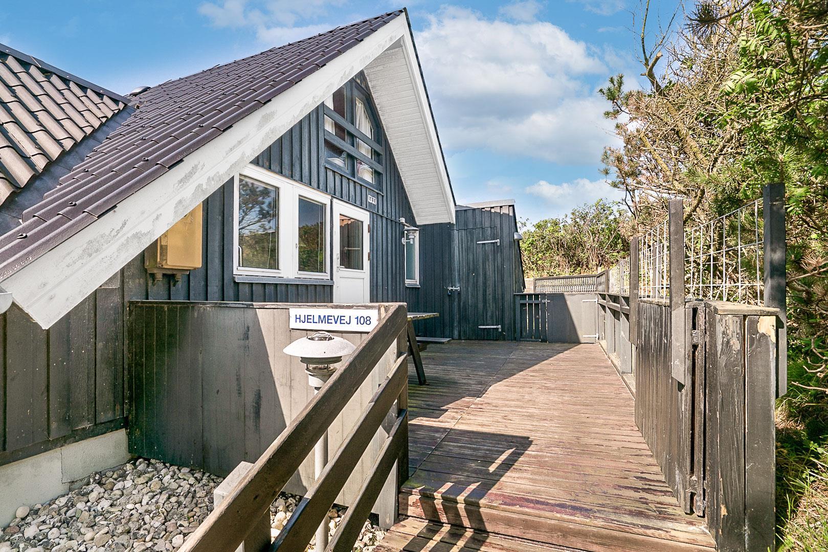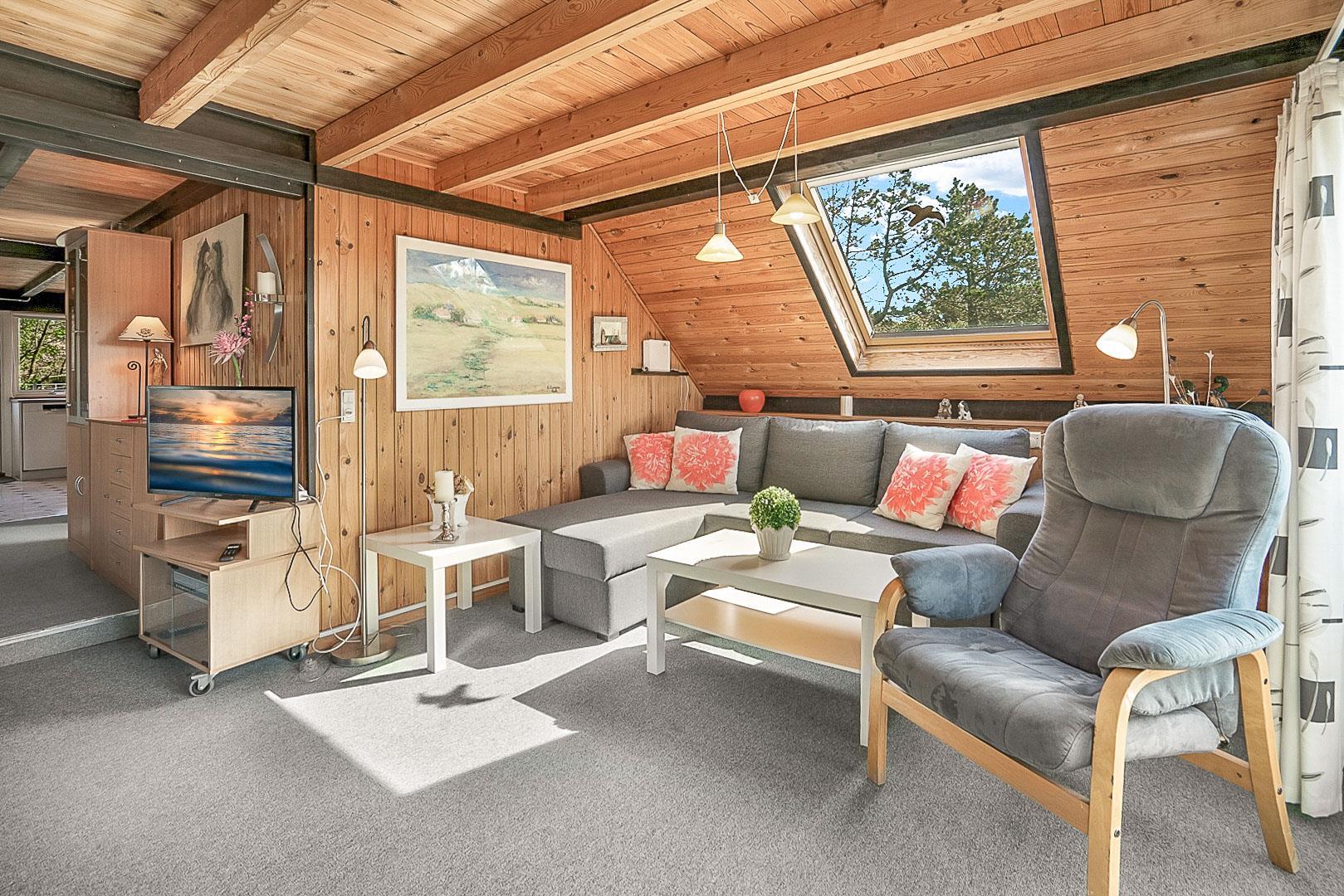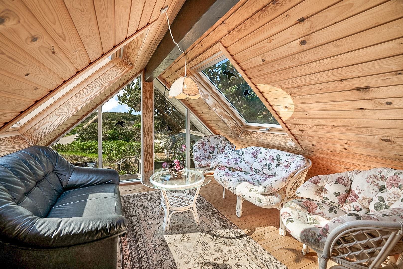 Auf der Hjelmevej liegt ein gemütliches Ferienhaus, ideal gelegen nahe der charmanten Stadt Henne Strand, bekannt für ihre vielen Cafés, gute Einkaufsmöglichkeiten und einen der besten Strände entlang der jütländischen Westküste. Das Ferienhaus liegt hoch und gut hinter üppiger Bepflanzung, was ein Gefühl von Privatsphäre und Ruhe vermittelt. Dieses ältere, aber charmante Ferienhaus ist zweistöckig. Im Erdgeschoss finden Sie sowohl die Küche, das Wohnzimmer, das Badezimmer als auch beide Schlafzimmer. Das Wohnzimmer bietet zwei gemütliche Sitzgruppen und einen Esstisch, perfekt für gemeinsame Mahlzeiten und Entspannung. Vom Wohnzimmer führt eine Schiebetür hinaus auf eine große, geschlossene Terrasse, wo Sie die Sonne und frische Luft in Ruhe genießen können. Im ersten Stock erwartet Sie ein kleines, gemütliches Wohnzimmer mit einem atemberaubenden Blick über das Gebiet und die umliegenden Ferienhäuser. Es ist der perfekte Ort, um sich mit einem guten Buch zu entspannen oder einfach die fantastische Aussicht zu genießen.