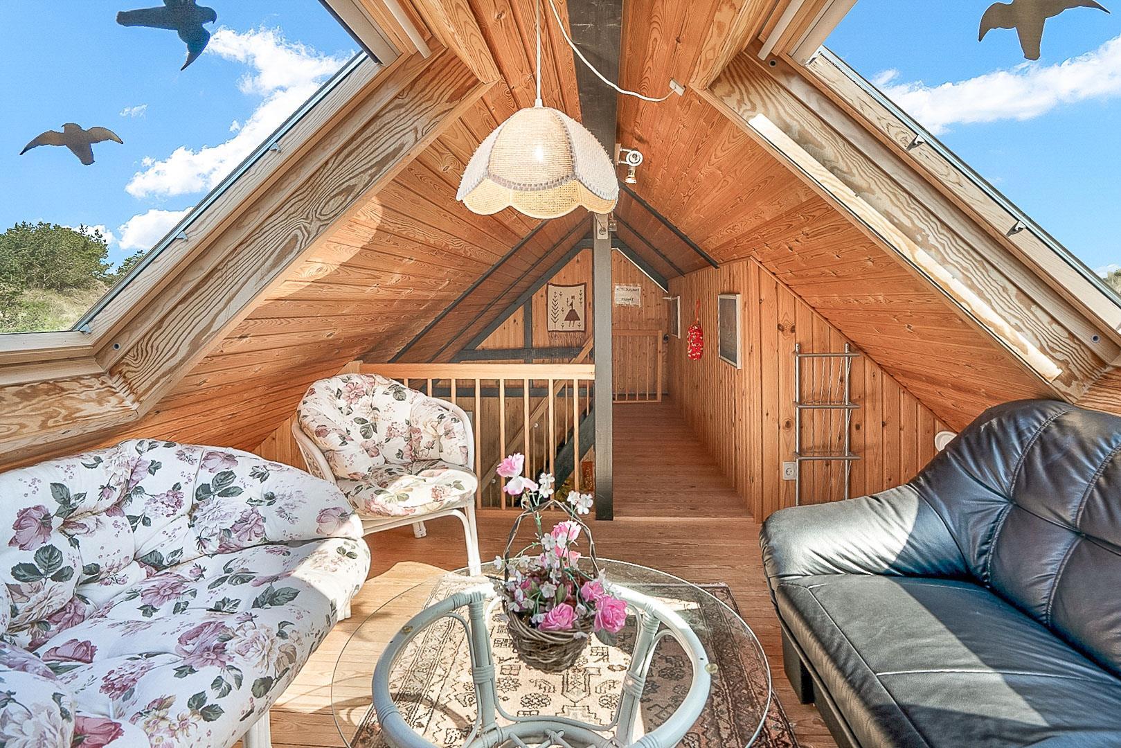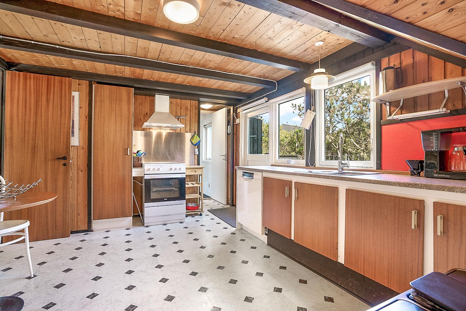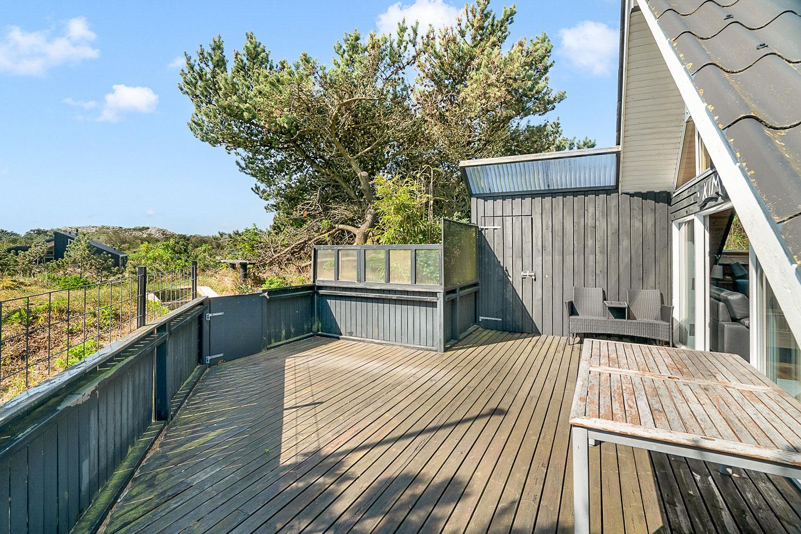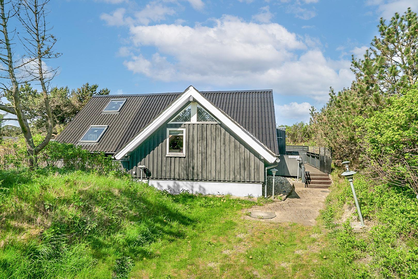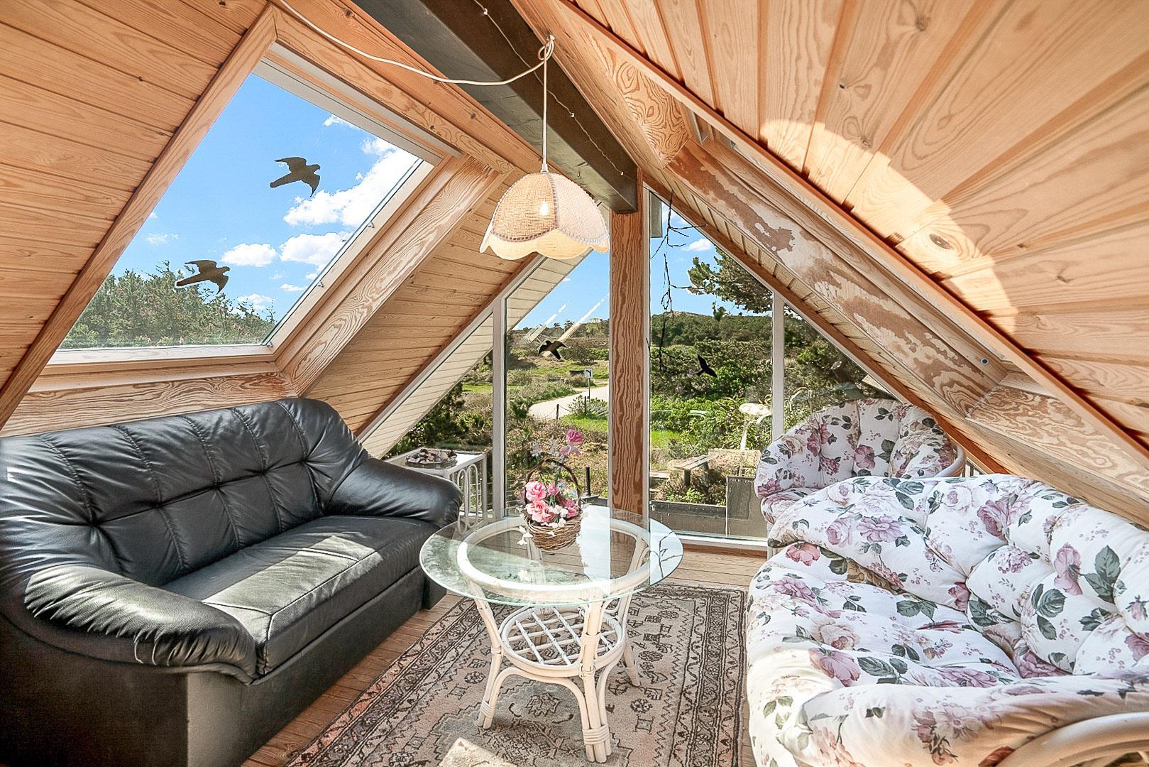 Auf der Hjelmevej liegt ein gemütliches Ferienhaus, ideal gelegen nahe der charmanten Stadt Henne Strand, bekannt für ihre vielen Cafés, gute Einkaufsmöglichkeiten und einen der besten Strände entlang der jütländischen Westküste. Das Ferienhaus liegt hoch und gut hinter üppiger Bepflanzung, was ein Gefühl von Privatsphäre und Ruhe vermittelt. Dieses ältere, aber charmante Ferienhaus ist zweistöckig. Im Erdgeschoss finden Sie sowohl die Küche, das Wohnzimmer, das Badezimmer als auch beide Schlafzimmer. Das Wohnzimmer bietet zwei gemütliche Sitzgruppen und einen Esstisch, perfekt für gemeinsame Mahlzeiten und Entspannung. Vom Wohnzimmer führt eine Schiebetür hinaus auf eine große, geschlossene Terrasse, wo Sie die Sonne und frische Luft in Ruhe genießen können. Im ersten Stock erwartet Sie ein kleines, gemütliches Wohnzimmer mit einem atemberaubenden Blick über das Gebiet und die umliegenden Ferienhäuser. Es ist der perfekte Ort, um sich mit einem guten Buch zu entspannen oder einfach die fantastische Aussicht zu genießen.