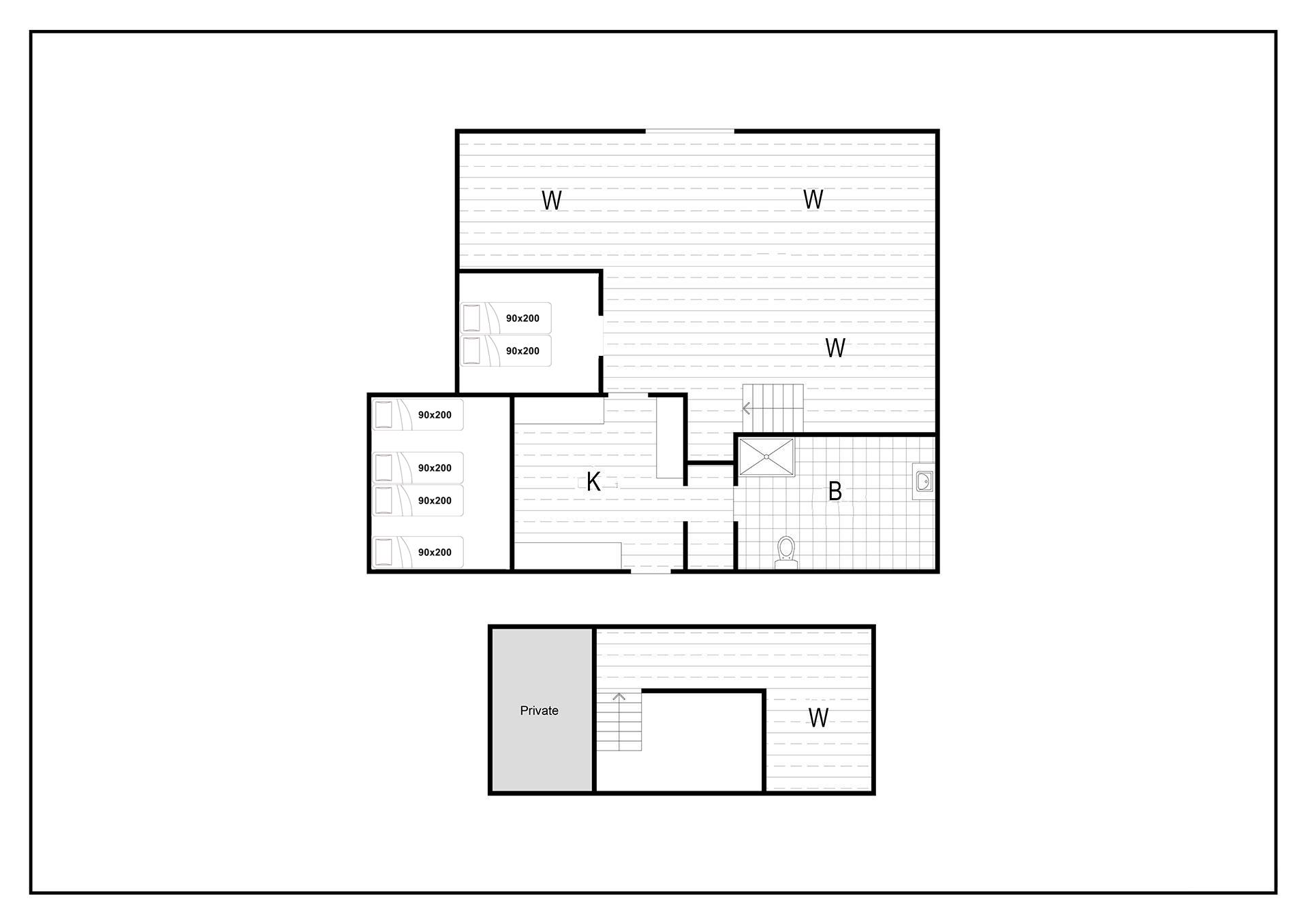 Bettengrösse: 2 Doppelbetten mit je 2 Matratzen á 90 x 200 cm + 2 Einzelbetten 90 x 200 cm.