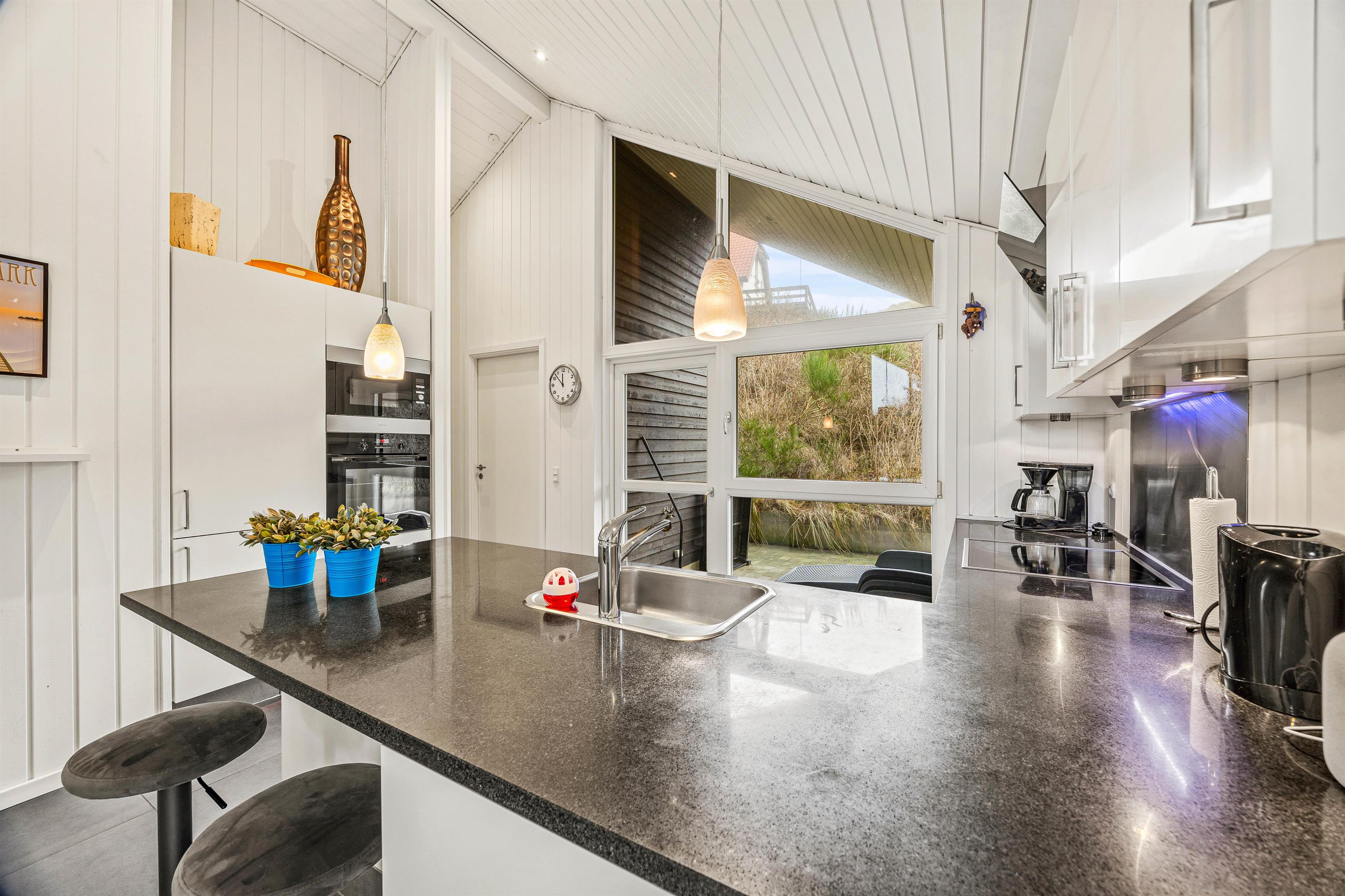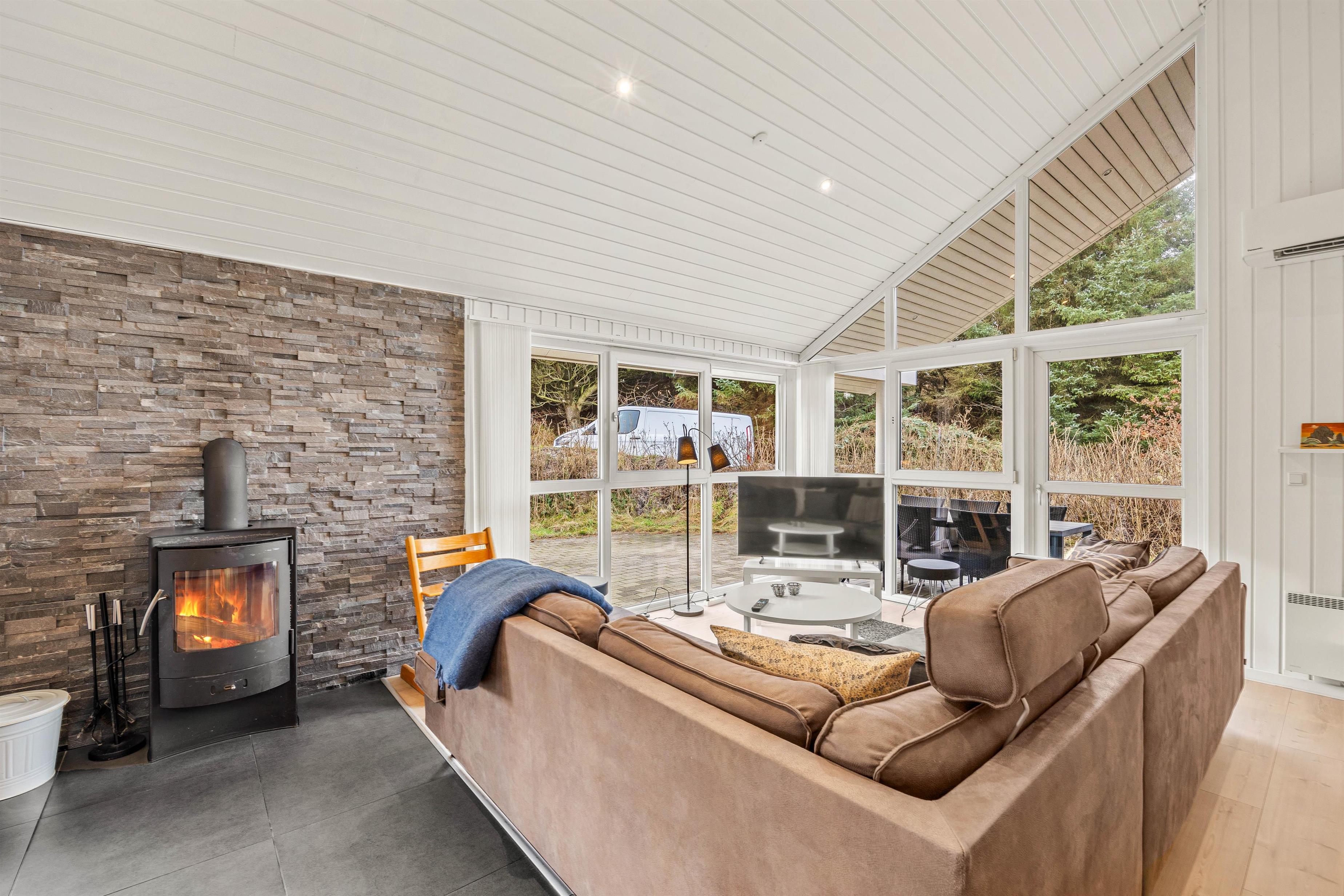 The modern interior creates a pleasant and relaxing atmosphere with its stylish furniture, spacious layout and light colour scheme, complemented by a wood-burning stove providing warmth on cool evenings. Thanks to the modern heat pump, the holiday home maintains a comfortable temperature throughout the year.