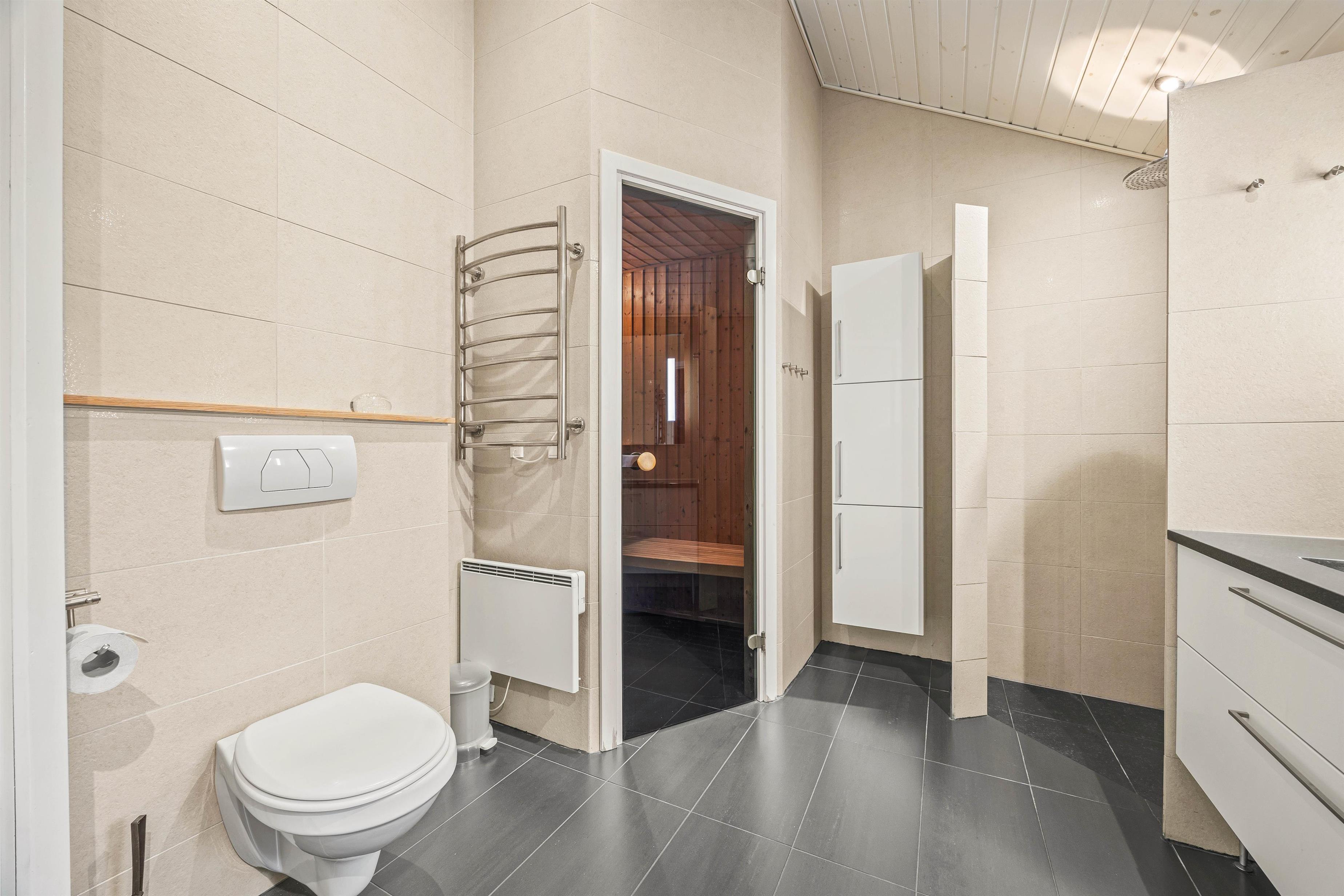 You'll find two bathrooms, both featuring underfloor heating. One bathroom includes a sauna and whirlpool - a wellness haven ideal for relaxing after a beach walk.