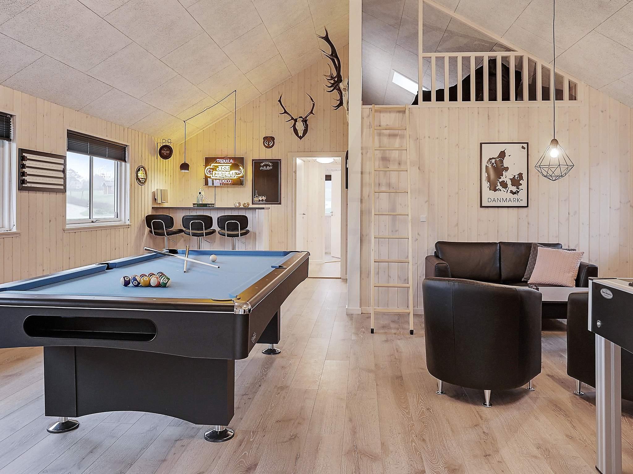Der geräumige Wohn-/Essbereich mit Kaminofen wurde geschmackvoll eingerichtet. Zur technischen Ausstattung des Ferienhauses gehören auch schnelles WLAN, TV mit deutschen Programmen, Stereoanlage sowie CD- und DVD-Spieler. Im Freizeitbereich des Hauses findet man zudem Tischkicker, Billard, elektronisches Dartspiel und Tischtennis zur Auswahl. Es stehen im Haus mehrere TV-Geräte bereit, zudem Playstation 4, Nintendo Wii und DVD-Spieler. So dürfte hier auch an Regentagen keine Langeweile aufkommen. Die Küchenausstattung ist ebenfalls umfassend und beinhaltet u.a. einen großen Kühlschrank, Gefrierschrank und zwei Geschirrspüler.