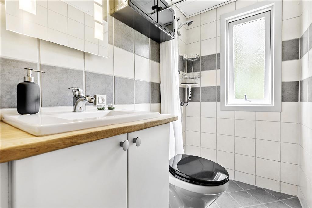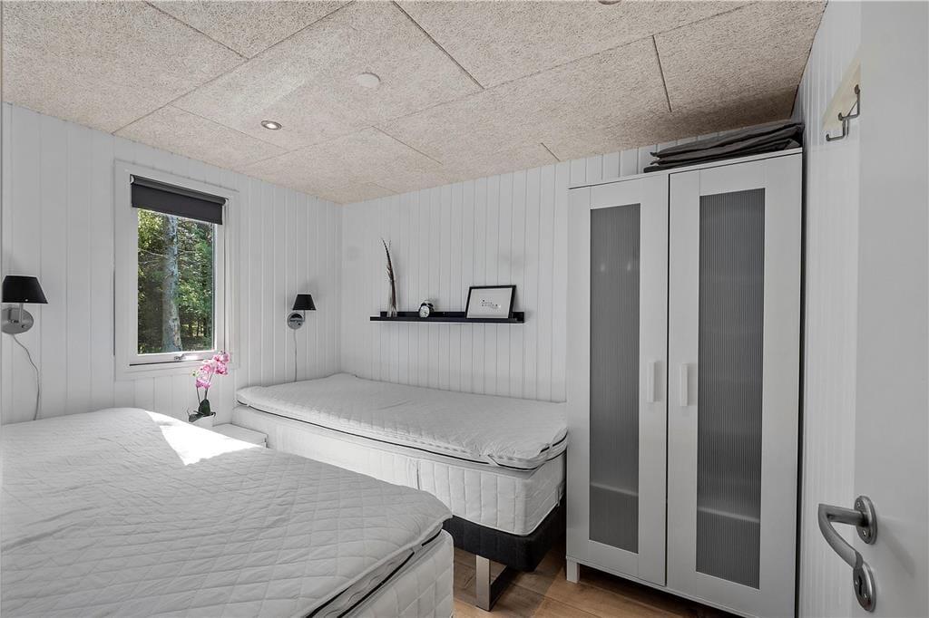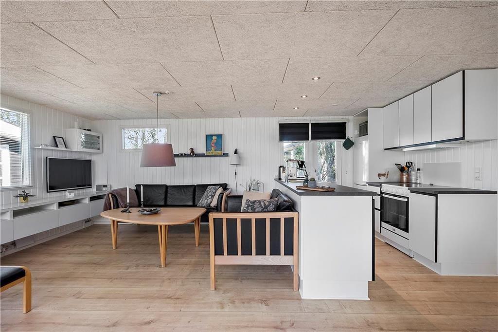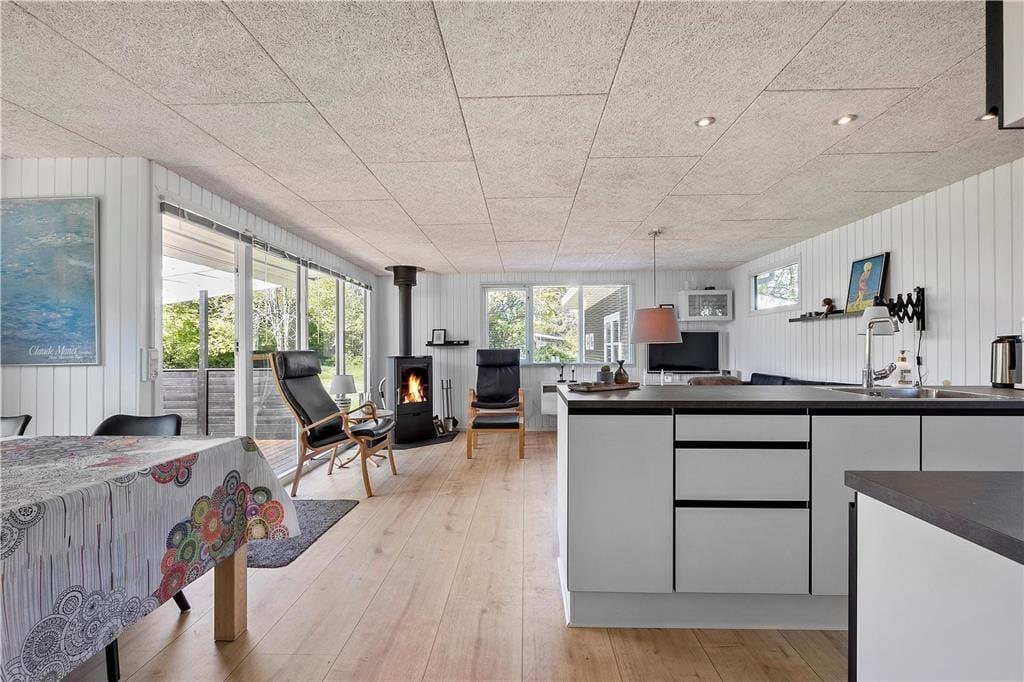 Auf hübsche und klassische Weise präsentiert sich das Haus mit seiner schwarzen Holzfassade und den weißen Fensterrahmen. Der Anbau ist im gleichen architektonischen Stil gehalten, sodass dieser – obwohl er 2017 und somit mehrere Jahrzehnte später gebaut wurde – perfekt zum Haus passt. In beiden Gebäuden herrscht eine luftig-helle Atmosphäre und es ist offensichtlich, dass auch das Haupthaus einer sorgfältigen Renovierung unterzogen worden ist. Hier können Sie es sich im schön möblierten Wohnzimmer mit Kaminofen und integrierter Küche gemütlich machen. Das Badezimmer ist ebenfalls im einladenden Stil gehalten, was auch für die beiden Schlafzimmer gilt, die zusammen über zwei Einzelbetten und ein Schlafsofa verfügen. Werden mehr Schlafplätze benötigt, finden sich noch zwei weitere im Anbau.