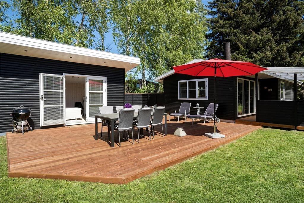 Der grüne Garten ist ein schöner Ort zum Verweilen – nicht zuletzt auf der großen Terrasse, welche sich rund ums Haus erstreckt und trockenen Fußes Zugang zum Anbau gewährt. Mit so viel Platz ist es ein Leichtes, das passende Plätzchen in der Sonne zu finden, wenn Sie den Mittagstisch decken oder es sich in den Liegestühlen bequem machen möchten. Wenn Sie Schutz vor der Sonne oder Windschatten suchen, können Sie sich auf dem überdachten Teil der Terrasse niederlassen: Hier merken Sie nicht, wenn der Tau fällt, sodass Sie nicht vom Tisch aufstehen müssen und die Abendstunden getrost draußen verbringen können.