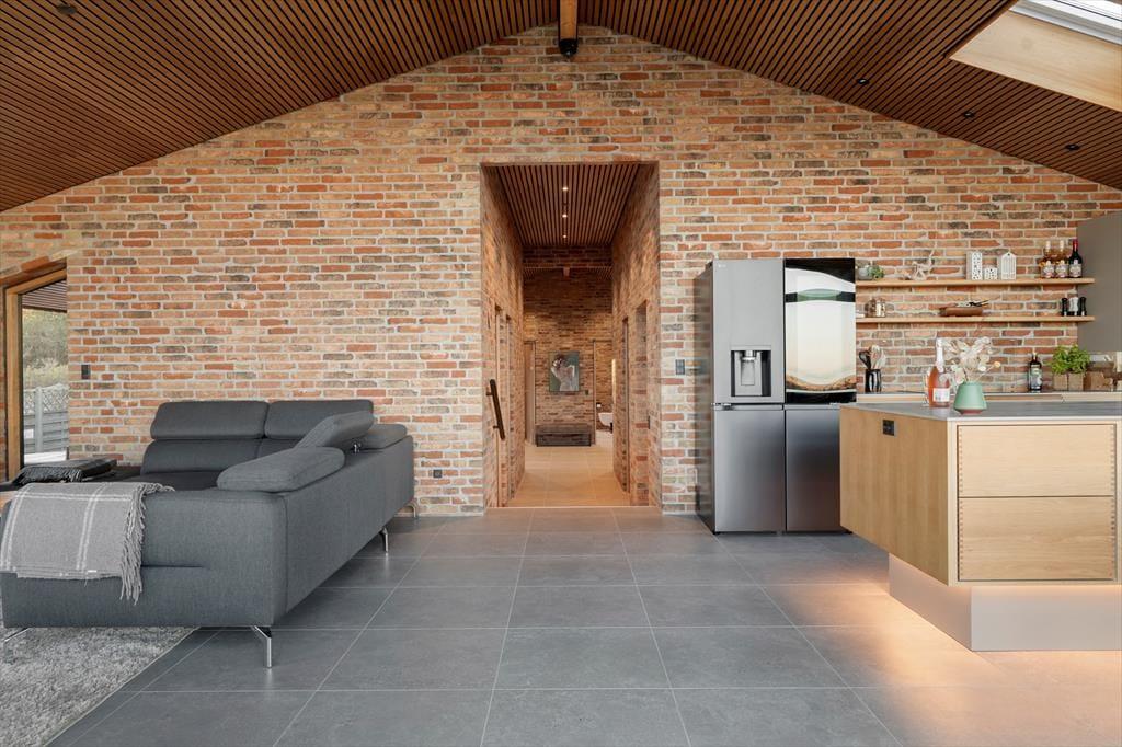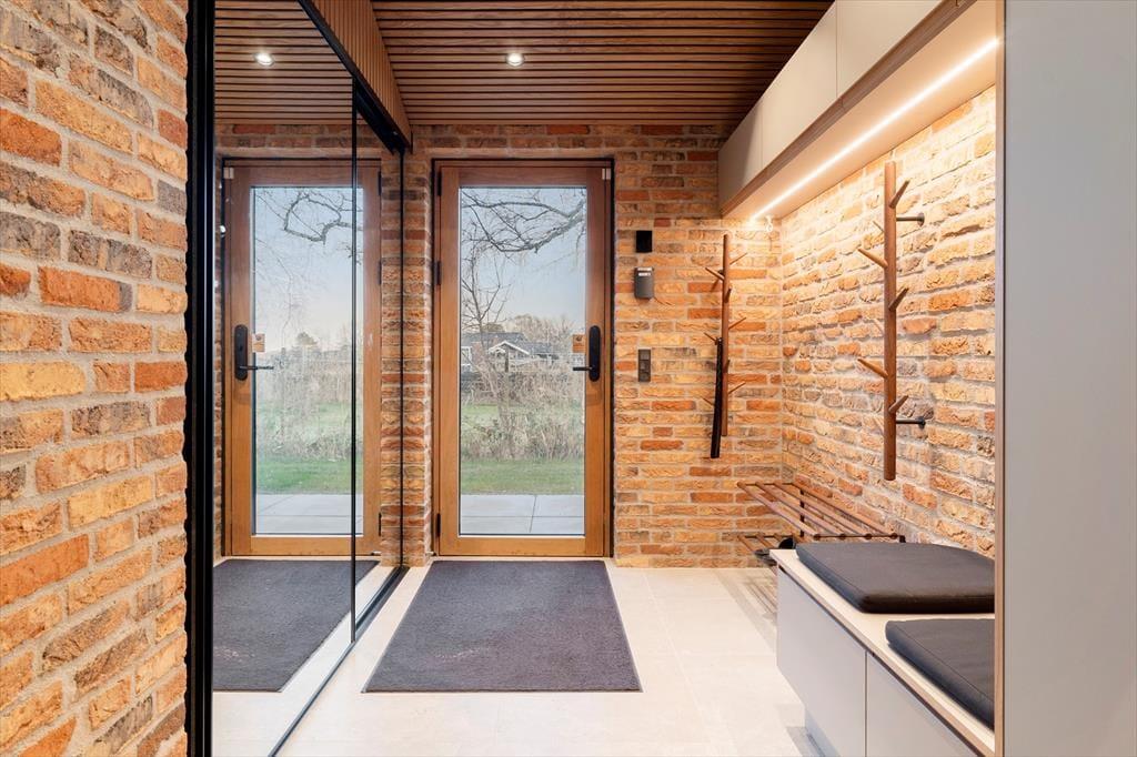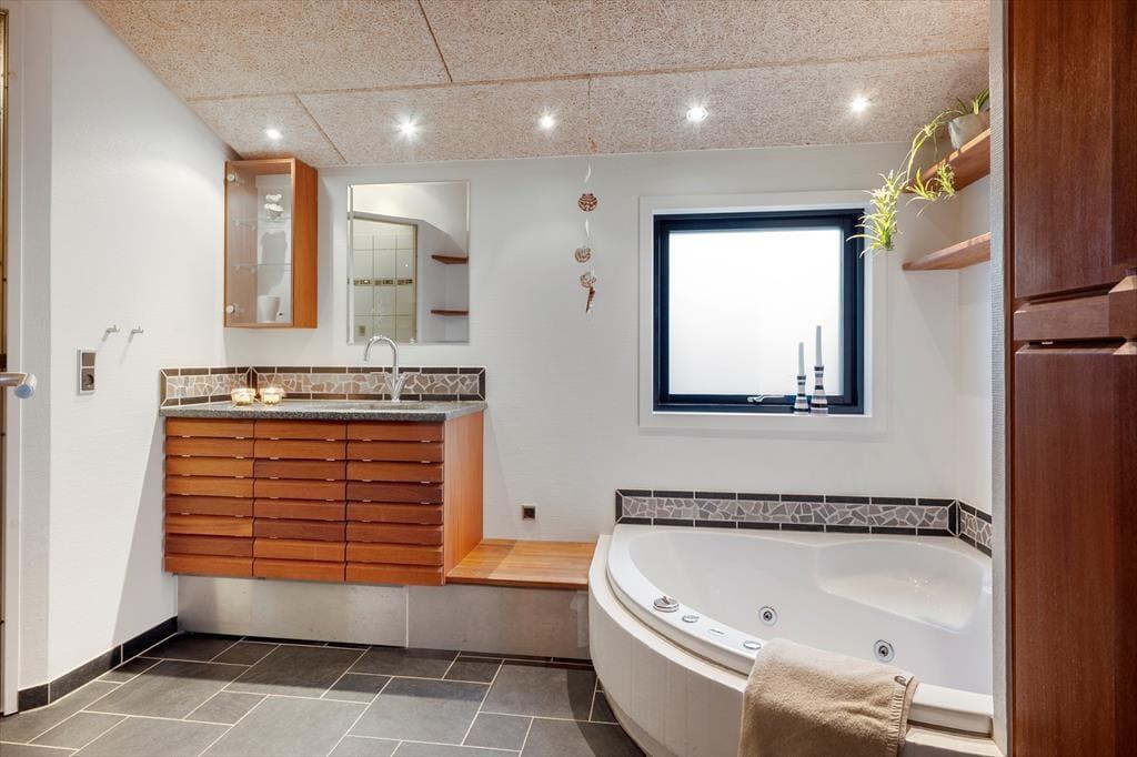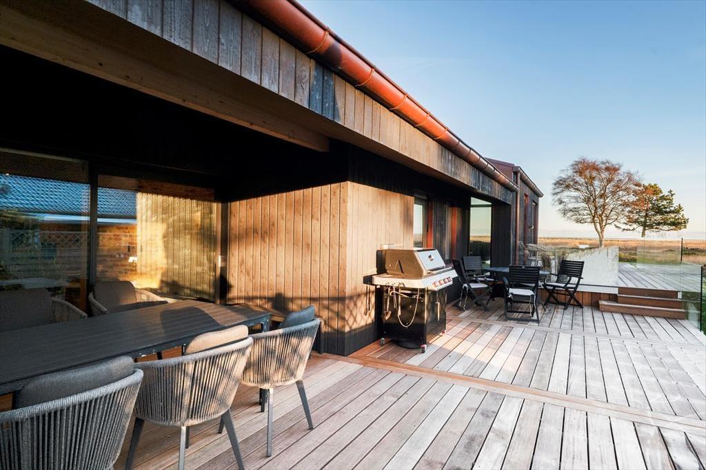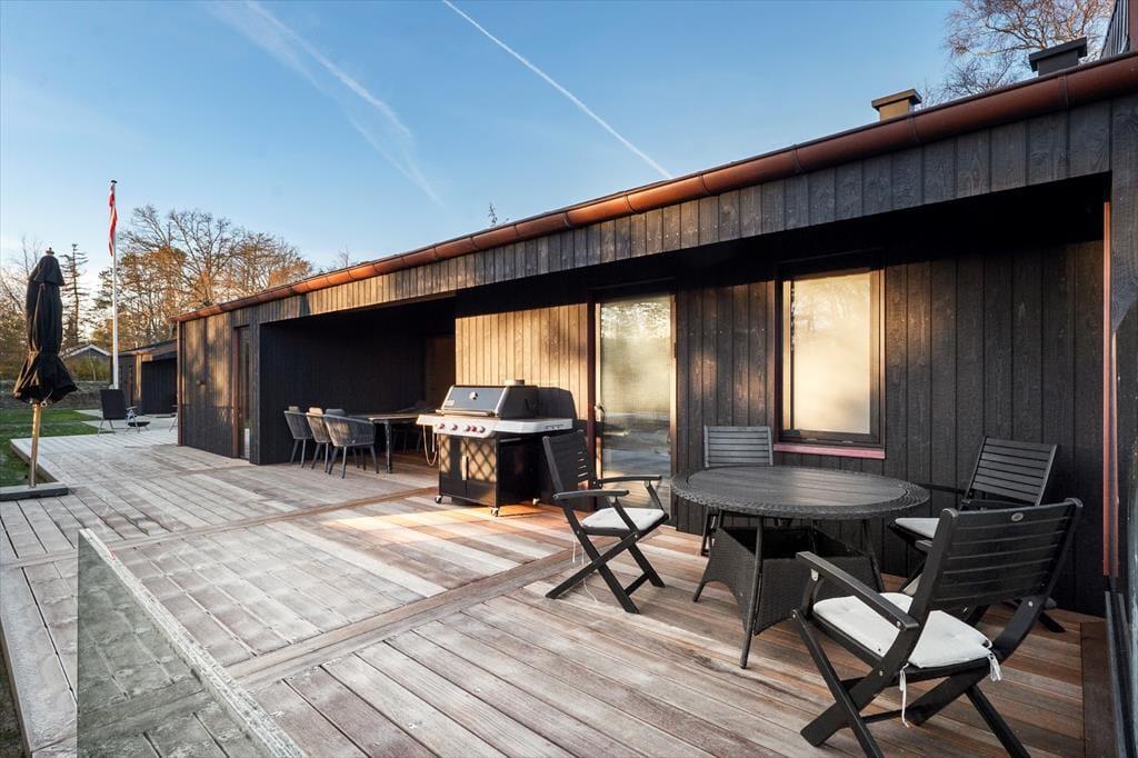 Udelivet får helt perfekte rammer her, for en stor træterrasse omkranser huset og fortsætter ud i et flot flisebelagt terrasseområde, der binder hovedhus og gæstehus sammen. Det gør det nemt at lade ferien flyde frit mellem fælles hygge og små pauser i solen – uanset om I samles til morgenmad under åben himmel eller finder hver jeres favoritplads med læ og varme. Når mørket falder på, venter endnu et højdepunkt: udespaen, der nærmest kalder på stjerneklare aftener med ro i kroppen og salt i luften. Og med en udebruser lige ved hånden kan du skylle sand og havvand af, inden du glider ned i det varme vand – eller tage en frisk skyller, når du kommer tilbage fra stranden. Her er det let at mærke, at ferien foregår udendørs så meget som muligt, præcis som den bør ved Kattegat.