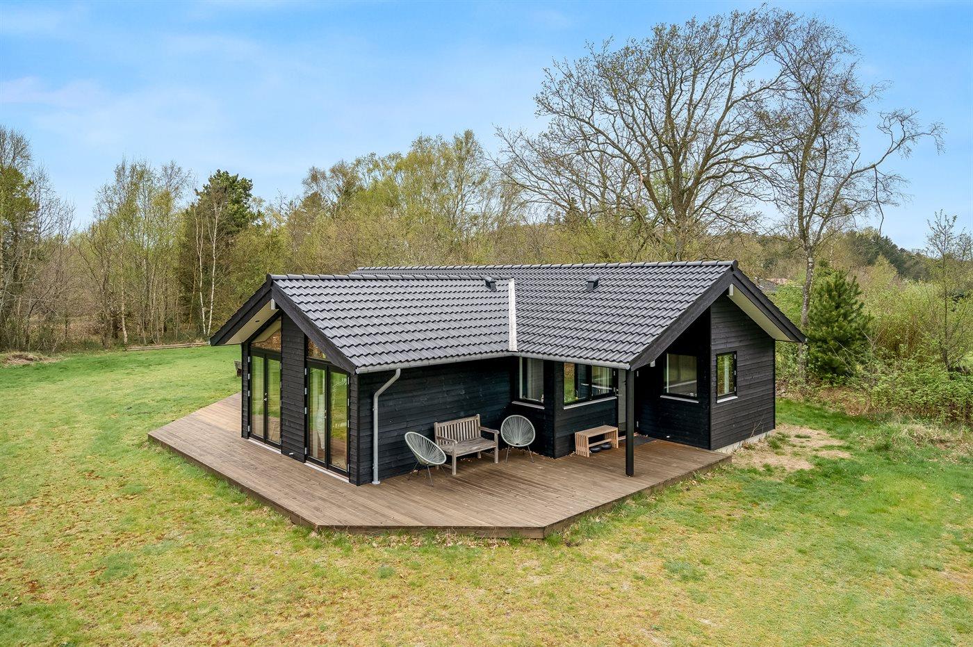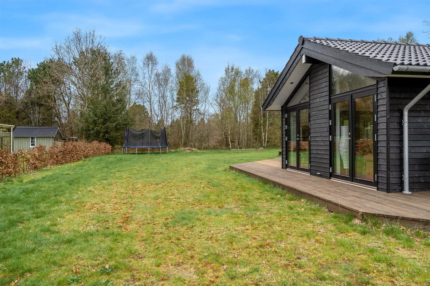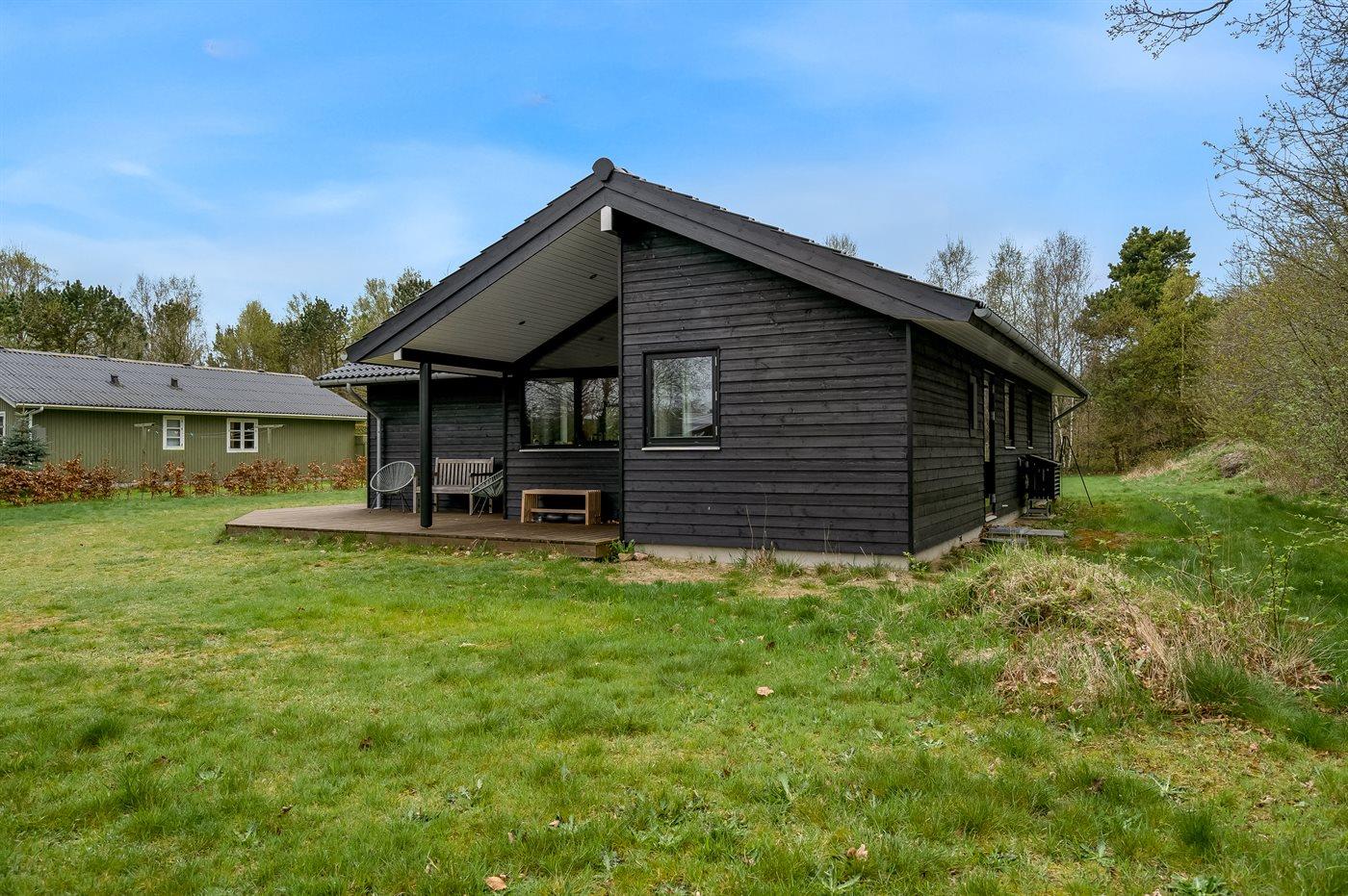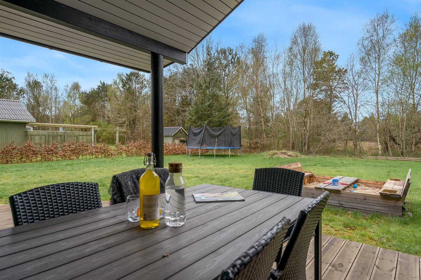 The holiday home is situated on a 1300 m² garden site. Situated 1500 m from the sea. Situated 7500 m from inlet. Nearest shop is 890 m away. You will find a golf course in a distance of 6400 m. A terrace belong to the holiday home. Furthermore the house has a covered terrace. Sandbox. Trampoline.Fire place. Barbecue at your disposal. Parking place by the holiday home.