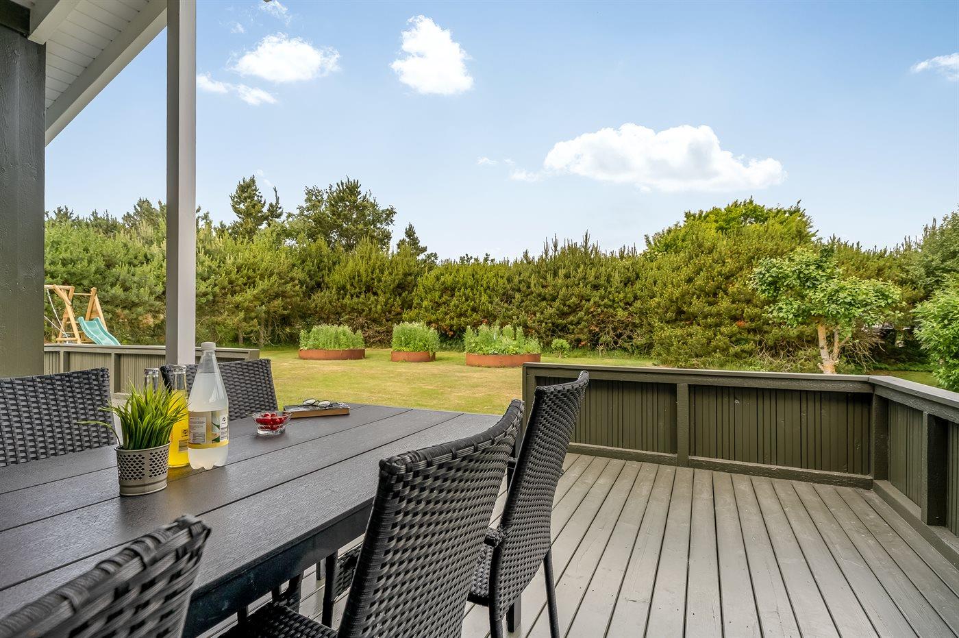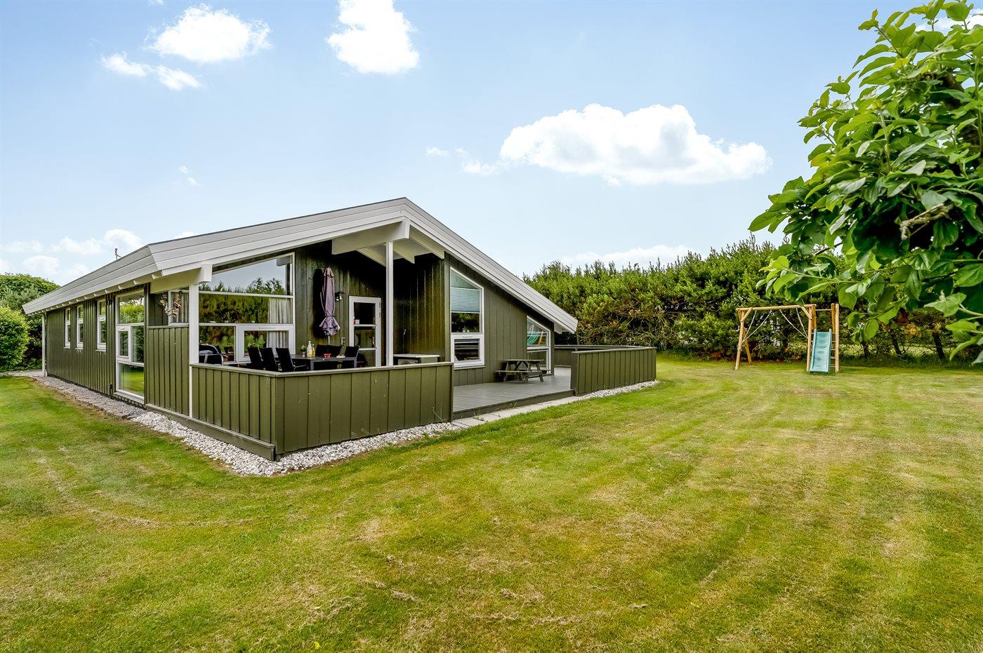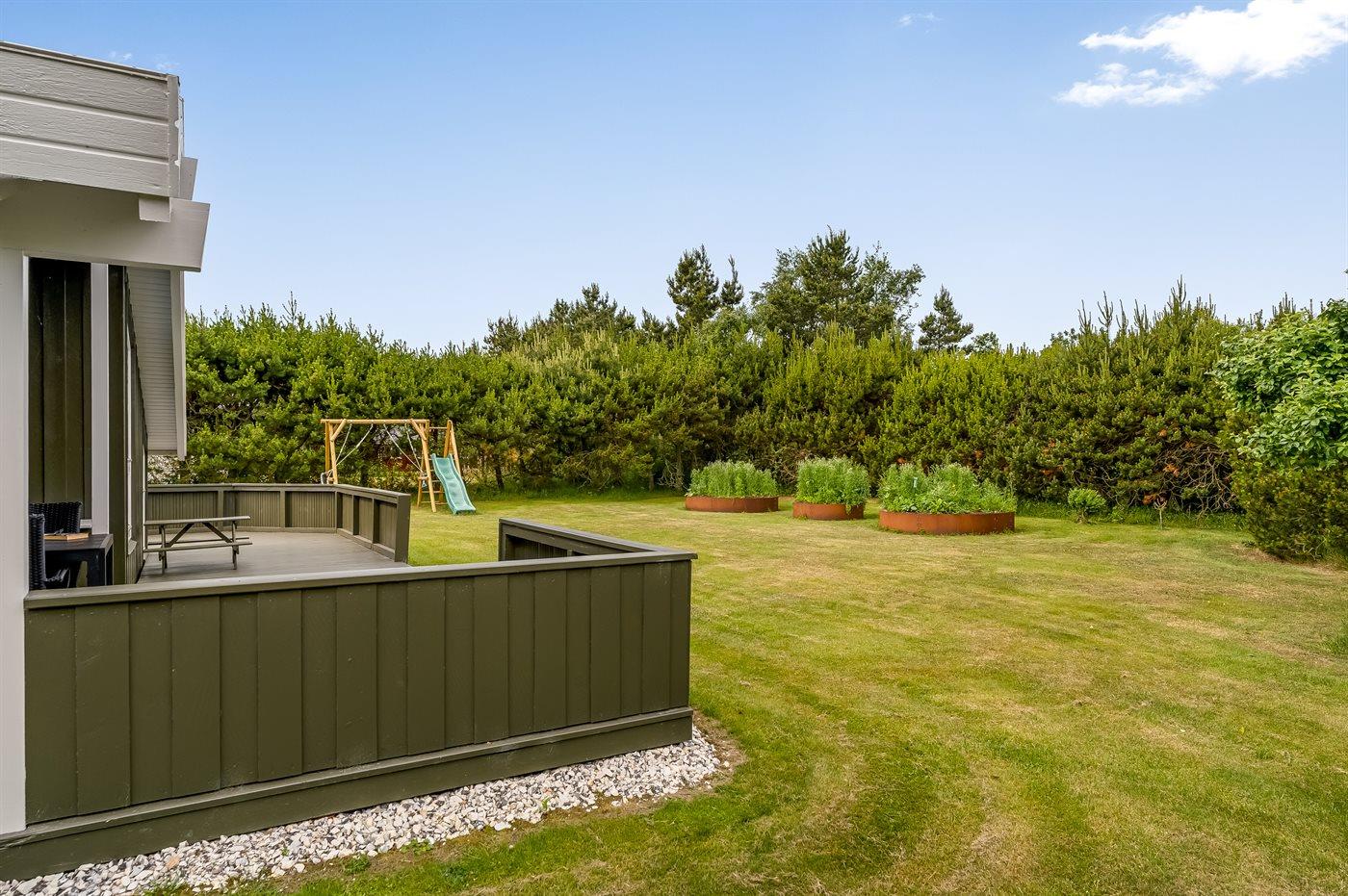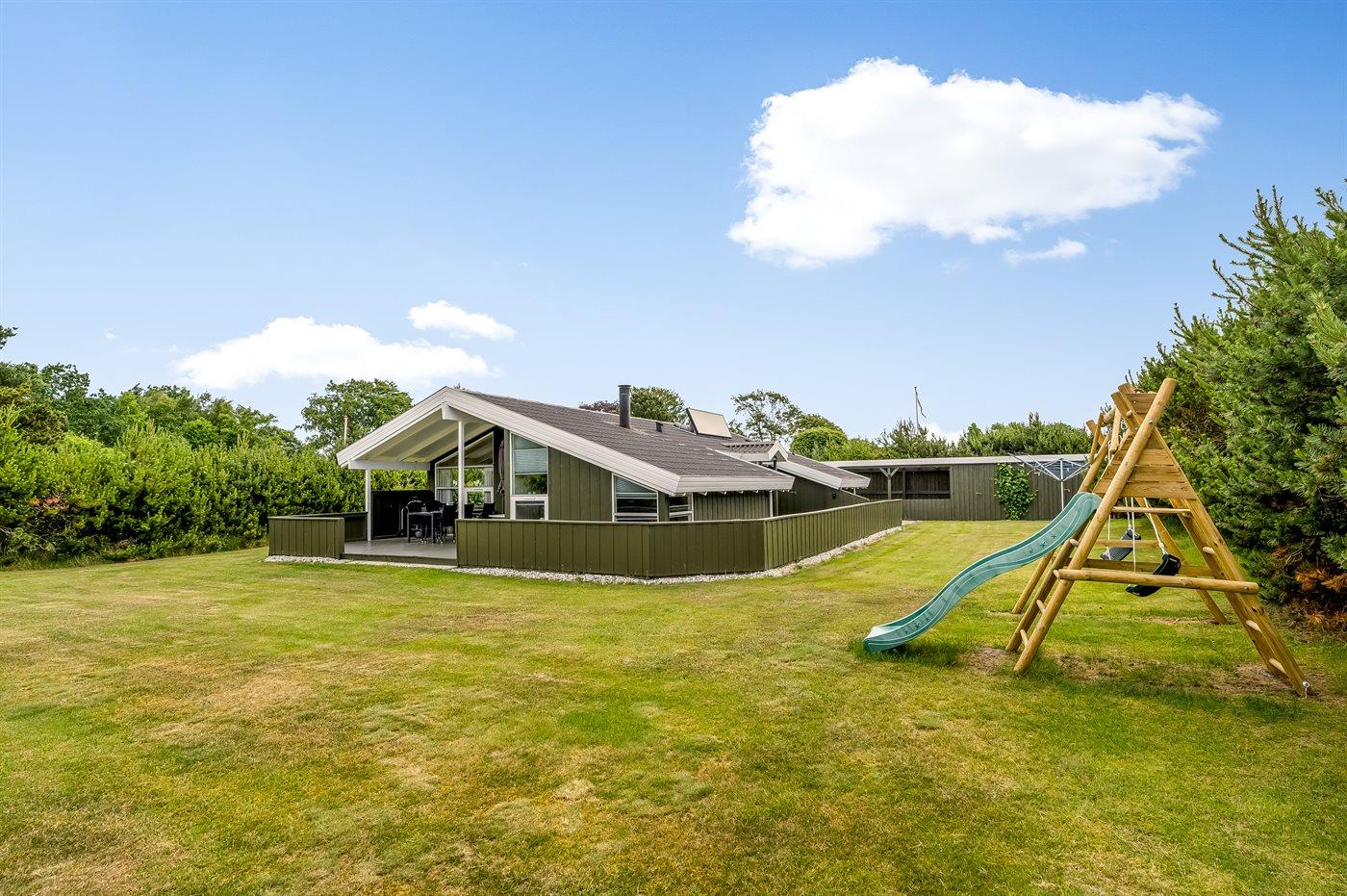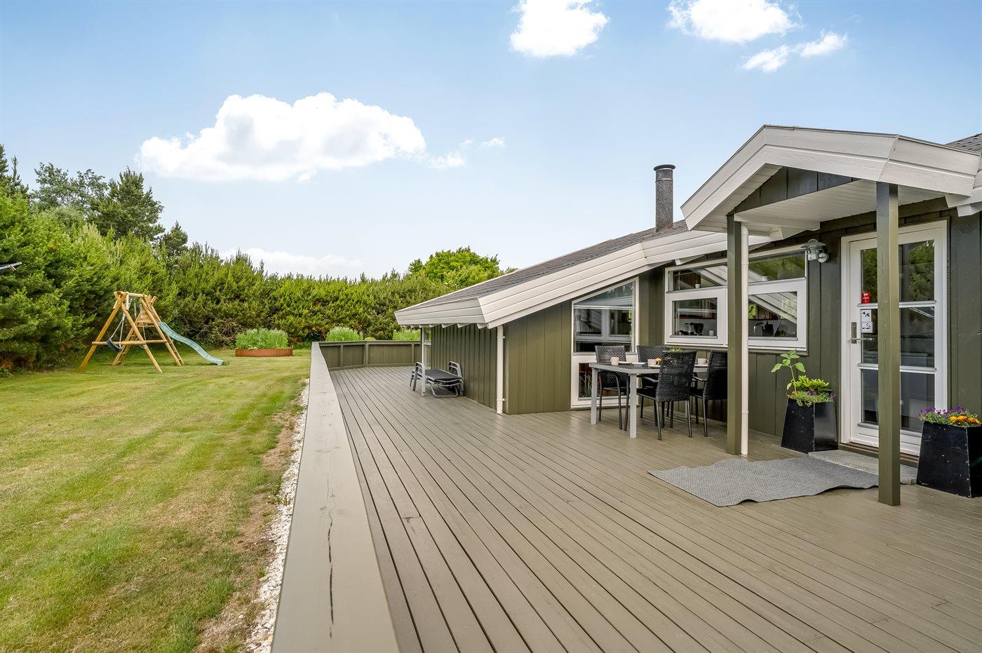The holiday home is situated on a 1252 m² garden site. Situated 200 m from the sea. Situated 7300 m from inlet. Nearest shop is 600 m away. You will find a golf course in a distance of 5400 m. A terrace belong to the holiday home. Furthermore the house has a covered terrace. Swing. Slide. Barbecue at your disposal. Parking place by the holiday home.