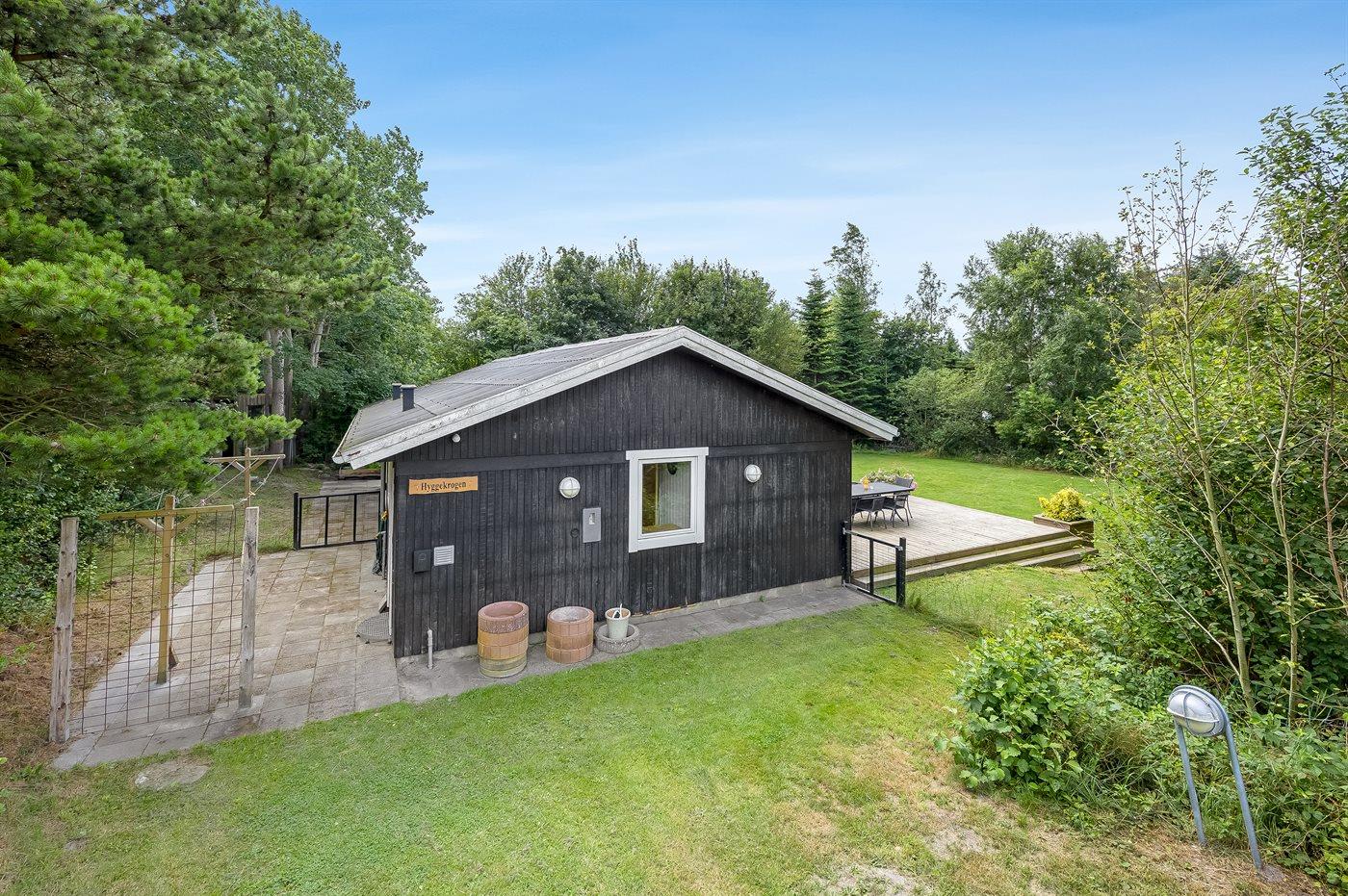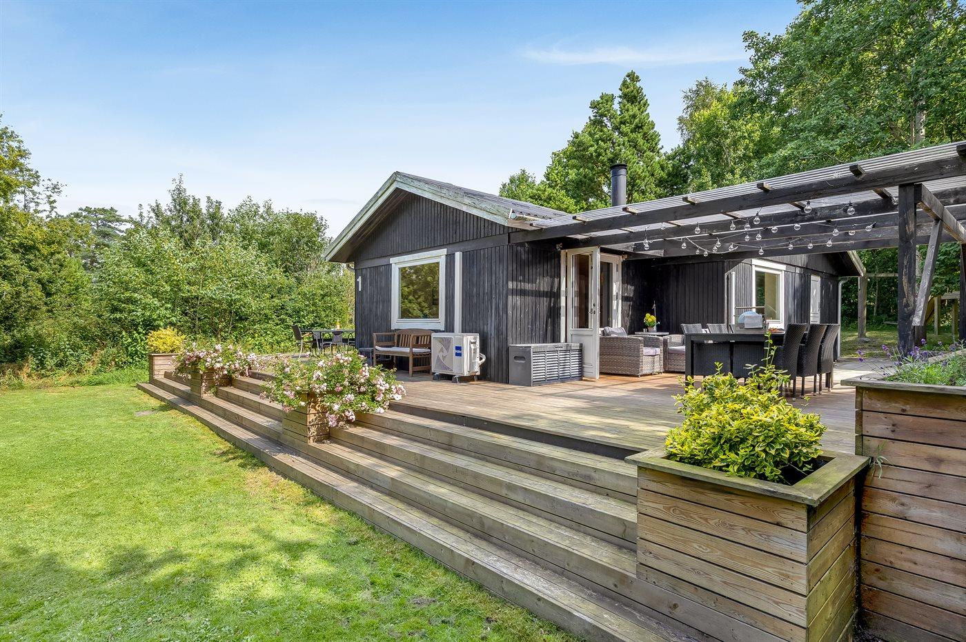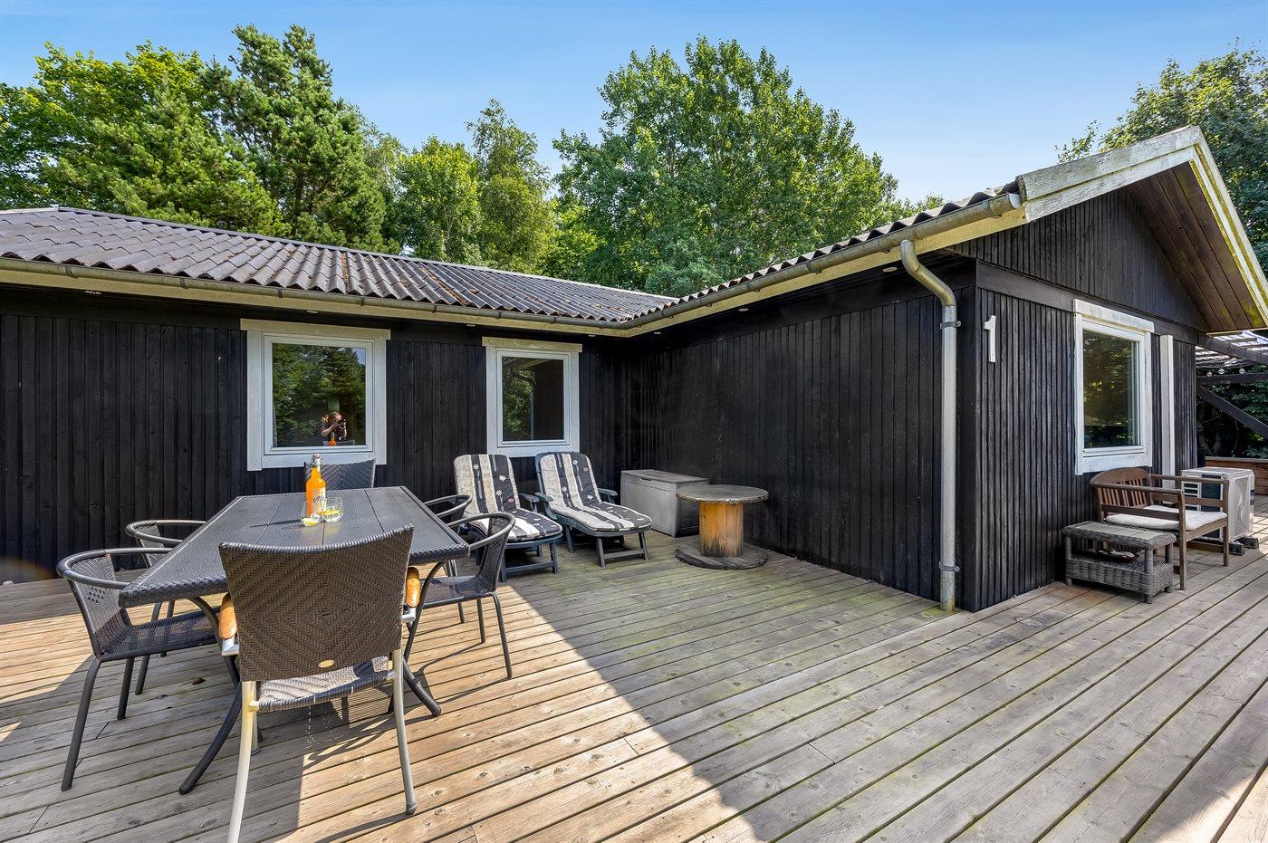 The holiday home is situated on a 1180 m² natural site. The site is fenced in. Situated 1300 m from the sea. Situated 6700 m from inlet. Nearest shop is 1300 m away. You will find a golf course in a distance of 5500 m. A terrace belong to the holiday home. Furthermore the house has a covered terrace. Swing. Sandbox. Trampoline. Play tower. Slide. Barbecue at your disposal. Plug for charging electric car is available. Charging socket type 2. With 11 kW power output. Parking place by the holiday home.