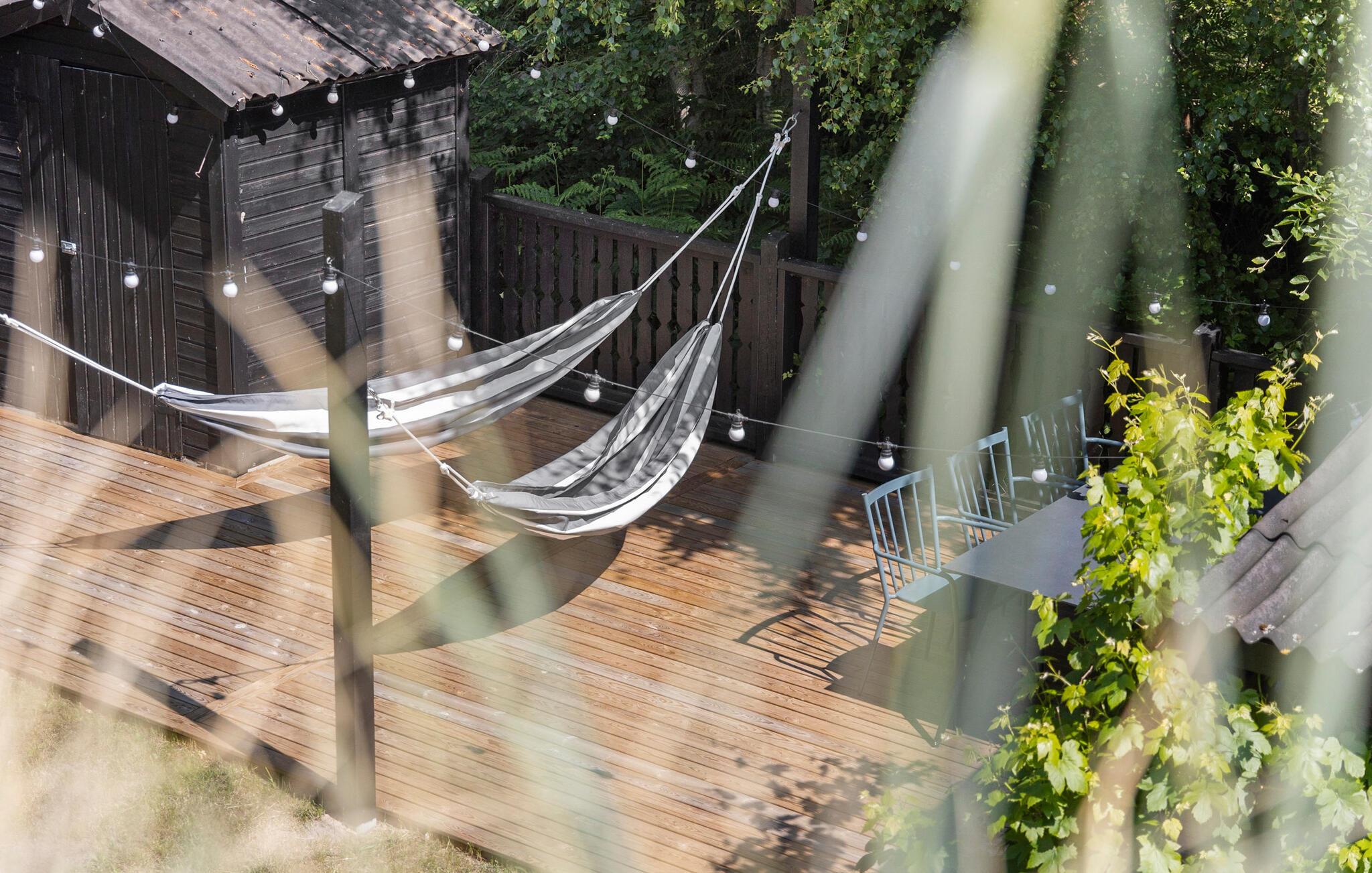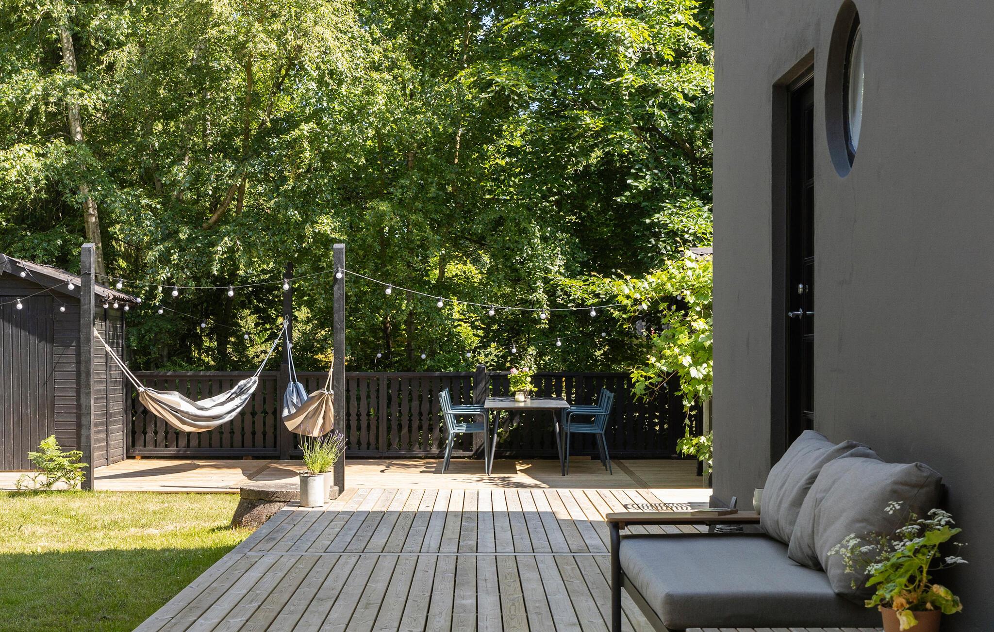 Treten Sie hinaus auf die großzügige Holzterrasse, die sich fast um das gesamte Haus zieht. Nehmen Sie Ihr Frühstück unter freiem Himmel ein oder entspannen Sie in einem der bequemen Loungesessel. Auf der Dachterrasse können Sie sich mit einem kühlen Getränk zurückziehen, während ringsum die Bäume rauschen.