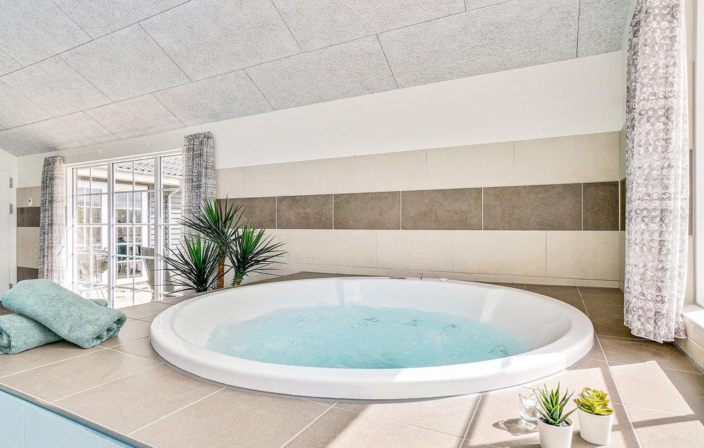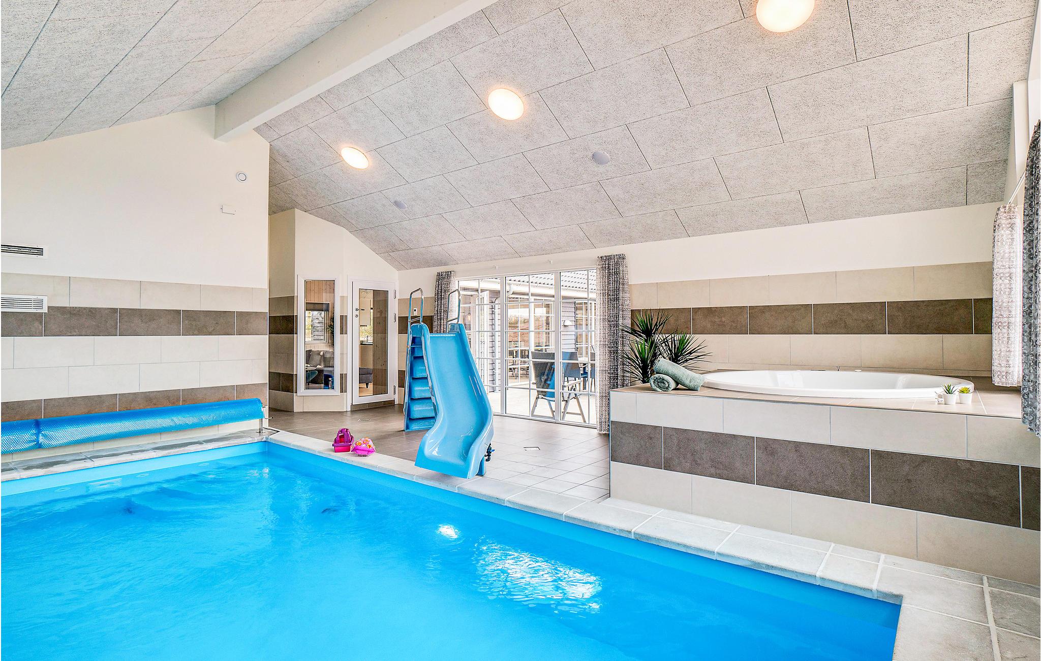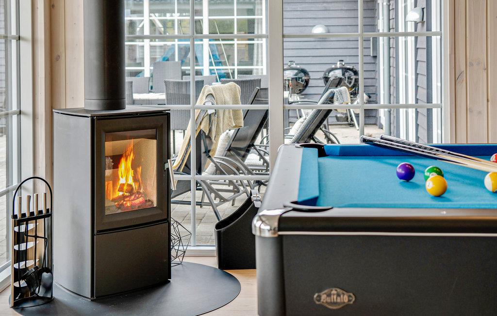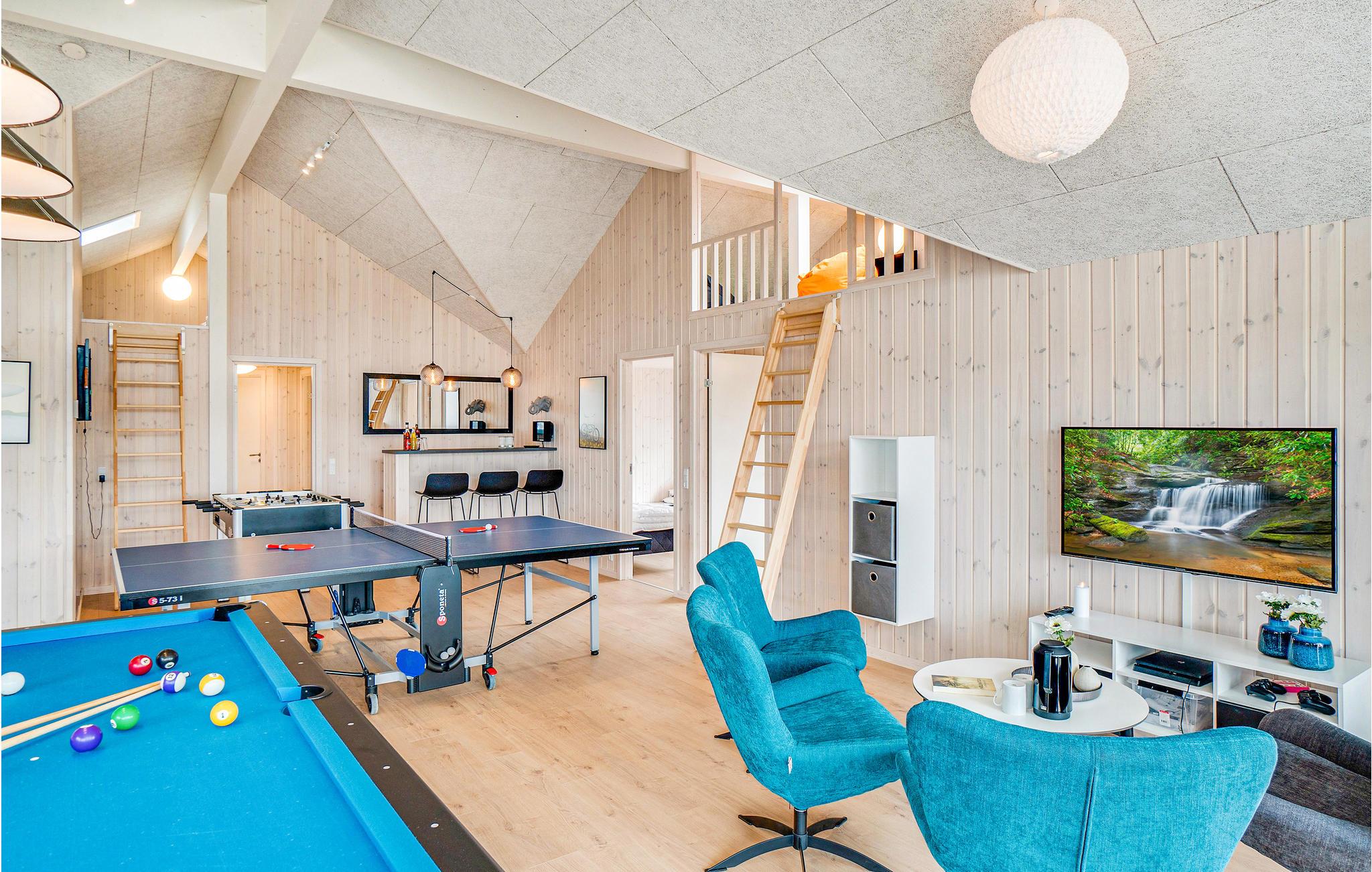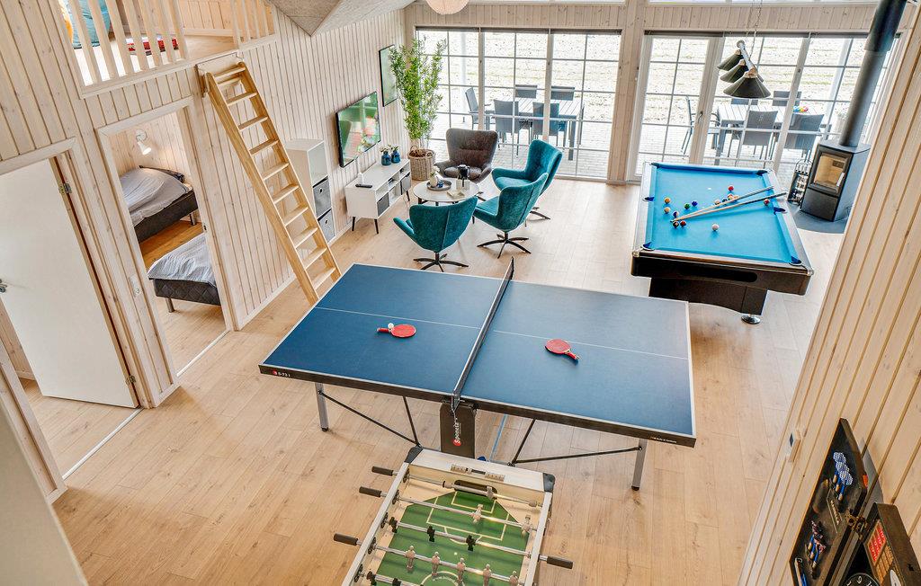 Das Haus befindet sich inmitten des schönen Ferienhausgebietes von Houstrup. Hier bekommen Sie ein komplettes Urlaubserlebnis, egal ob Sie sich entspannen oder aktiv sein wollen. Wenn Sie einen aktiven Urlaub wünschen, hat das Ferienhaus viel in Bezug auf Indoor-Aktivitäten zu bieten. Der Aktivitätsraum umfasst Billard, Tischtennis und Tischfußball. An der Bar in der Ecke können die Zuschauer ein kühles Getränk genießen. Im hauseigenen Wasserpark können Sie den Pool mit Wasserrutsche, Schwimmtrainer, großem Whirlpool mit Platz für 4-6 Personen und Sauna genießen. Die schöne, moderne Küche ist stilvoll eingerichtet und ausgestattet und hat eine direkte Verbindung zum Wohnzimmer, wo Sie auch den Essbereich mit Platz für alle Gäste des Hauses finden.