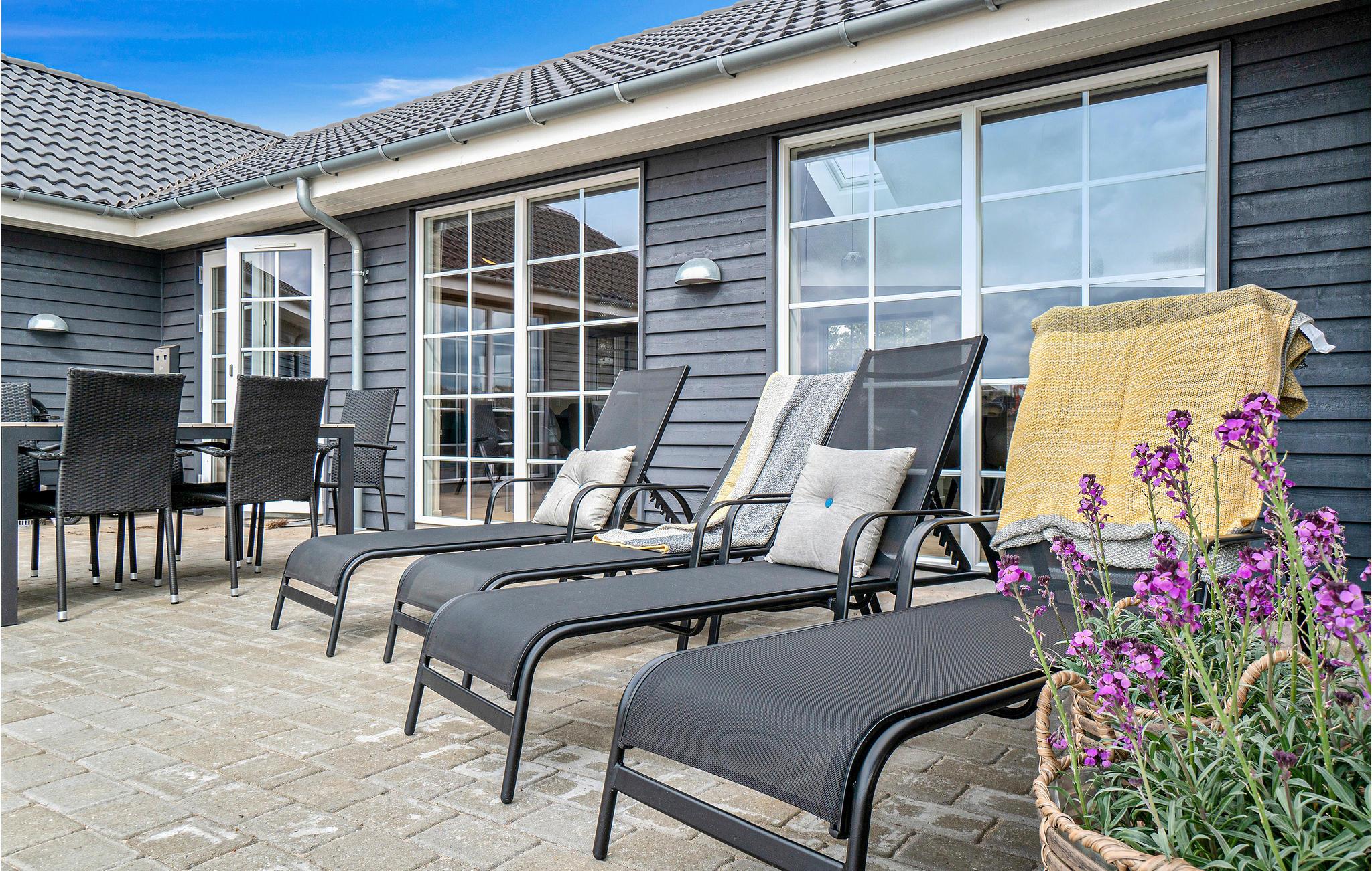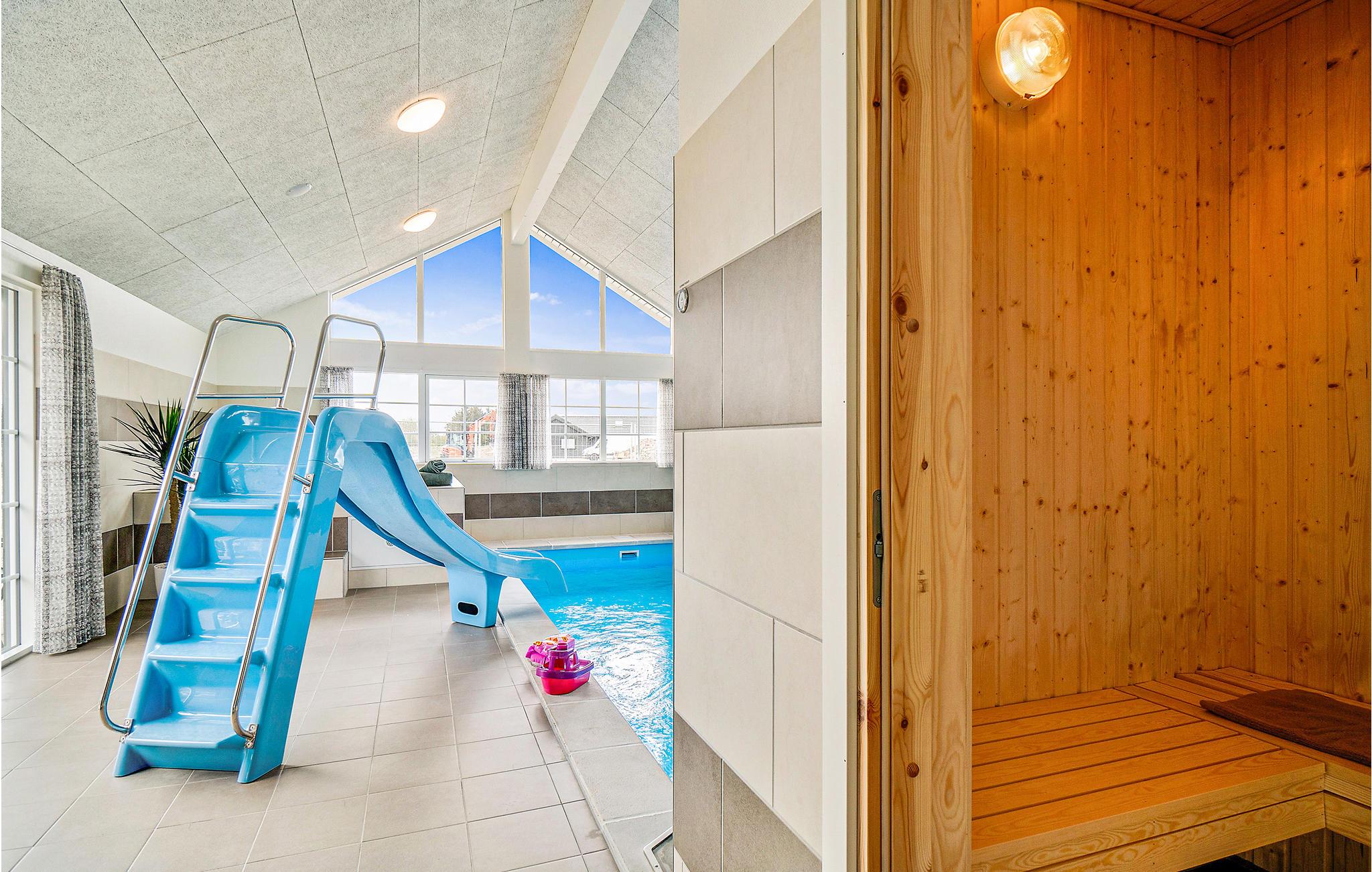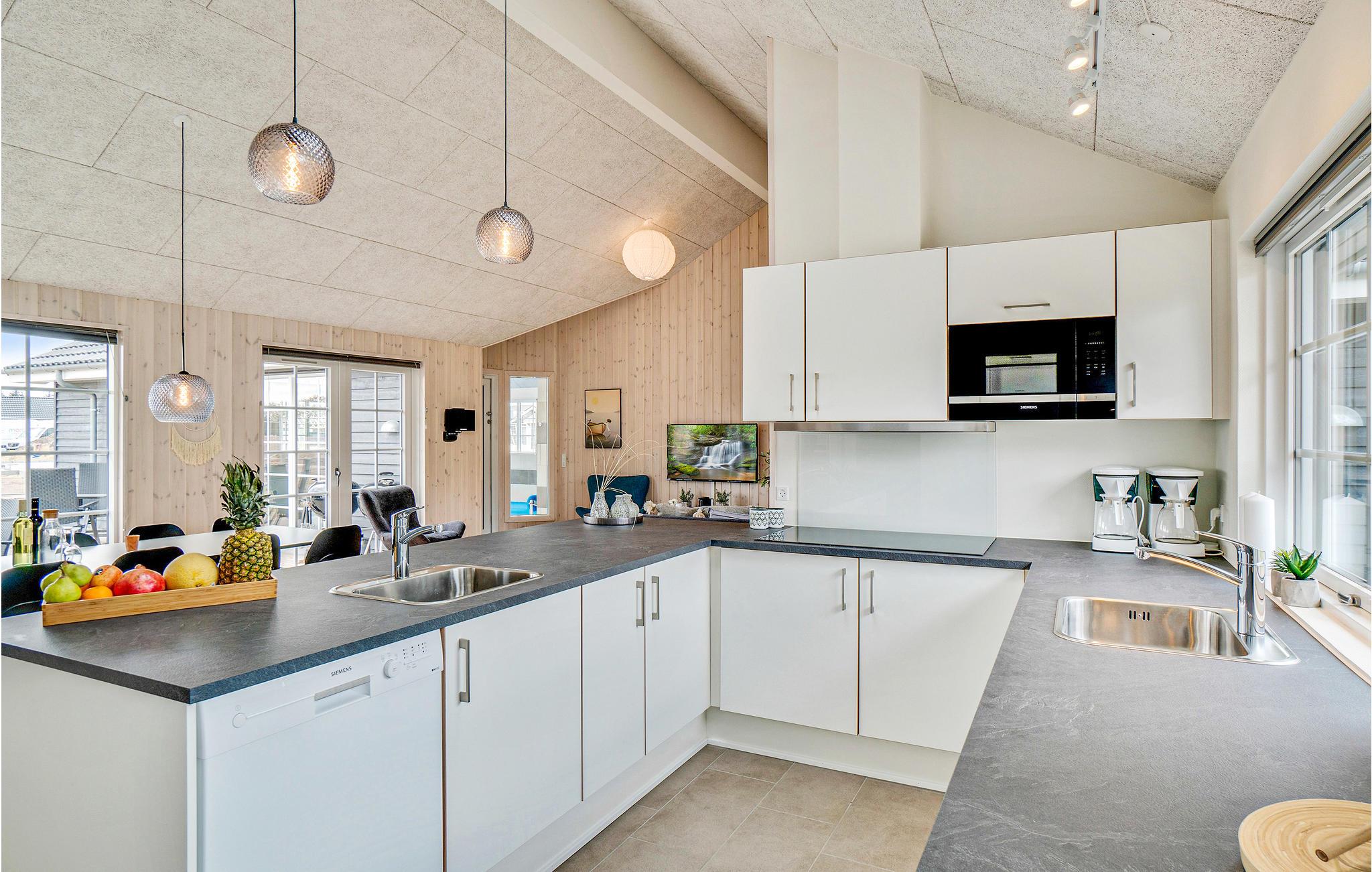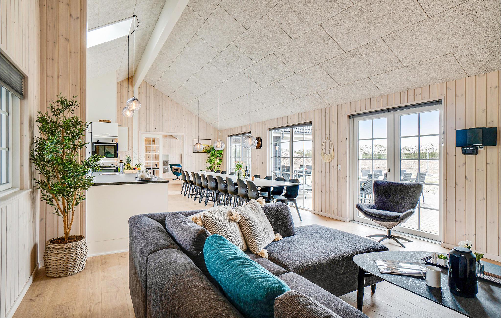 Das Haus befindet sich inmitten des schönen Ferienhausgebietes von Houstrup. Hier bekommen Sie ein komplettes Urlaubserlebnis, egal ob Sie sich entspannen oder aktiv sein wollen. Wenn Sie einen aktiven Urlaub wünschen, hat das Ferienhaus viel in Bezug auf Indoor-Aktivitäten zu bieten. Der Aktivitätsraum umfasst Billard, Tischtennis und Tischfußball. An der Bar in der Ecke können die Zuschauer ein kühles Getränk genießen. Im hauseigenen Wasserpark können Sie den Pool mit Wasserrutsche, Schwimmtrainer, großem Whirlpool mit Platz für 4-6 Personen und Sauna genießen. Die schöne, moderne Küche ist stilvoll eingerichtet und ausgestattet und hat eine direkte Verbindung zum Wohnzimmer, wo Sie auch den Essbereich mit Platz für alle Gäste des Hauses finden.