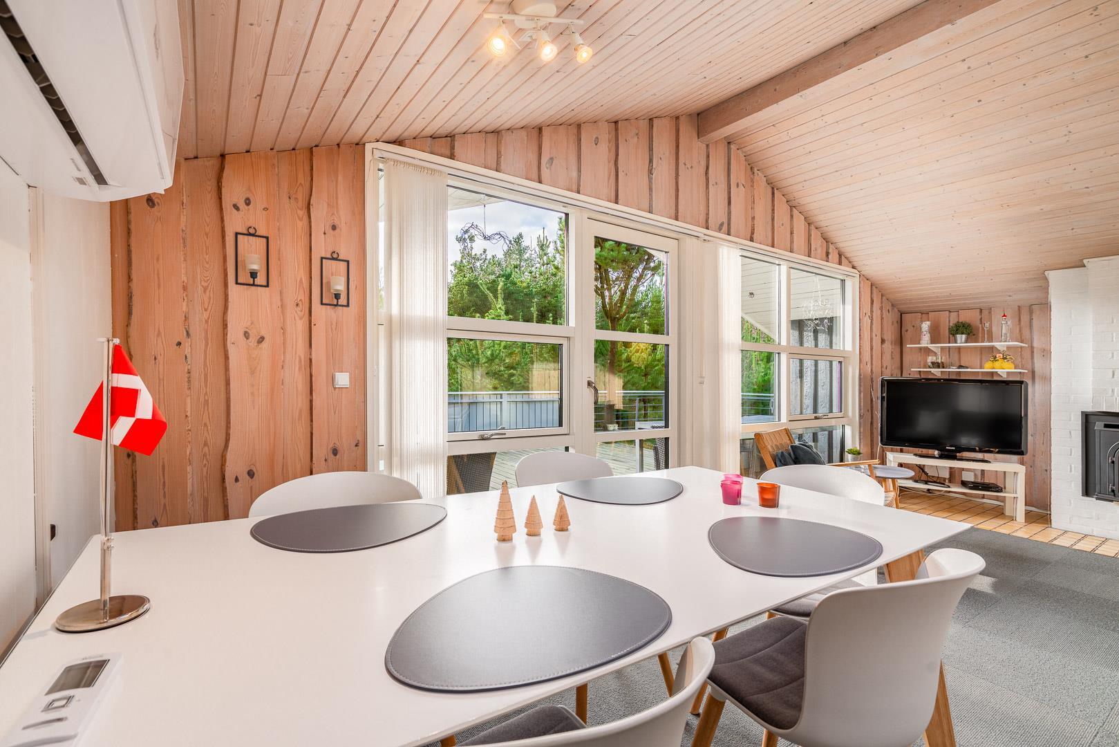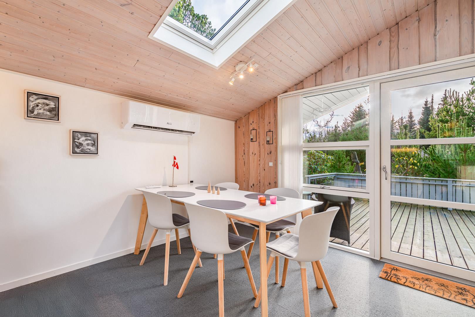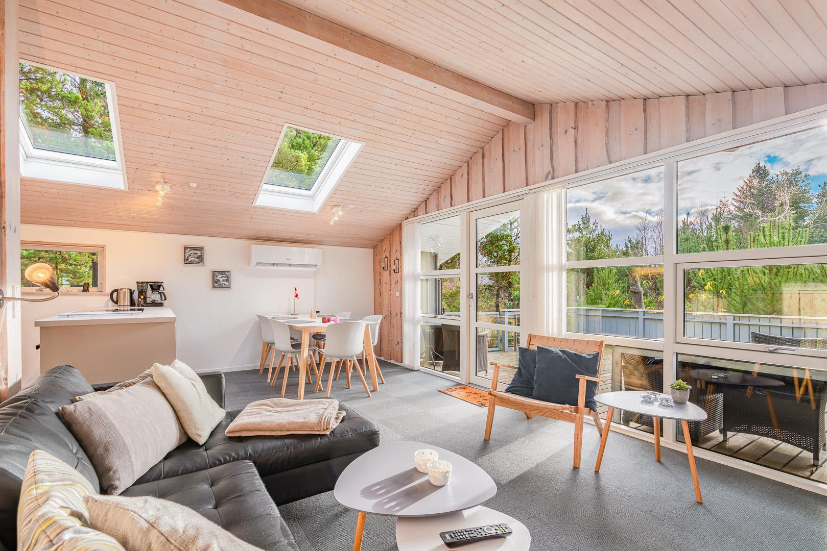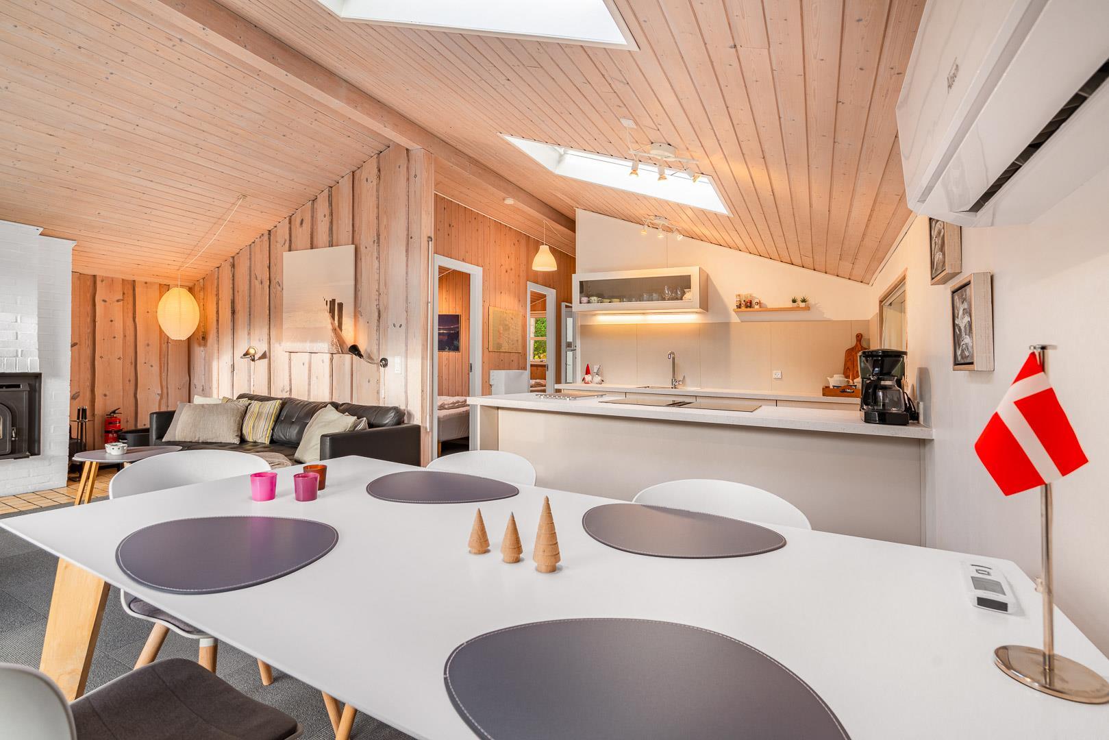 Im Inneren des Hauses sorgen große Fensterflächen und Dachfenster den ganzen Tag über für wunderbares Licht. Es bietet Platz für 4 Personen, verteilt auf ein Schlafzimmer mit Doppelbett (140 x 200 cm) und ein Zimmer mit zwei Einzelbetten (90 x 200 cm, eines davon als Ausziehbett) – ideal für die Kinder.