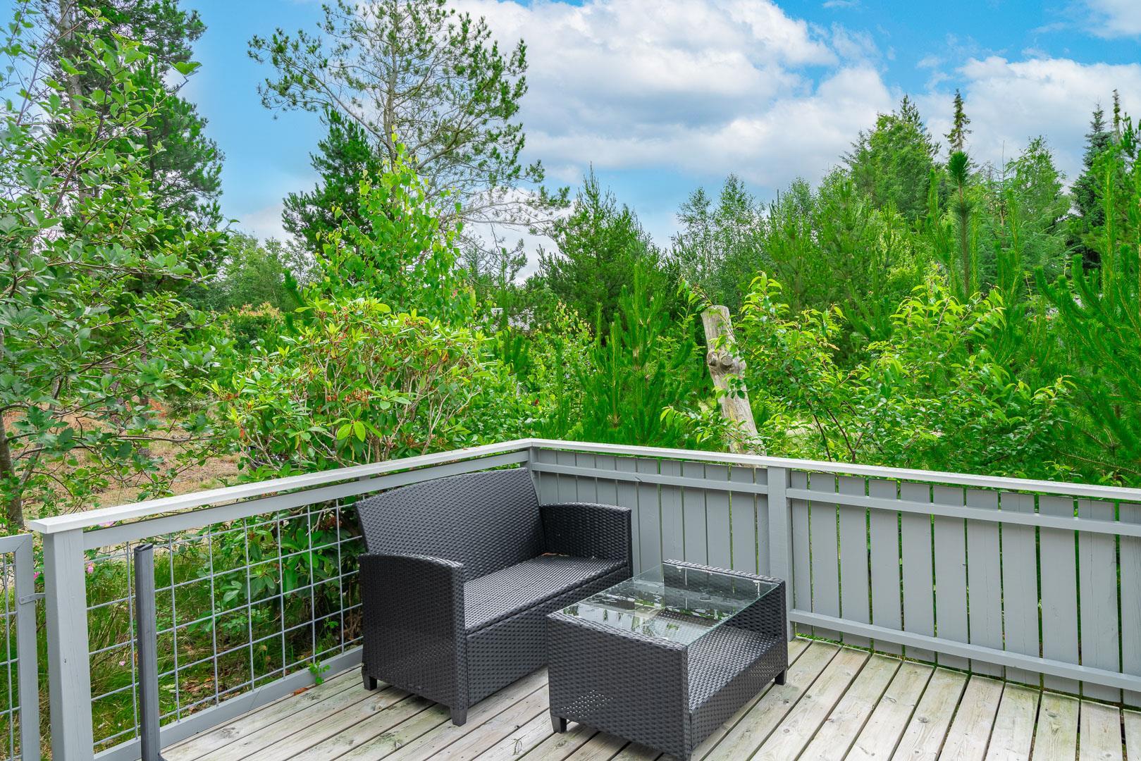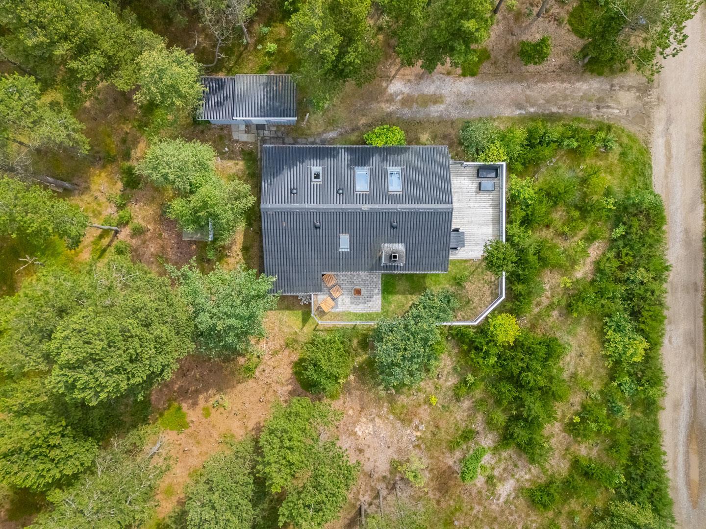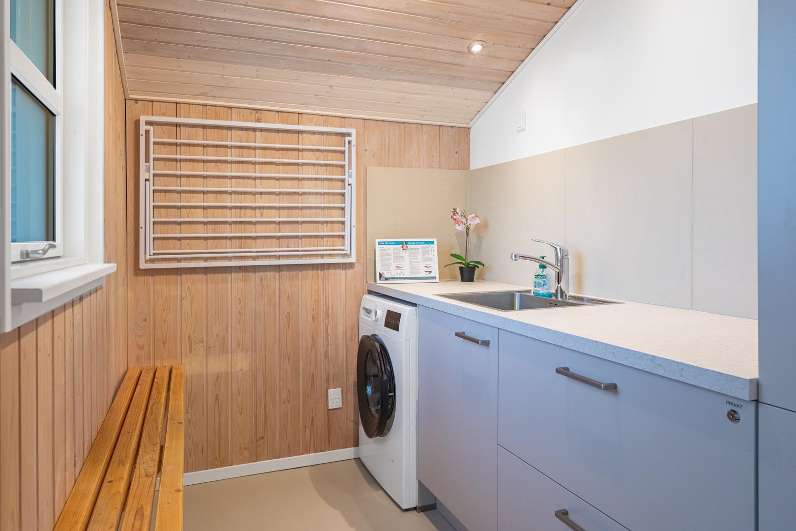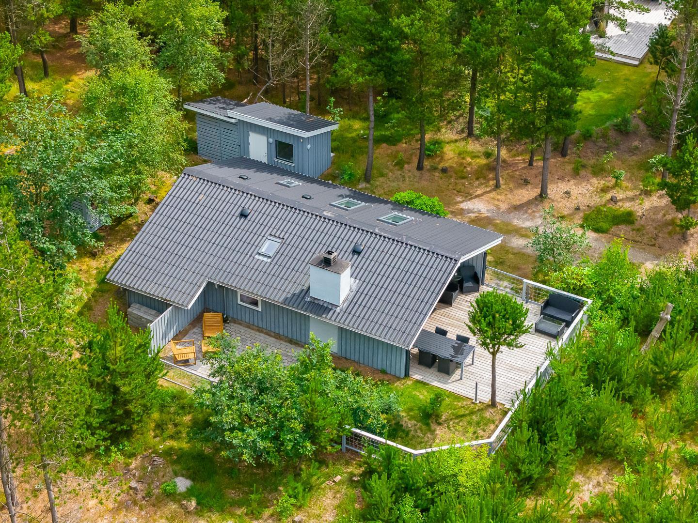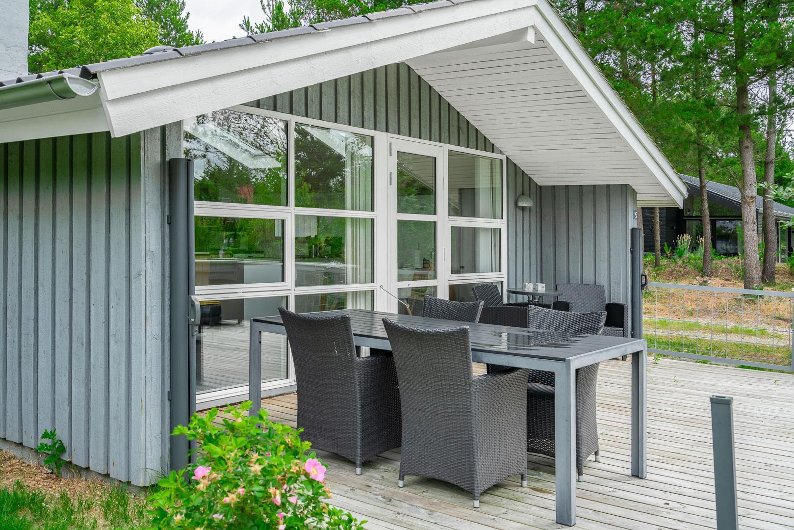 Im Inneren des Hauses sorgen große Fensterflächen und Dachfenster den ganzen Tag über für wunderbares Licht. Es bietet Platz für 4 Personen, verteilt auf ein Schlafzimmer mit Doppelbett (140 x 200 cm) und ein Zimmer mit zwei Einzelbetten (90 x 200 cm, eines davon als Ausziehbett) – ideal für die Kinder.